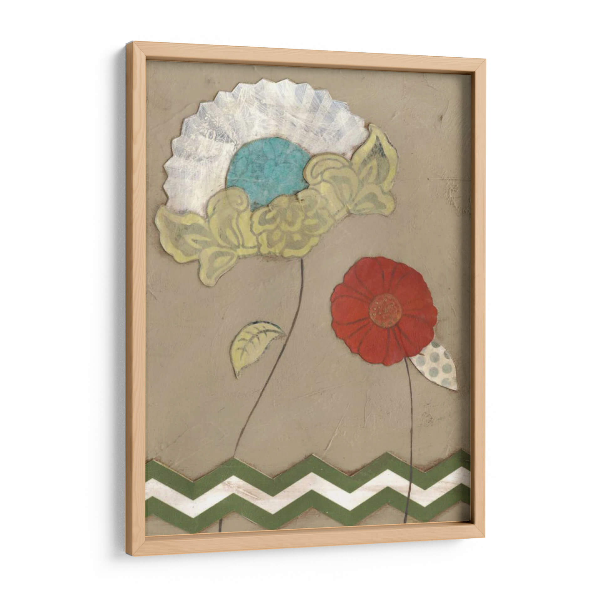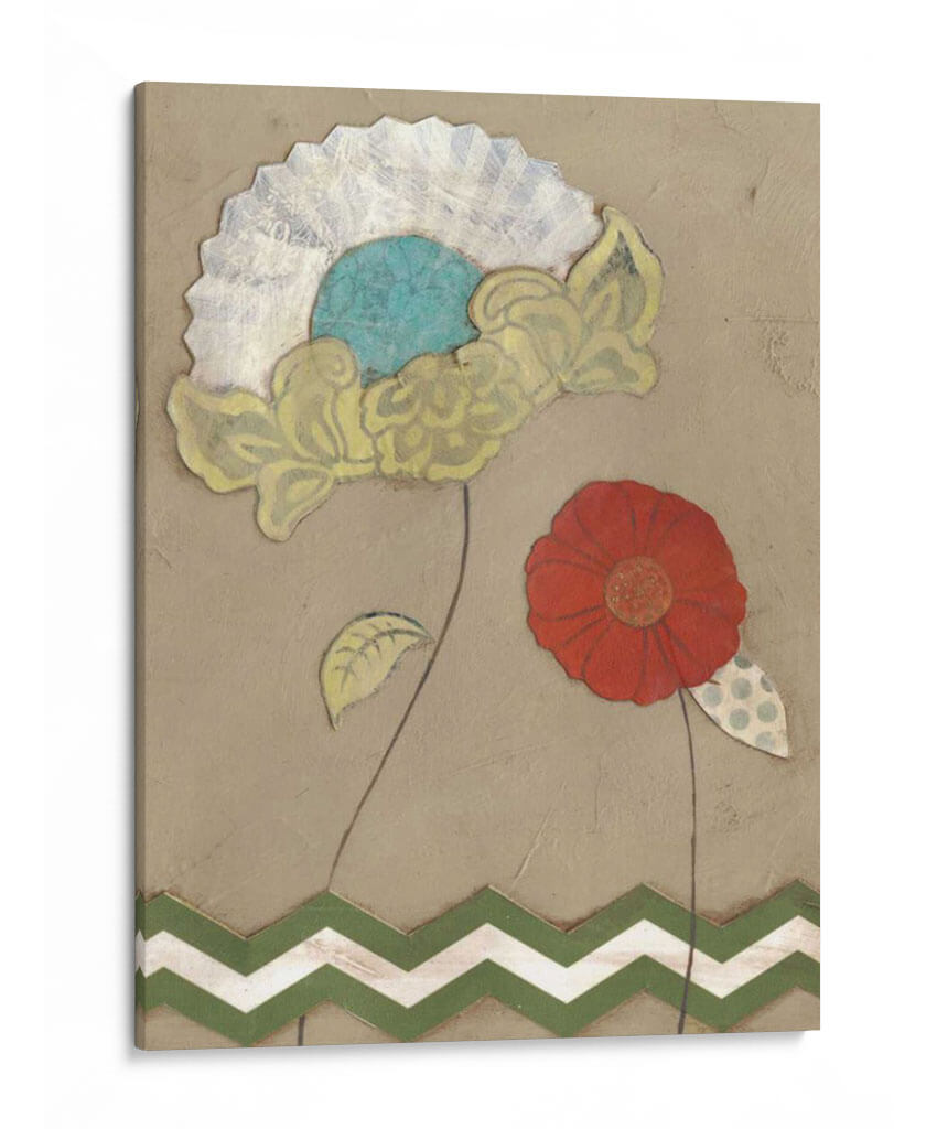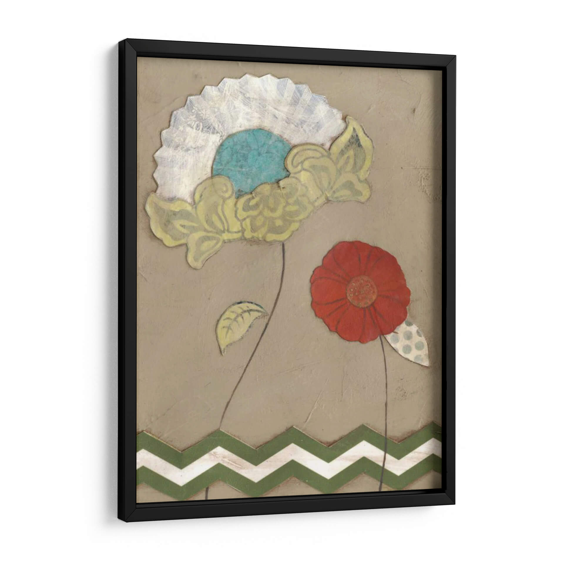 Descubre la serenidad y el encanto floral con "Patrones De Pétalos Vi", una obra de arte contemporáneo de June Erica Vess. Este cautivador cuadro decorativo presenta un diseño delicado con dos flores estilizadas sobre un fondo texturizado en tonos tierra. La flor principal, de gran tamaño, despliega pétalos en tonos amarillos y blancos, coronada por un vibrante centro azul turquesa que añade un toque de frescura. A su lado, una flor más pequeña en un audaz color rojo captura la mirada, contrastando bellamente con las sutiles hojas y el fondo neutro. La base de la composición se adorna con un moderno patrón de zigzag en verde y blanco, aportando un dinamismo inesperado. El estilo de la obra, que combina elementos de collage y pintura, crea una textura visual rica y una sensación de profundidad, evocando la delicadeza de la naturaleza con un giro moderno. "Patrones De Pétalos Vi" es ideal para añadir un toque de color y sofisticación a cualquier espacio, desde un salón acogedor hasta un estudio de trabajo o un dormitorio tranquilo. Su paleta de colores y su composición armoniosa la convierten en una pieza versátil, perfecta para quienes buscan infundir calma y belleza en su hogar. Transforma tus paredes con este hermoso cuadro decorativo que celebra la forma y el color de las flores de una manera única y artística.