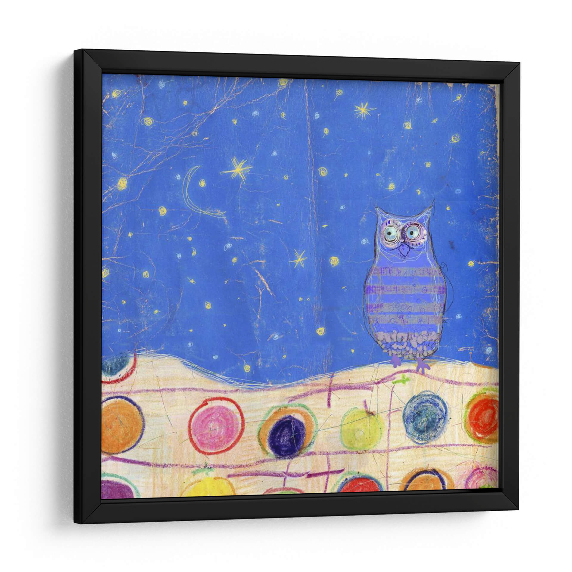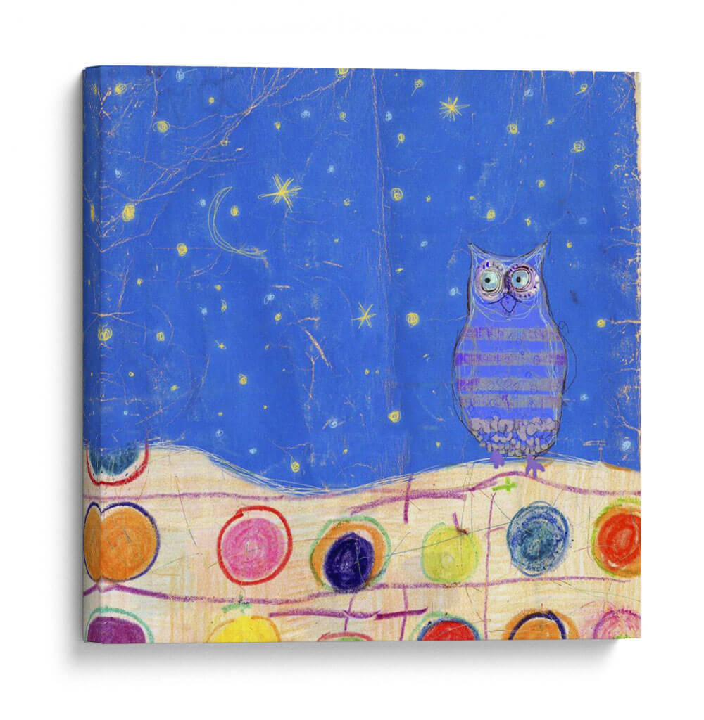 Sumérgete en la magia nocturna con "Plumas, Puntos Y Rayas Ii", una obra de arte cautivadora de Ingrid Blixt. Este cuadro decorativo presenta un búho de mirada intensa posado sobre un paisaje estrellado de ensueño, con una paleta de colores vibrantes que ilumina la oscuridad. El fondo azul profundo, salpicado de estrellas amarillas y una luna creciente, crea una atmósfera mística y serena. Debajo, una hilera de círculos multicolores, que evocan frutas o gemas, añade un toque lúdico y contemporáneo a la composición. El estilo distintivo de Blixt, que mezcla elementos figurativos con texturas y patrones abstractos, dota a la pieza de una originalidad cautivadora. Ideal para añadir un toque de fantasía y color a cualquier habitación, este cuadro es perfecto para despachos creativos, dormitorios infantiles o salas de estar modernas que buscan una pieza única que invite a la contemplación y la imaginación. Descubre la delicadeza y la profundidad de esta pieza que transformará tu espacio en un rincón de ensueño, lleno de carácter y estilo.