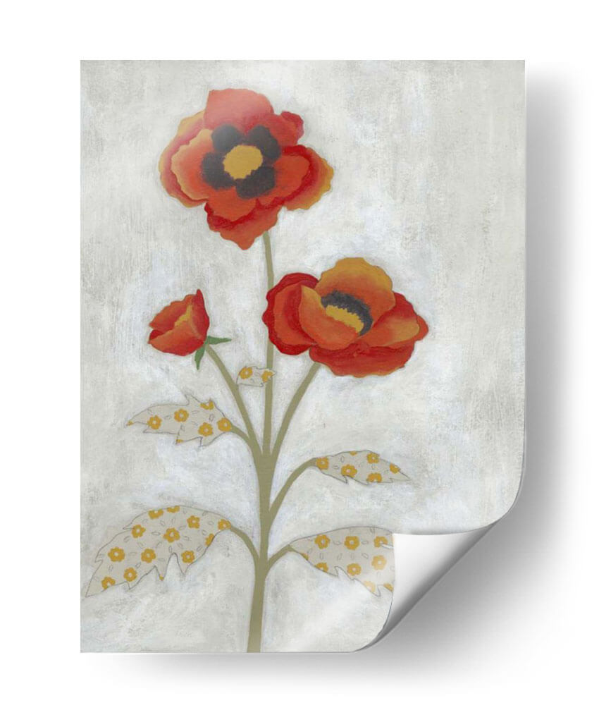 Embellece tu hogar con la vibrante obra "Preciosa Ivotánica Iv" de Vanna Lam. Este cuadro decorativo captura la belleza de las amapolas rojas y naranjas con un toque artístico único, presentando pétalos detallados y centros oscuros y dorados que invitan a la contemplación. El fondo neutro y texturizado, de un gris suave y desgastado, realza la viveza de las flores y su tallo estilizado. Las hojas, con un delicado patrón floral en tonos amarillos y grises, añaden una capa adicional de intriga y diseño. La composición se centra en tres flores principales, dos completamente abiertas y una en capullo, creando una sensación de crecimiento y vitalidad. El estilo artístico es una mezcla encantadora de lo figurativo con toques de arte popular o collage, lo que le confiere una personalidad distintiva y contemporánea. Ideal para espacios que buscan un acento de color y calidez, como salas de estar, comedores o incluso oficinas que desean un toque de naturaleza estilizada. "Preciosa Ivotánica Iv" no es solo una pieza de arte, sino una invitación a la alegría y la serenidad, aportando un ambiente fresco y sofisticado a cualquier rincón. Descubre la magia de las flores a través de la visión de Vanna Lam y transforma tu decoración con esta pieza excepcional de arte floral moderno.