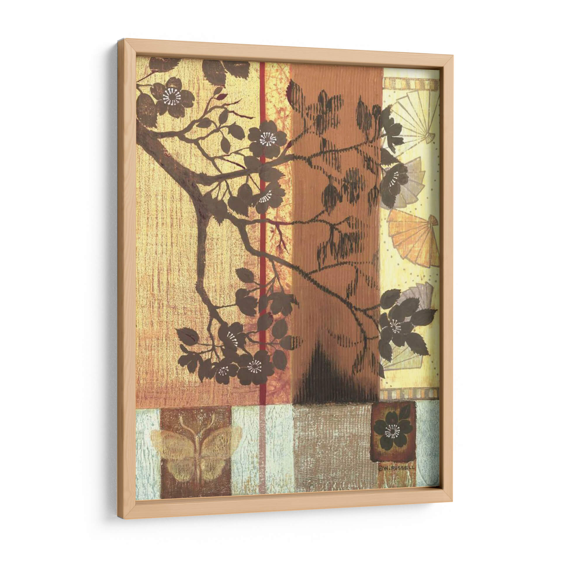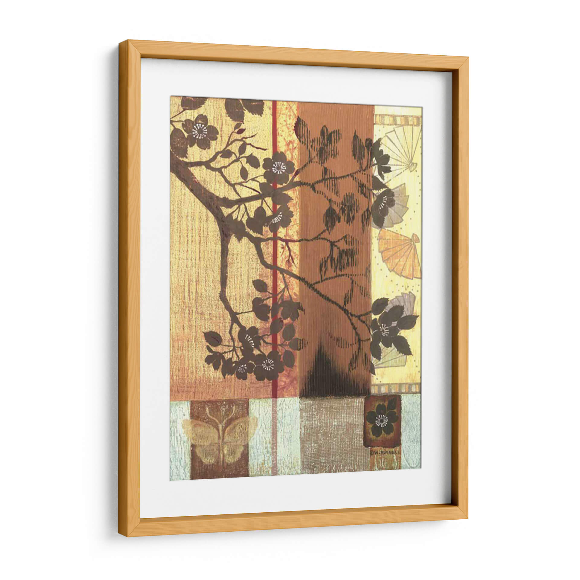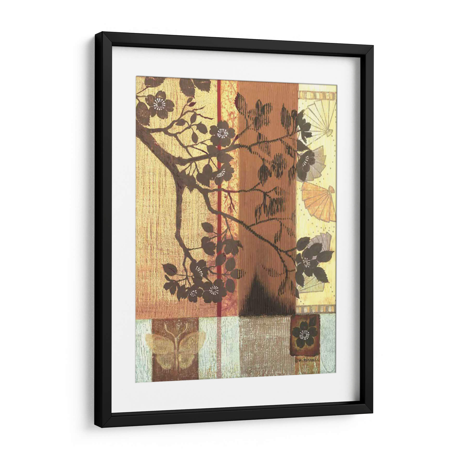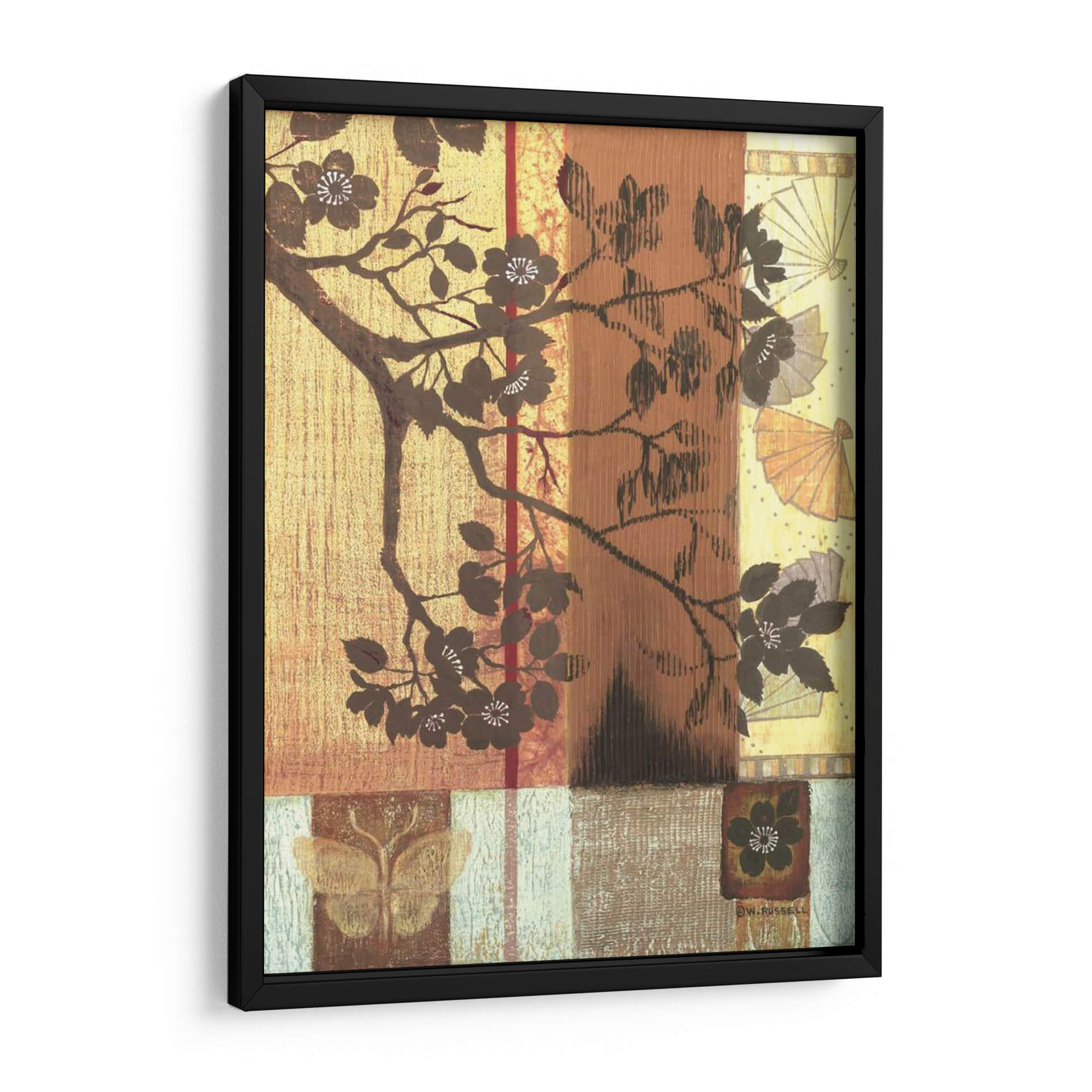 Transforma tu espacio con la serena belleza de "Rama Floreciente Asiática", una cautivadora obra de arte de Wendy Russell. Este cuadro decorativo te transporta a un jardín zen con su evocadora representación de ramas de cerezo en flor y sutiles toques de inspiración oriental, como abanicos y mariposas estilizadas. La paleta de colores, dominada por tonos tierra cálidos como ocres, marrones y naranjas, se entrelaza con delicadas líneas rojas y acentos amarillos, creando una atmósfera de tranquilidad y armonía. La composición, dividida en secciones verticales que recuerdan a pantallas tradicionales, añade profundidad y un toque contemporáneo a la pieza. Las siluetas oscuras de las ramas y flores contrastan elegantemente con los fondos texturizados, aportando un dinamismo visual sutil. Ideal para quienes buscan infundir calma y sofisticación en su hogar u oficina, este cuadro es perfecto para crear un punto focal pacífico en salones, dormitorios o estudios. Su estilo, que fusiona elementos botánicos con un diseño gráfico moderno, lo convierte en una elección versátil para una variedad de decoraciones, desde las más minimalistas hasta las más eclécticas, invitando a la contemplación y al bienestar.