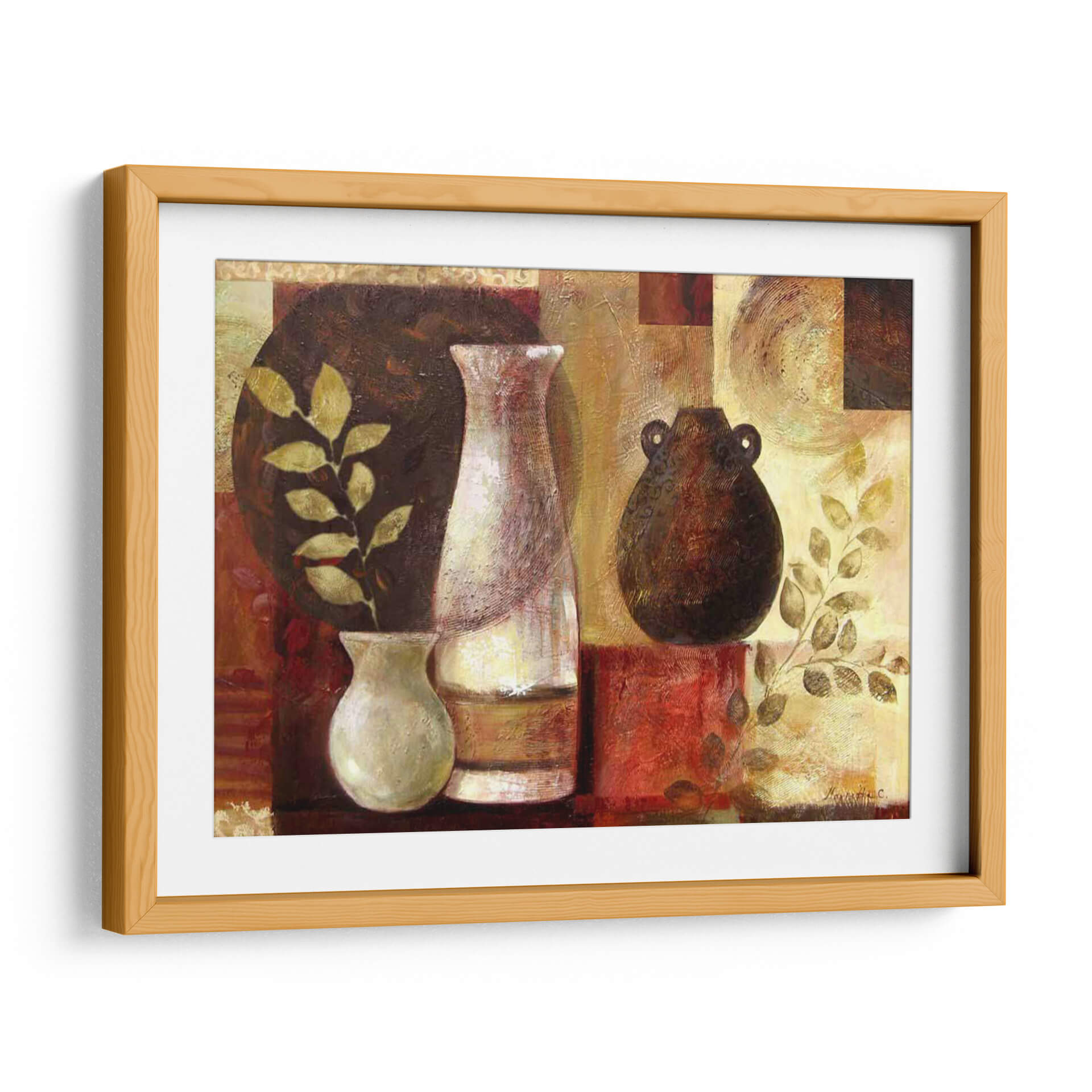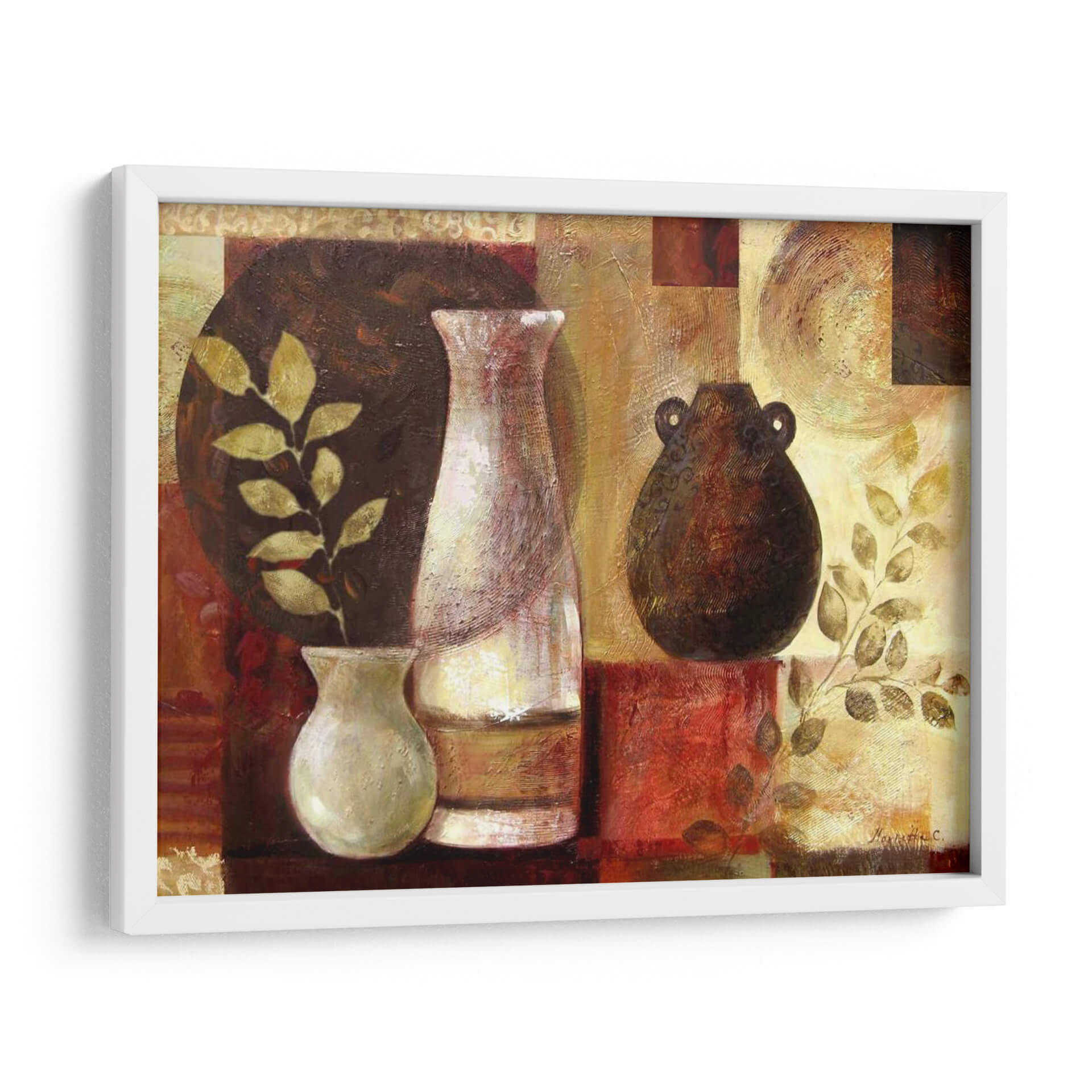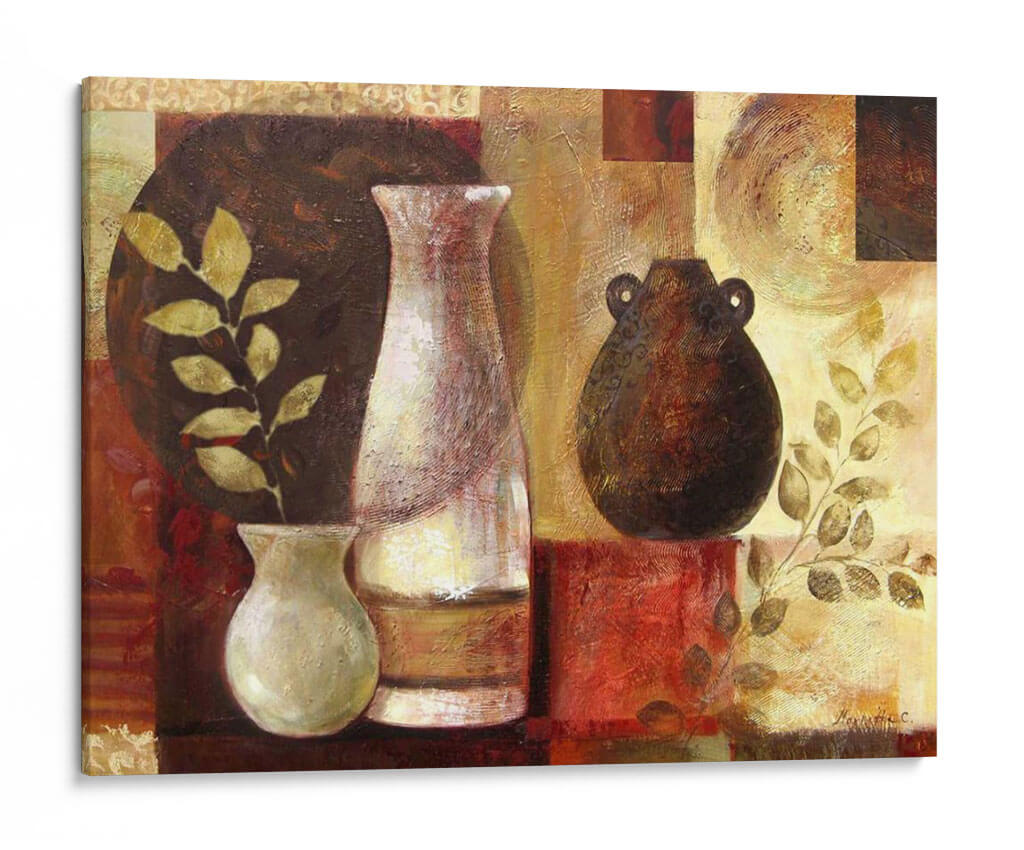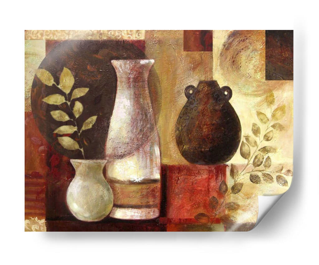 Transforma tu espacio con "Spice Vases II", una obra de arte cautivadora de Marietta Cohen que celebra la belleza serena de los jarrones y la naturaleza. Esta pieza evoca una atmósfera de calidez y sofisticación a través de su rica paleta de tonos tierra, ocres y rojizos, salpicada de delicados toques dorados y verdosos. La composición presenta una armoniosa disposición de vasijas, donde un jarrón alto y esbelto de color marfil dialoga con una pieza más robusta y terrosa, flanqueados por sutiles ramas con hojas que añaden un toque orgánico. El estilo, que fusiona elementos abstractos con una representación figurativa de bodegón, crea una profundidad visual intrigante y una textura rica que invita a la contemplación. "Spice Vases II" es ideal para añadir un punto de interés visual a salas de estar, comedores o estudios, aportando una sensación de tranquilidad y elegancia atemporal. Su diseño versátil se integra a la perfección en decoraciones contemporáneas, rústicas o eclécticas, convirtiéndose en un elemento decorativo que inspira calma y buen gusto. Descubre cómo este cuadro decorativo puede elevar la estética de tu hogar u oficina, creando un ambiente acogedor y lleno de personalidad.