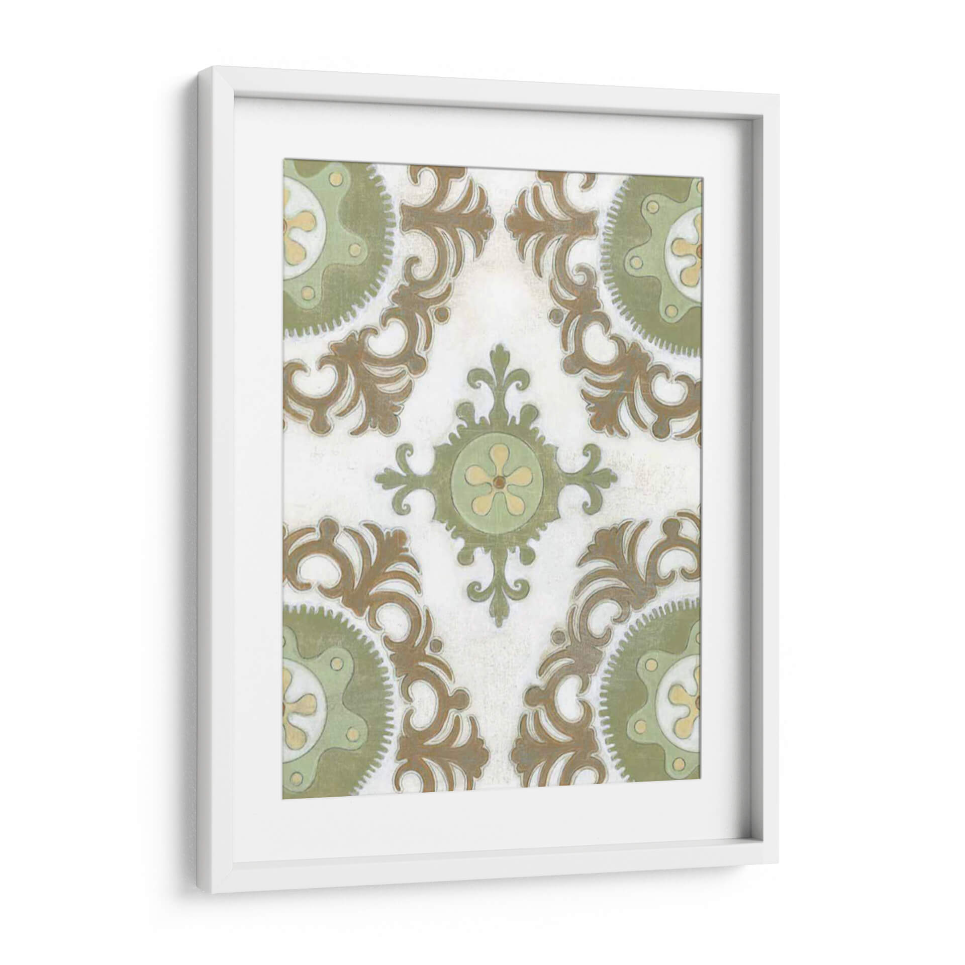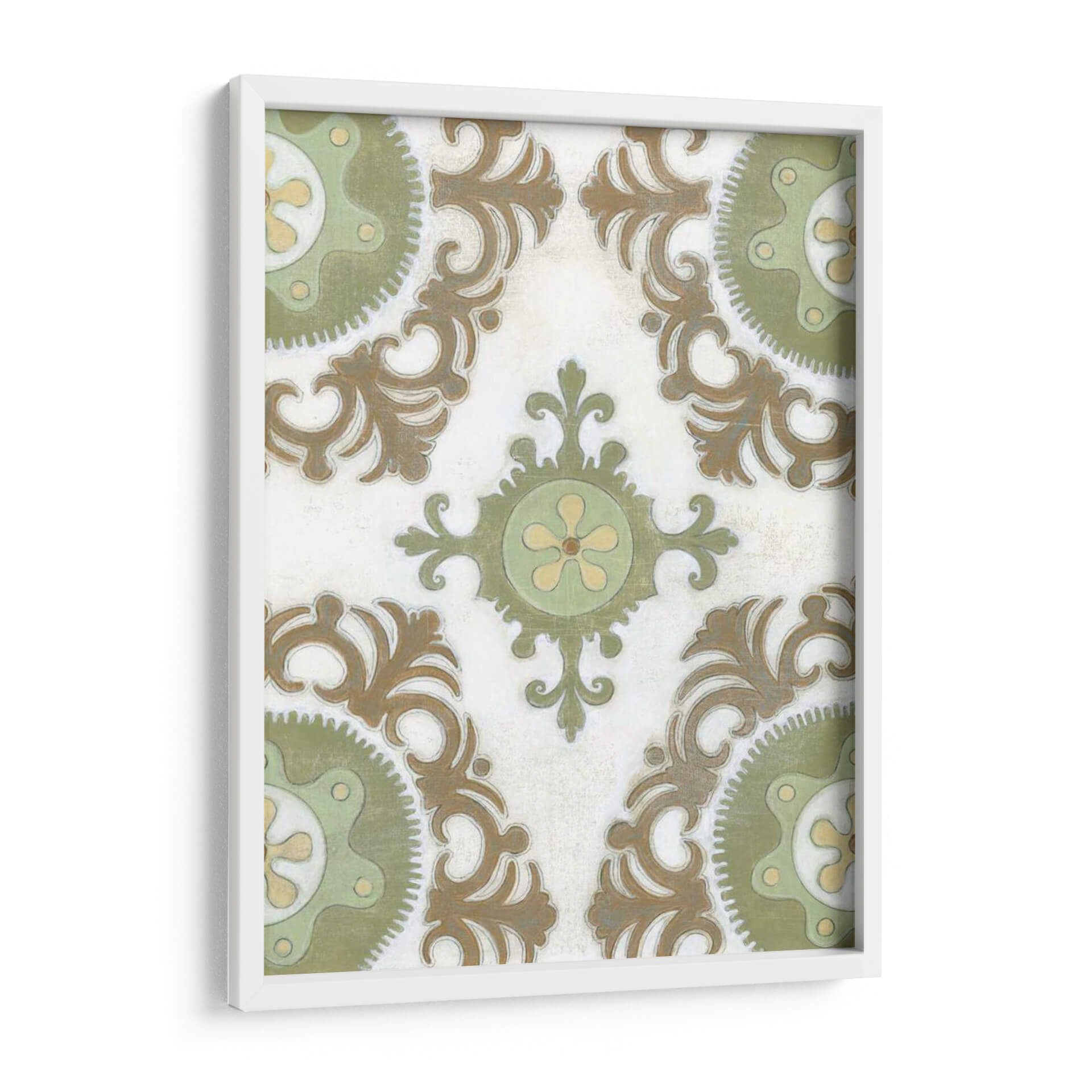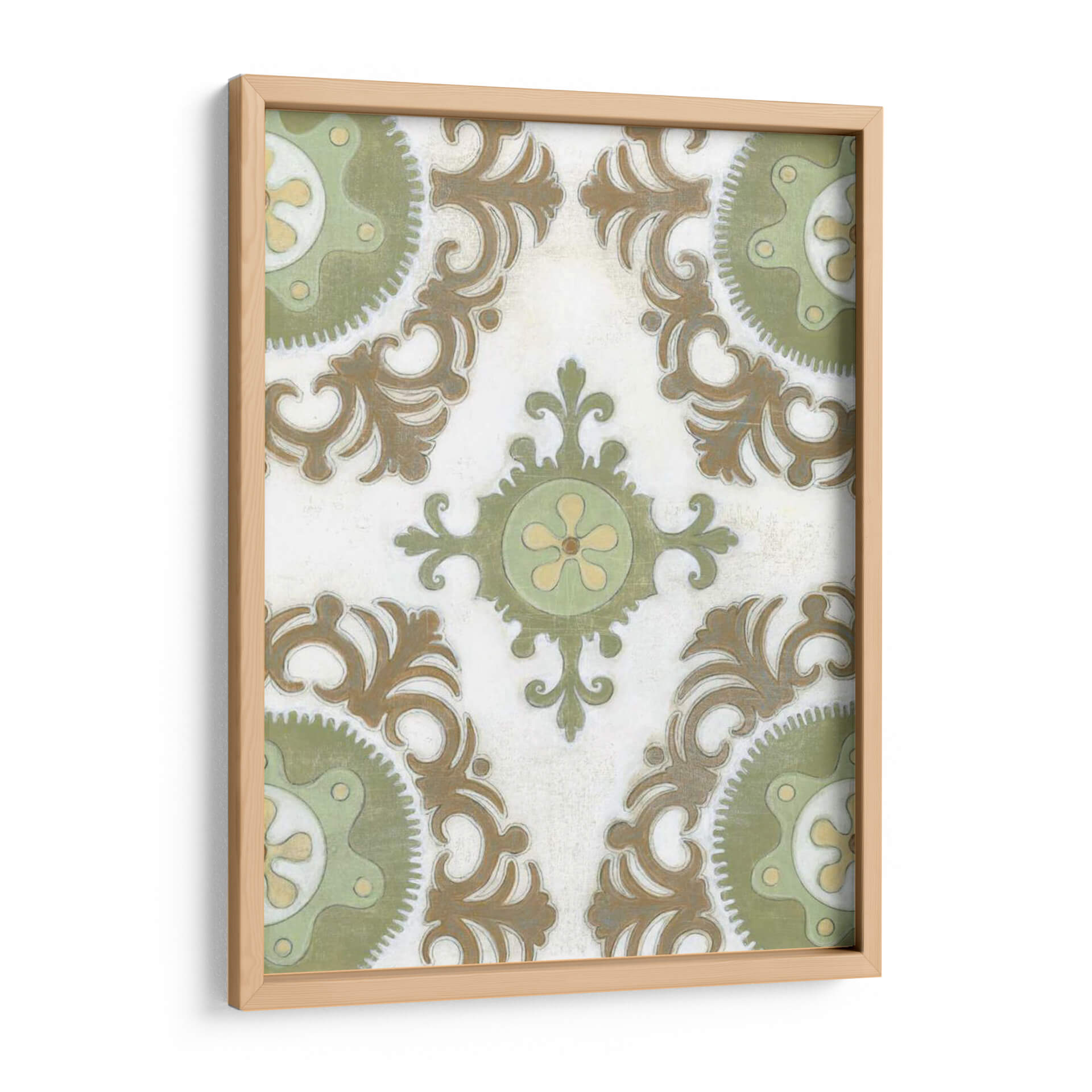 Transforma tu espacio con la obra "Tierra Suzani I", una pieza que evoca la rica herencia textil de Asia Central a través de un diseño contemporáneo. Este cuadro decorativo presenta un patrón intrincado de medallones y volutas en tonos tierra, verde salvia y toques de amarillo pálido, todo sobre un fondo texturizado que simula un lienzo antiguo. La composición simétrica y los detalles delicados invitan a la contemplación, aportando una sensación de calma y sofisticación a cualquier habitación. Su estilo, que fusiona lo tradicional con una sensibilidad moderna, lo convierte en una adición versátil para una variedad de decoraciones, desde la bohemia hasta la ecléctica o la contemporánea. Imagina este cuadro aportando un toque de elegancia terrenal a tu sala de estar, un acento de serenidad a tu dormitorio o un punto de interés cultural a tu estudio. "Tierra Suzani I" no es solo una obra de arte, es una ventana a la artesanía ancestral reinterpretada para el hogar moderno, una pieza que promete añadir profundidad, textura y una atmósfera de tranquilidad a tu vida diaria. Es ideal para quienes buscan una decoración con carácter y una conexión con la historia y la cultura.