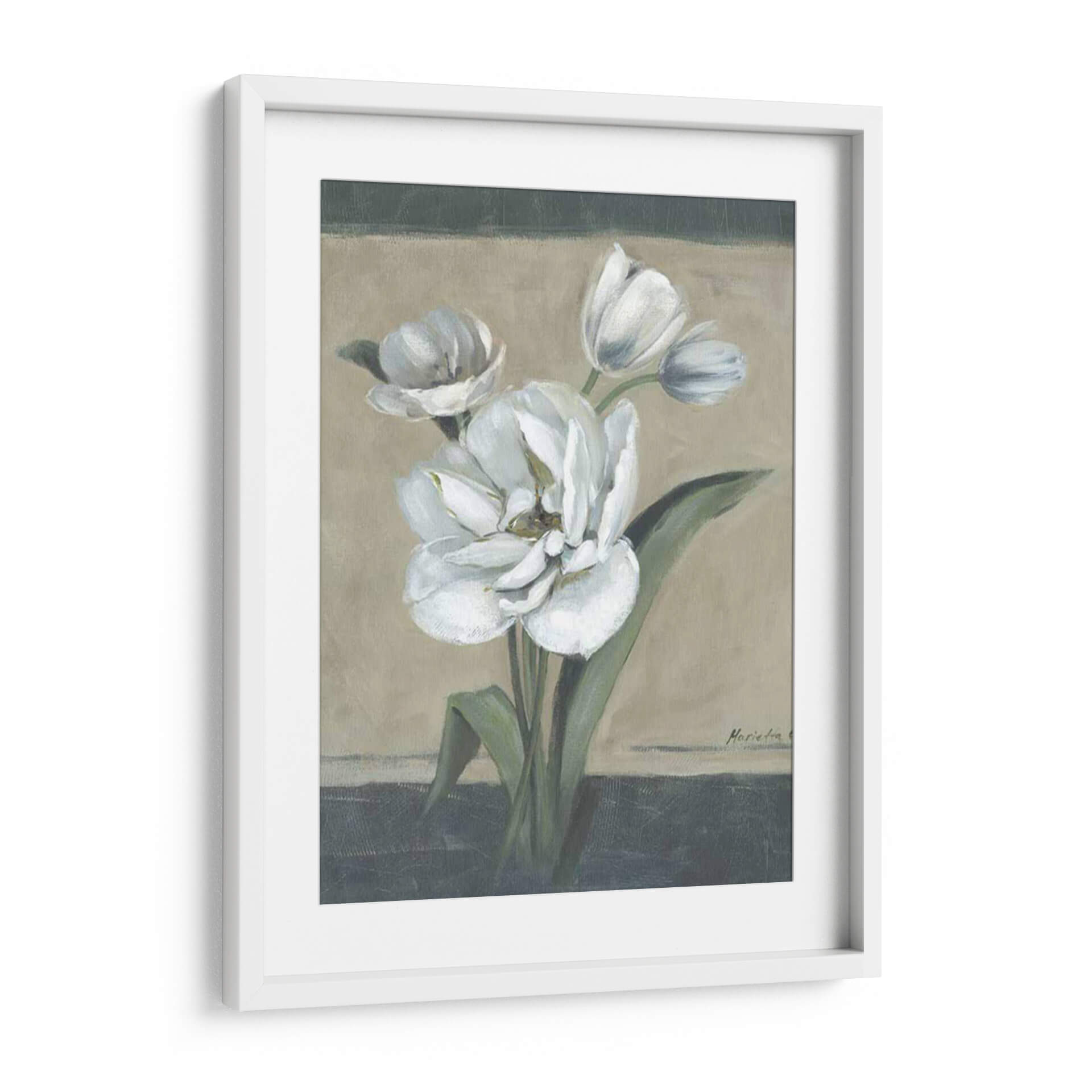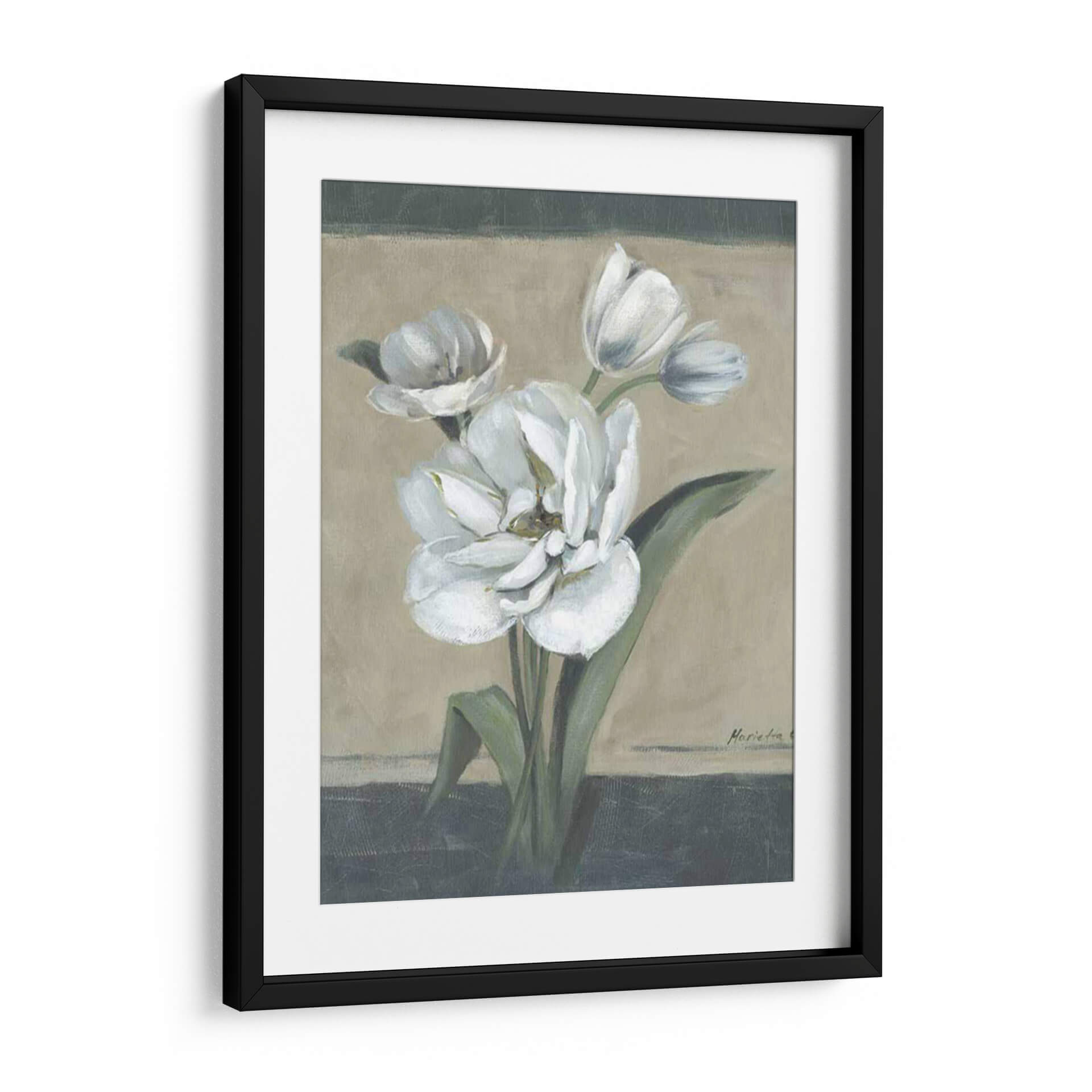 Sumérgete en la delicadeza y elegancia de "Tulipanes Blancos II", una obra maestra de Marietta Cohen que captura la esencia pura de estas flores icónicas. Este cuadro decorativo, con su estilo pictórico y composición armoniosa, te invita a un oasis de serenidad visual. Los pétalos blancos de los tulipanes, pintados con sutiles matices y texturas, contrastan suavemente con un fondo neutro en tonos tierra y acentos grises oscuros, creando una atmósfera de calma y sofisticación. La técnica de Cohen, que recuerda al impresionismo floral, otorga vida y movimiento a cada pétalo, invitando a la contemplación. Ideal para aquellos que buscan infundir a sus espacios un toque de naturaleza refinada y una sensación de paz. Este cuadro es perfecto para añadir un punto focal sutil pero impactante a salones, dormitorios o estudios, aportando una belleza atemporal que complementa una amplia gama de estilos decorativos, desde el contemporáneo hasta el clásico. La presencia de estos tulipanes blancos no solo embellece el entorno, sino que también evoca sentimientos de pureza, renovación y elegancia discreta, transformando cualquier habitación en un santuario de tranquilidad.