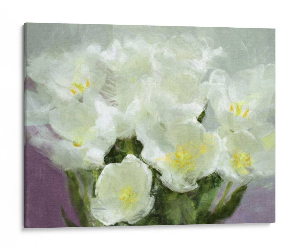 Transforma tu espacio con la delicada belleza de "Tulipanes Solares I", una obra de arte que captura la esencia luminosa de la primavera. Este cuadro decorativo presenta un vibrante arreglo de tulipanes blancos, con pétalos etéreos que parecen irradiar luz propia. La paleta de colores se centra en blancos cremosos y amarillos suaves en las flores, contrastando elegantemente con un fondo sutilmente morado y matices verdes en el follaje. La técnica pictórica, con pinceladas sueltas y expresivas, evoca una sensación de frescura y movimiento, acercándose a un estilo impresionista. La composición cercana y el enfoque en los detalles florales invitan a la contemplación, creando una atmósfera de serenidad y optimismo. "Tulipanes Solares I" es perfecto para añadir un toque de naturaleza y luminosidad a cualquier habitación, desde salones y comedores hasta dormitorios y estudios, aportando una sensación de calma y renovación. Ideal para quienes buscan arte floral moderno y piezas que inspiren tranquilidad y alegría. Añade esta pieza única a tu colección y deja que su belleza primaveral ilumine tu hogar.