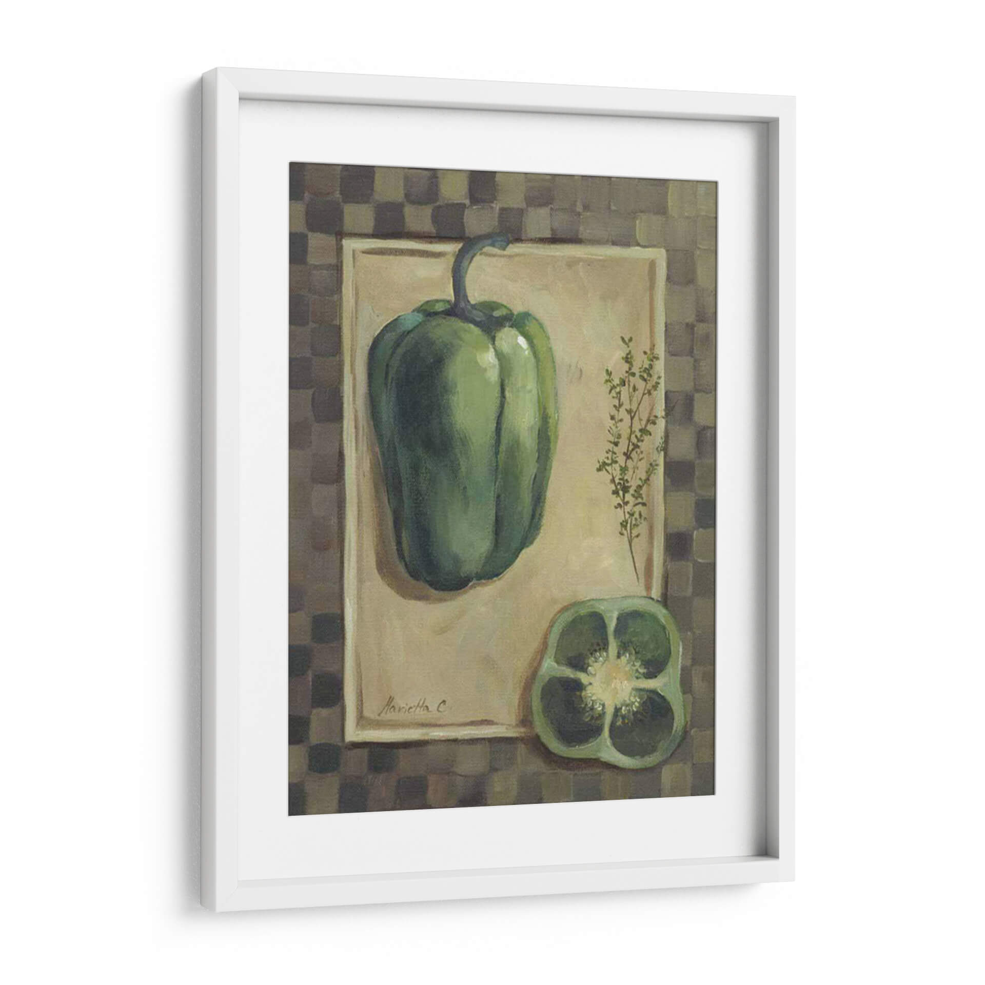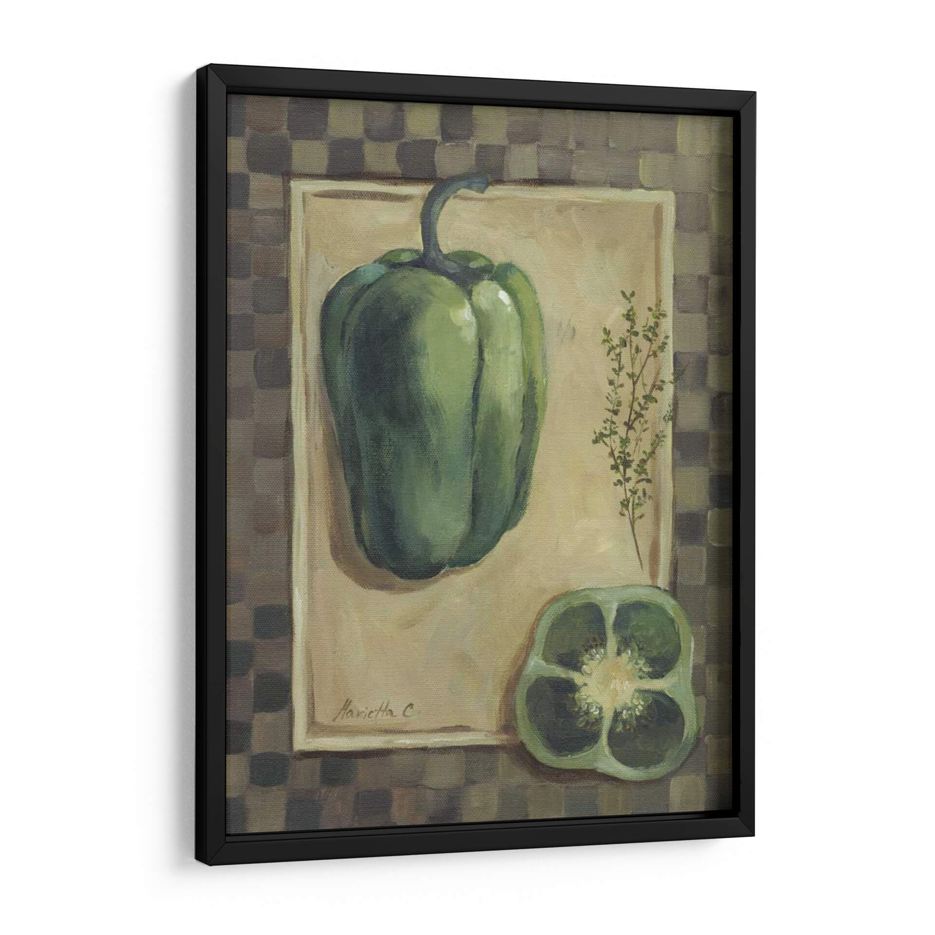 Sumérgete en la frescura y vitalidad de "Verduras Y Hierbas I", una cautivadora obra de arte de Marietta Cohen que celebra la belleza natural de los ingredientes culinarios. Este cuadro decorativo presenta un pimiento verde vibrante y su contraparte cortada por la mitad, revelando su estructura interior detallada y sus semillas. Acompañando a la estrella principal, unas delicadas hierbas aportan un toque de frescura y autenticidad. La paleta de colores se centra en tonos verdes profundos y terrosos, con sutiles matices que crean profundidad y realismo. El estilo pictórico, con pinceladas visibles que añaden textura, evoca una sensación rústica y artesanal. Este cuadro es perfecto para infundir vida y color en tu cocina, comedor o cualquier espacio donde busques una conexión con la naturaleza y la buena mesa. Su composición equilibrada y el enfoque en los detalles lo convierten en una pieza versátil, capaz de complementar tanto decoraciones rústicas como contemporáneas, añadiendo un toque de elegancia orgánica a tu hogar.