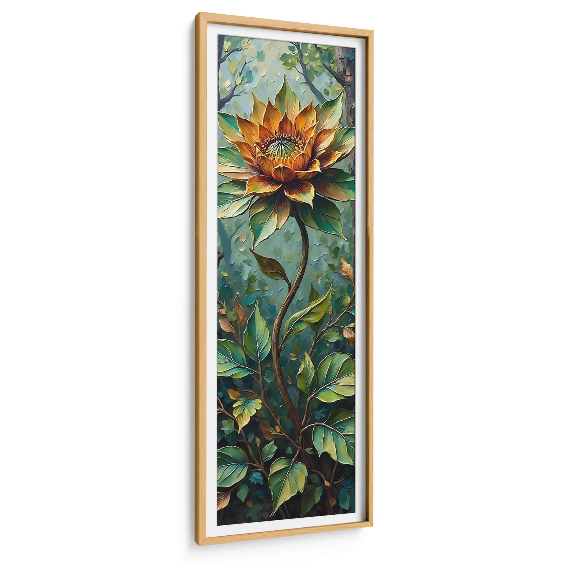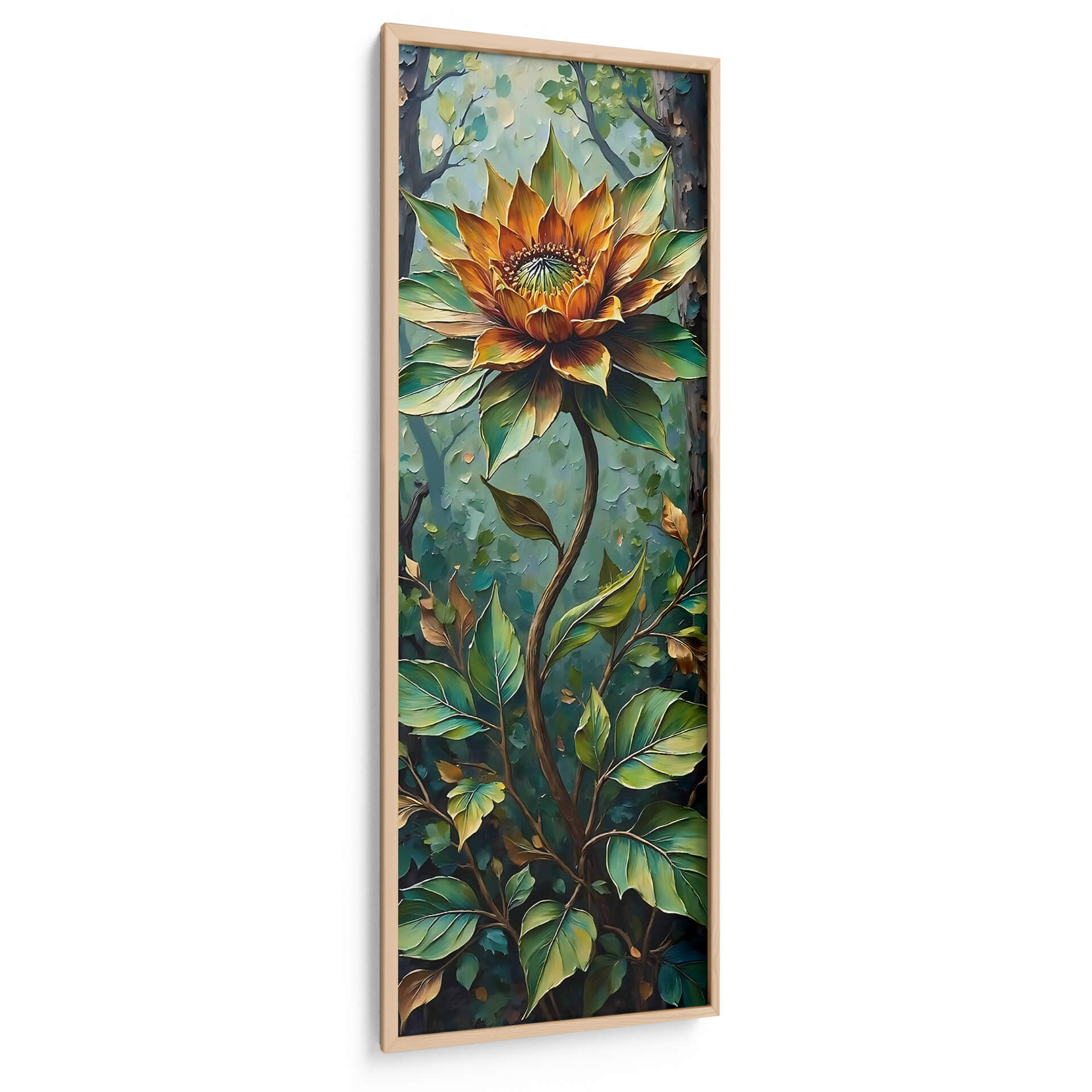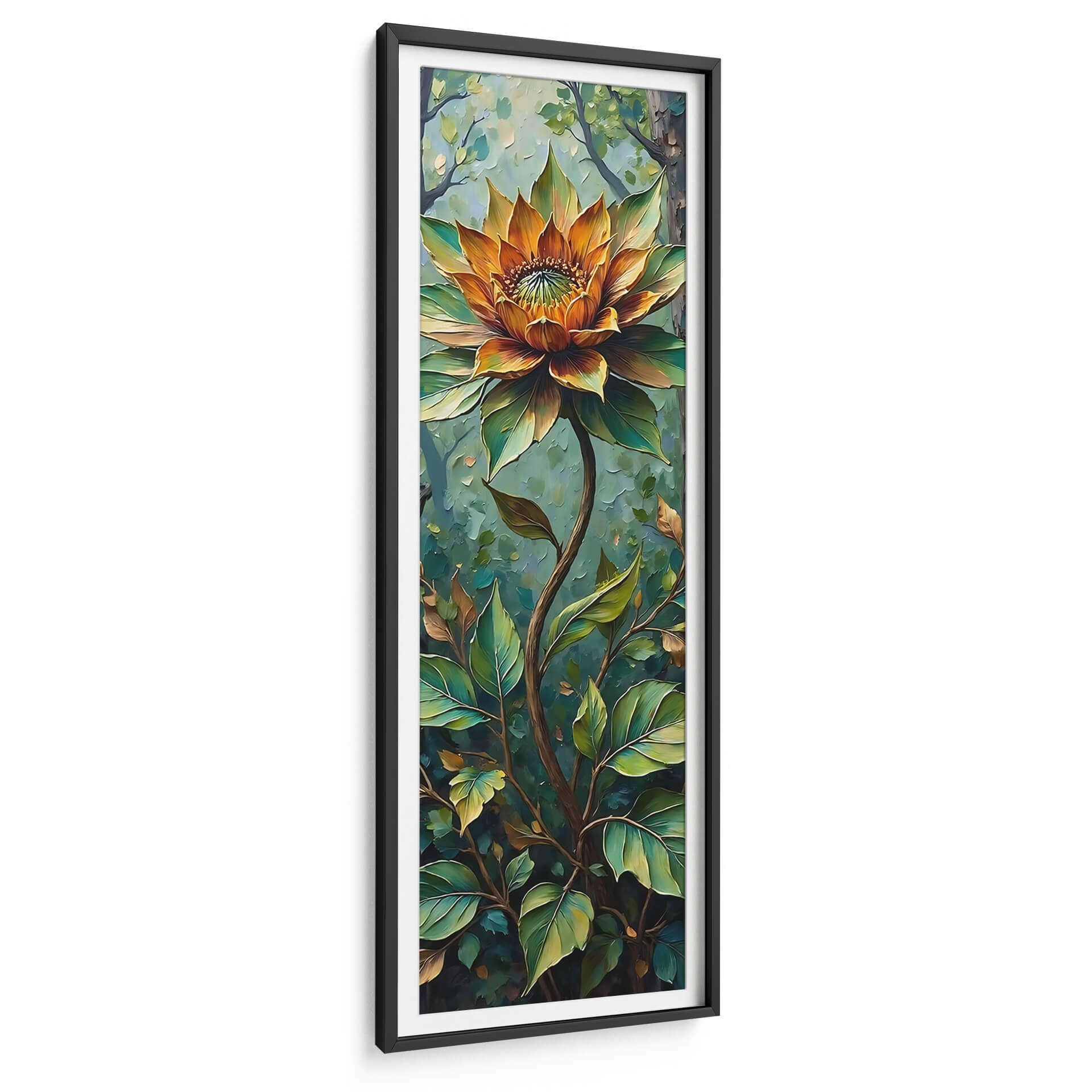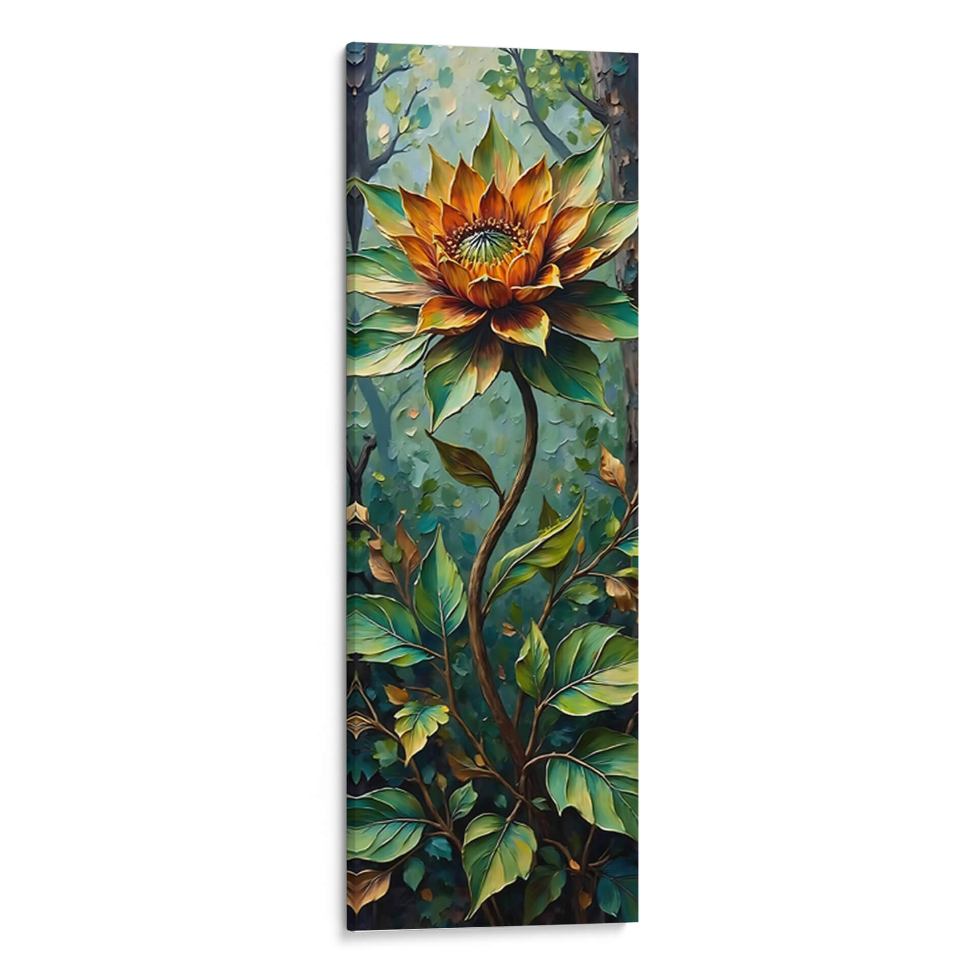 Sumérgete en la majestuosidad de la naturaleza con 'Corazón del Bosque', una obra de arte cautivadora que transforma tu espacio en un santuario de serenidad y belleza. Este cuadro decorativo presenta una flor vibrante y exótica en primer plano, emergiendo de un denso y misterioso bosque. Los tonos verdes profundos del follaje crean una atmósfera envolvente, mientras que los cálidos toques de naranja y dorado en el corazón de la flor atraen la mirada y evocan una sensación de vitalidad y crecimiento. La pincelada detallada y la rica textura transmiten la maestría del artista Tito Massia, invitando a una contemplación profunda. Ideal para quienes buscan infundir calma y un toque de sofisticación orgánica a su hogar u oficina, este cuadro vertical es una pieza que no solo decora, sino que también inspira. La composición vertical y el juego de luces y sombras añaden profundidad y un aire enigmático, haciendo de 'Corazón del Bosque' un punto focal inolvidable. Añade esta pieza inspirada en la naturaleza para crear un ambiente de tranquilidad y elegancia en cualquier habitación.