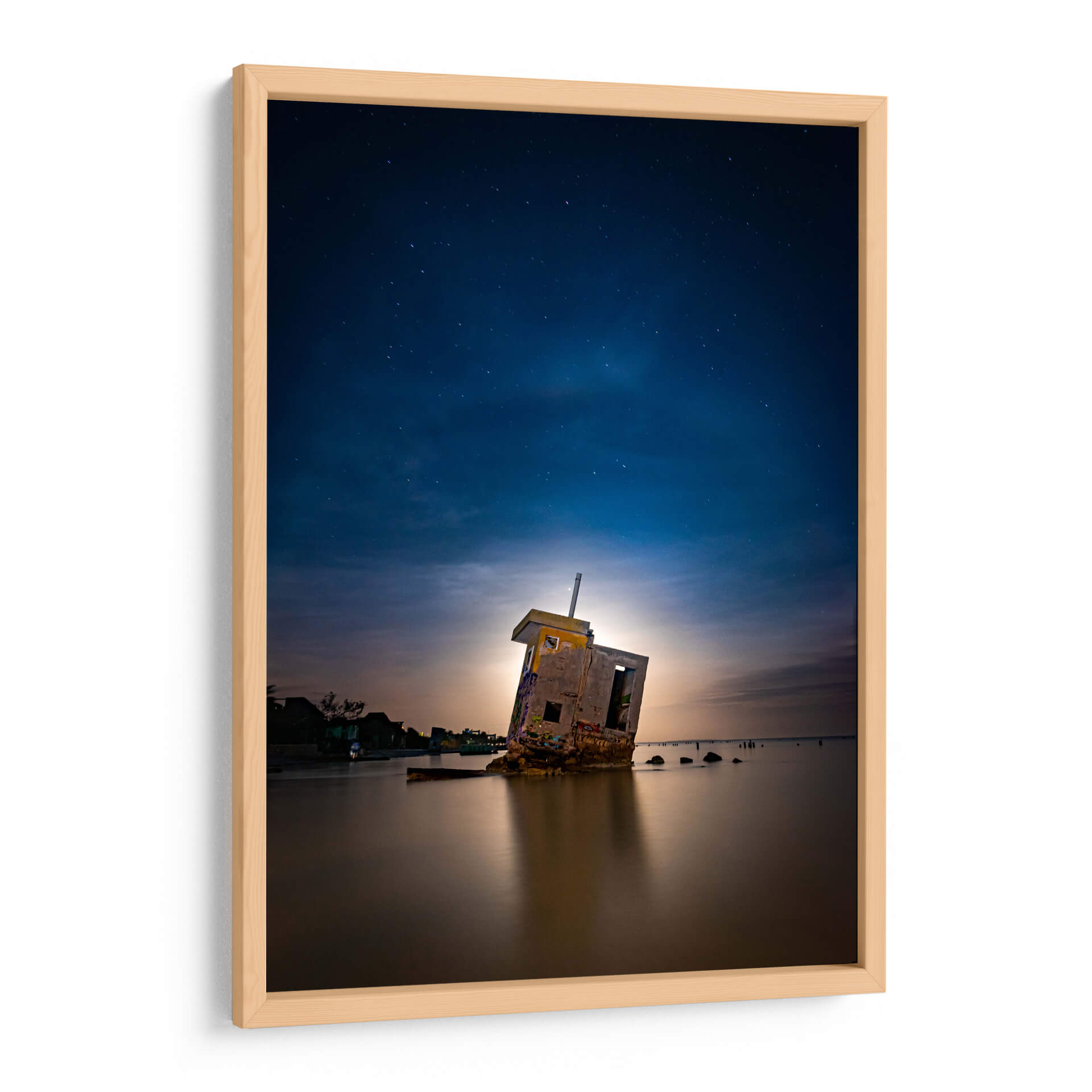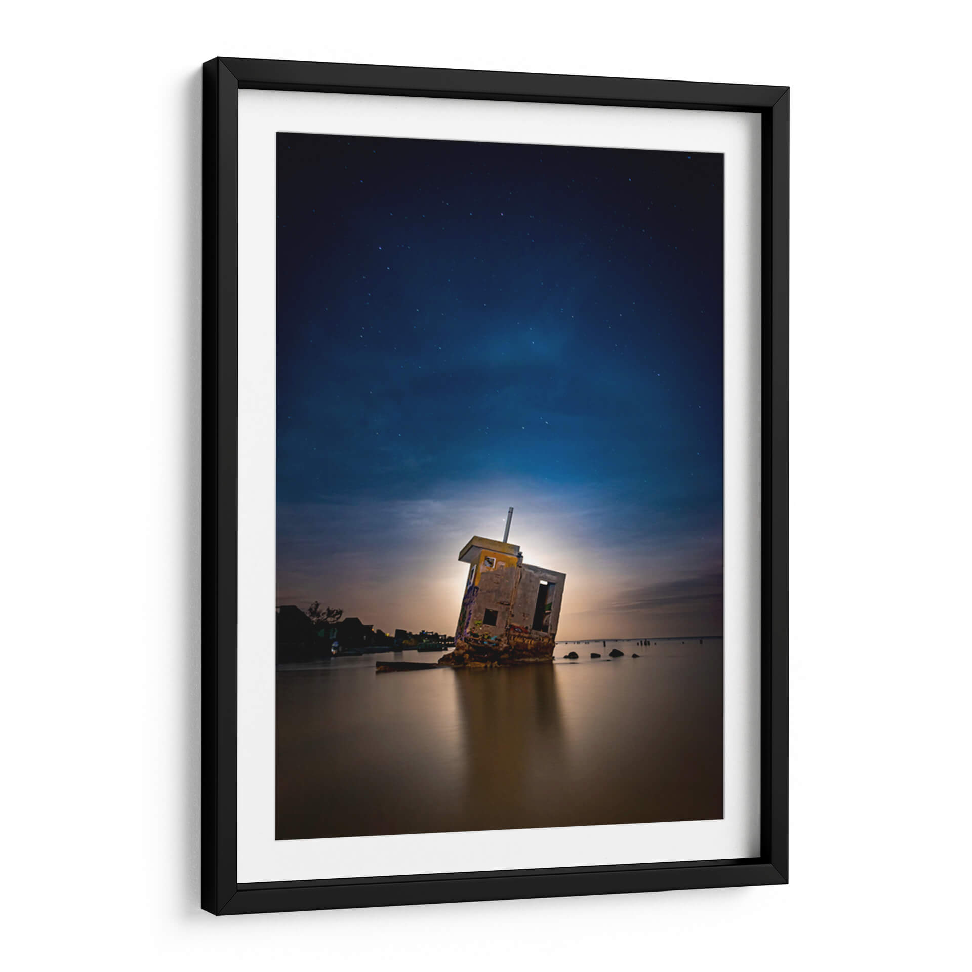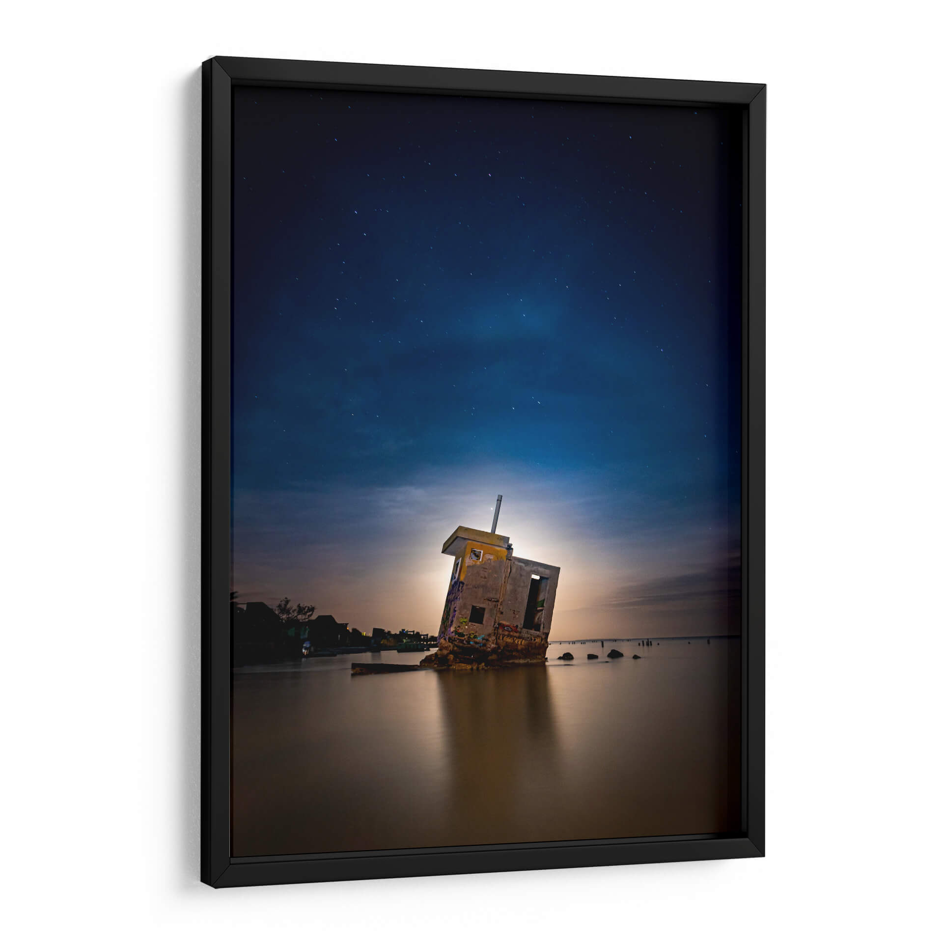 Captura la magia de la noche con "Aro de luz lunar", una obra de Ulises Páez que te transporta a un paisaje sereno y enigmático. La imagen presenta una estructura abandonada, una especie de ruina o naufragio, emergiendo de aguas tranquilas bajo un cielo estrellado. La paleta de colores es dominada por profundos azules nocturnos, contrastando con la luz tenue y cálida que emana de detrás de la estructura, creando un halo místico. Las estrellas salpican el firmamento, añadiendo una sensación de inmensidad y tranquilidad. La composición, con la línea del horizonte baja, enfatiza la vastedad del cielo y la soledad de la edificación. Los detalles sutiles, como las siluetas de construcciones en la lejanía y las rocas emergentes en el agua, añaden profundidad y narrativa. Este cuadro decorativo evoca sentimientos de paz, melancolía y asombro. Es ideal para quienes buscan una pieza de arte que invite a la reflexión y añada un toque de misterio contemplativo a su sala de estar, dormitorio o estudio. "Aro de luz lunar" es más que una imagen; es una invitación a perderse en la belleza serena de la noche.