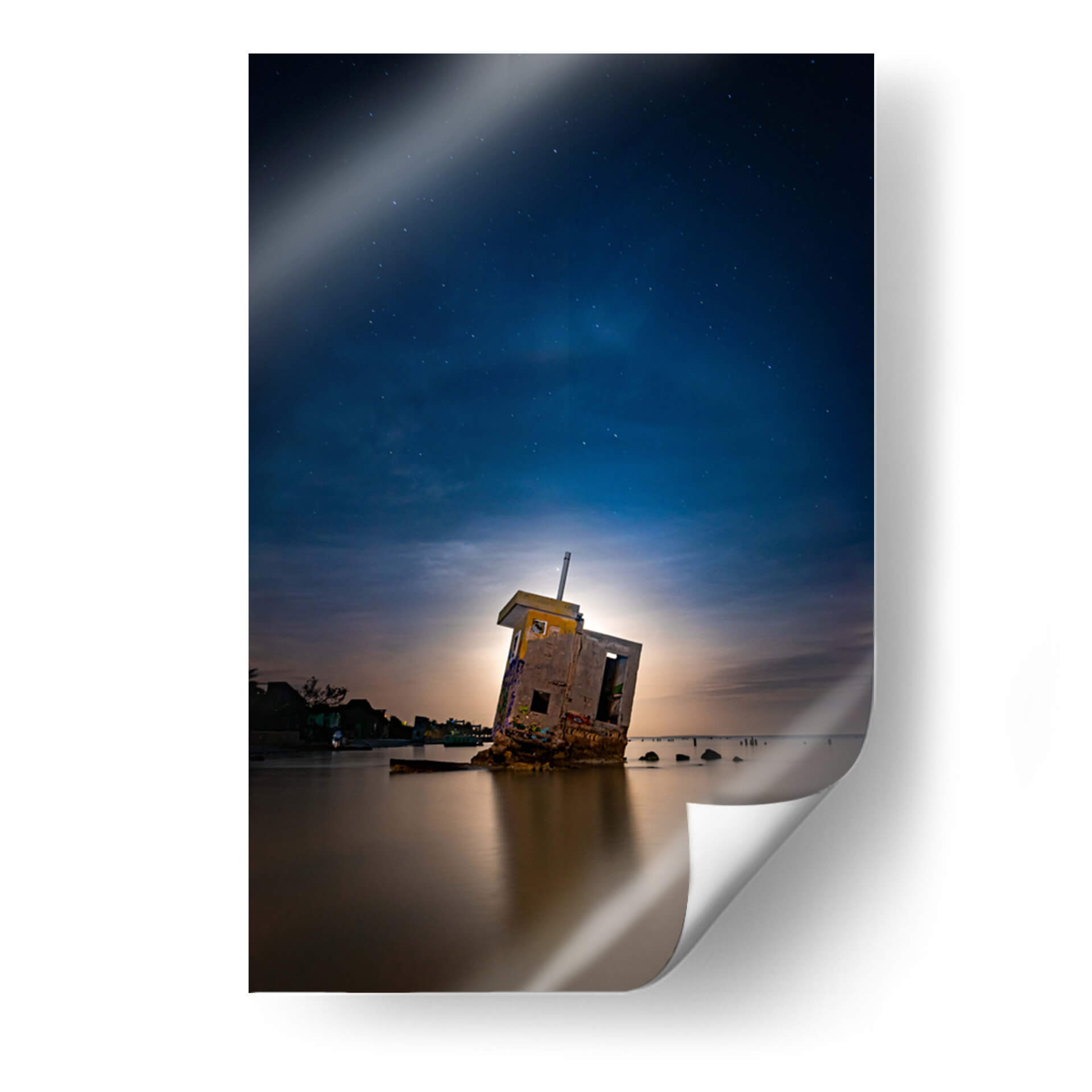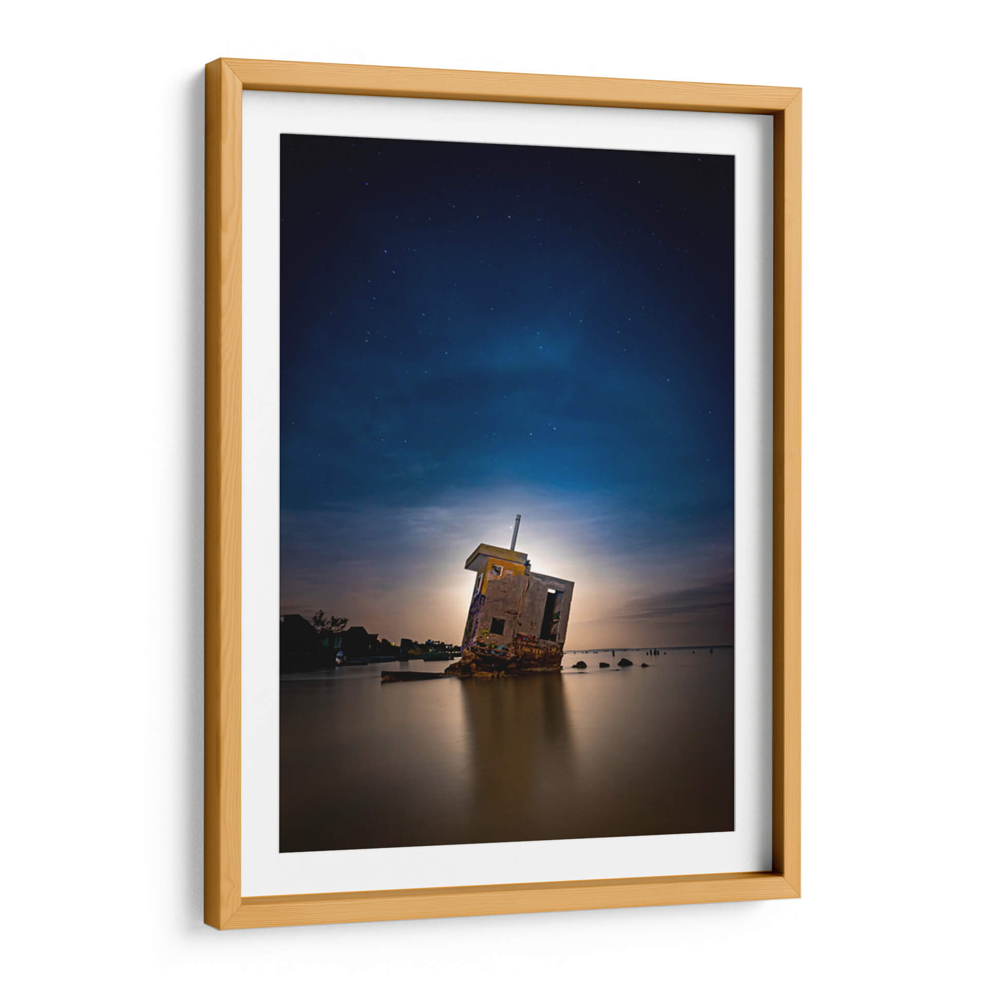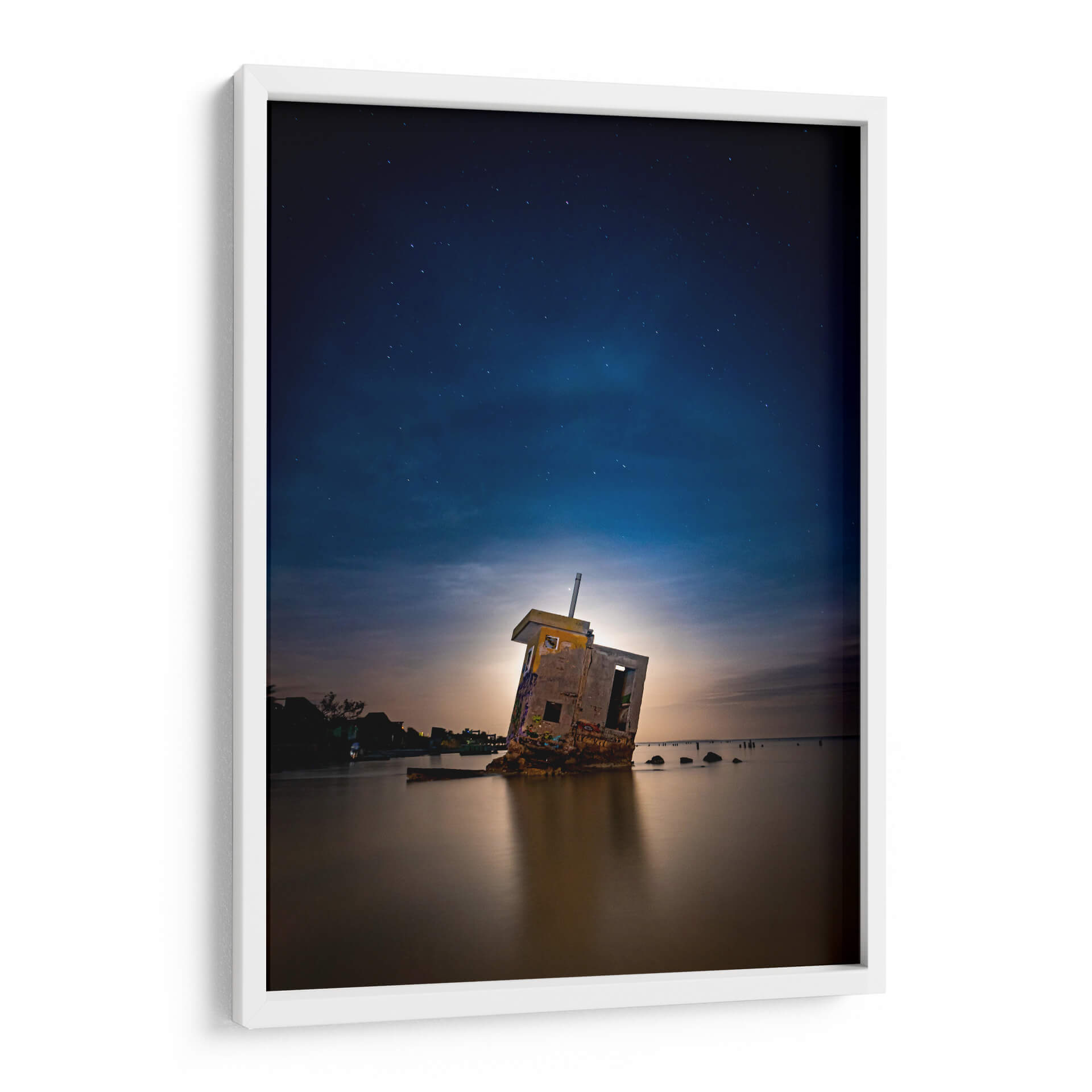 Captura la magia de la noche con "Aro de luz lunar", una obra de Ulises Páez que te transporta a un paisaje sereno y enigmático. La imagen presenta una estructura abandonada, una especie de ruina o naufragio, emergiendo de aguas tranquilas bajo un cielo estrellado. La paleta de colores es dominada por profundos azules nocturnos, contrastando con la luz tenue y cálida que emana de detrás de la estructura, creando un halo místico. Las estrellas salpican el firmamento, añadiendo una sensación de inmensidad y tranquilidad. La composición, con la línea del horizonte baja, enfatiza la vastedad del cielo y la soledad de la edificación. Los detalles sutiles, como las siluetas de construcciones en la lejanía y las rocas emergentes en el agua, añaden profundidad y narrativa. Este cuadro decorativo evoca sentimientos de paz, melancolía y asombro. Es ideal para quienes buscan una pieza de arte que invite a la reflexión y añada un toque de misterio contemplativo a su sala de estar, dormitorio o estudio. "Aro de luz lunar" es más que una imagen; es una invitación a perderse en la belleza serena de la noche.