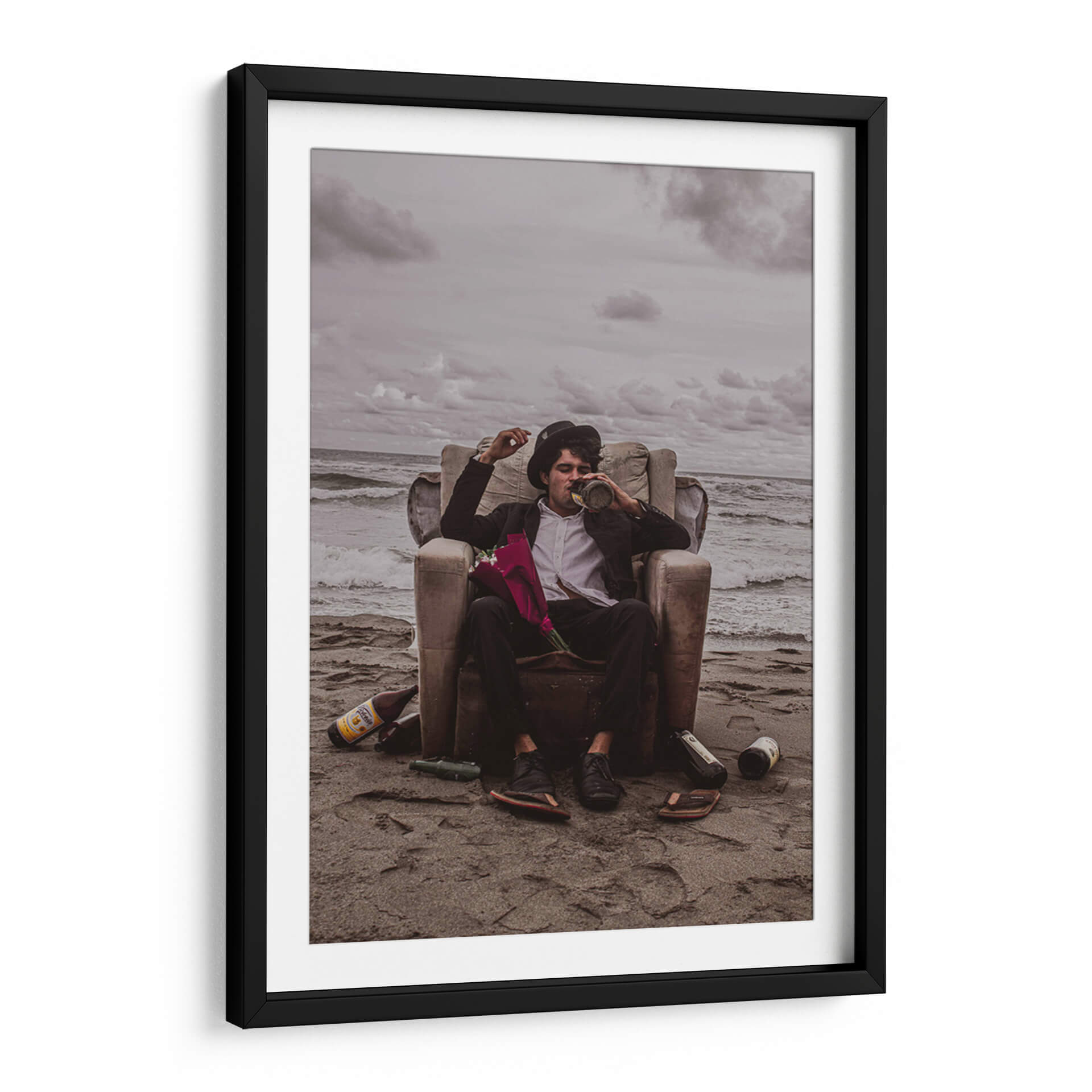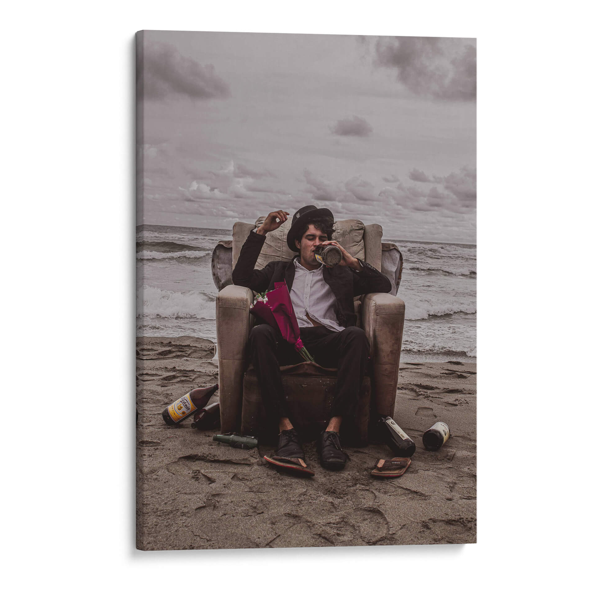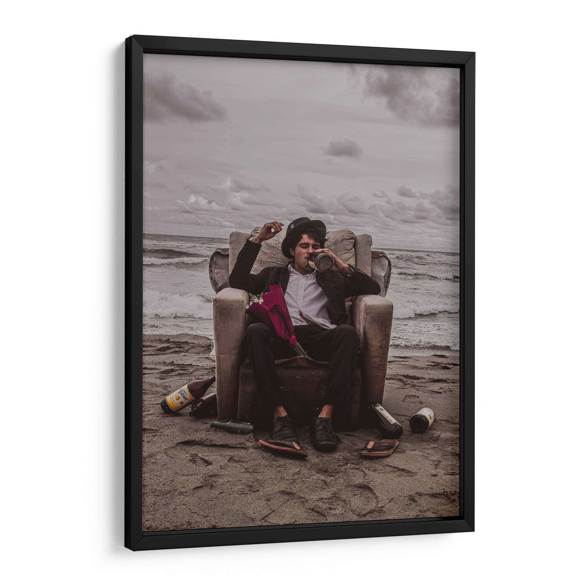Sumérgete en la atmósfera melancólica y reflexiva de "Borracho", una obra de arte cautivadora del artista Wara-Wara. Esta pieza visualmente impactante presenta a un hombre solitario sentado en un sillón desgastado en medio de una playa desolada, con el mar agitado y un cielo nublado de fondo. La composición, dominada por tonos grises y terrosos, evoca una profunda sensación de introspección y desasosiego, capturando un momento de vulnerabilidad humana. Las botellas esparcidas y el ramo de flores marchitas añaden capas de simbolismo, sugiriendo una narrativa de desamor o introspección profunda. Este cuadro decorativo es ideal para espacios que buscan una declaración audaz y emocional, como salas de estar modernas, estudios privados o incluso oficinas creativas que aprecien el arte con profundidad. Su estilo fotográfico, con un toque surrealista, invita a la contemplación y al debate, convirtiéndolo en un punto focal que sin duda generará conversación. Añade un toque de arte contemporáneo con significado a tu decoración y permite que esta poderosa imagen resuene con tus invitados y contigo.