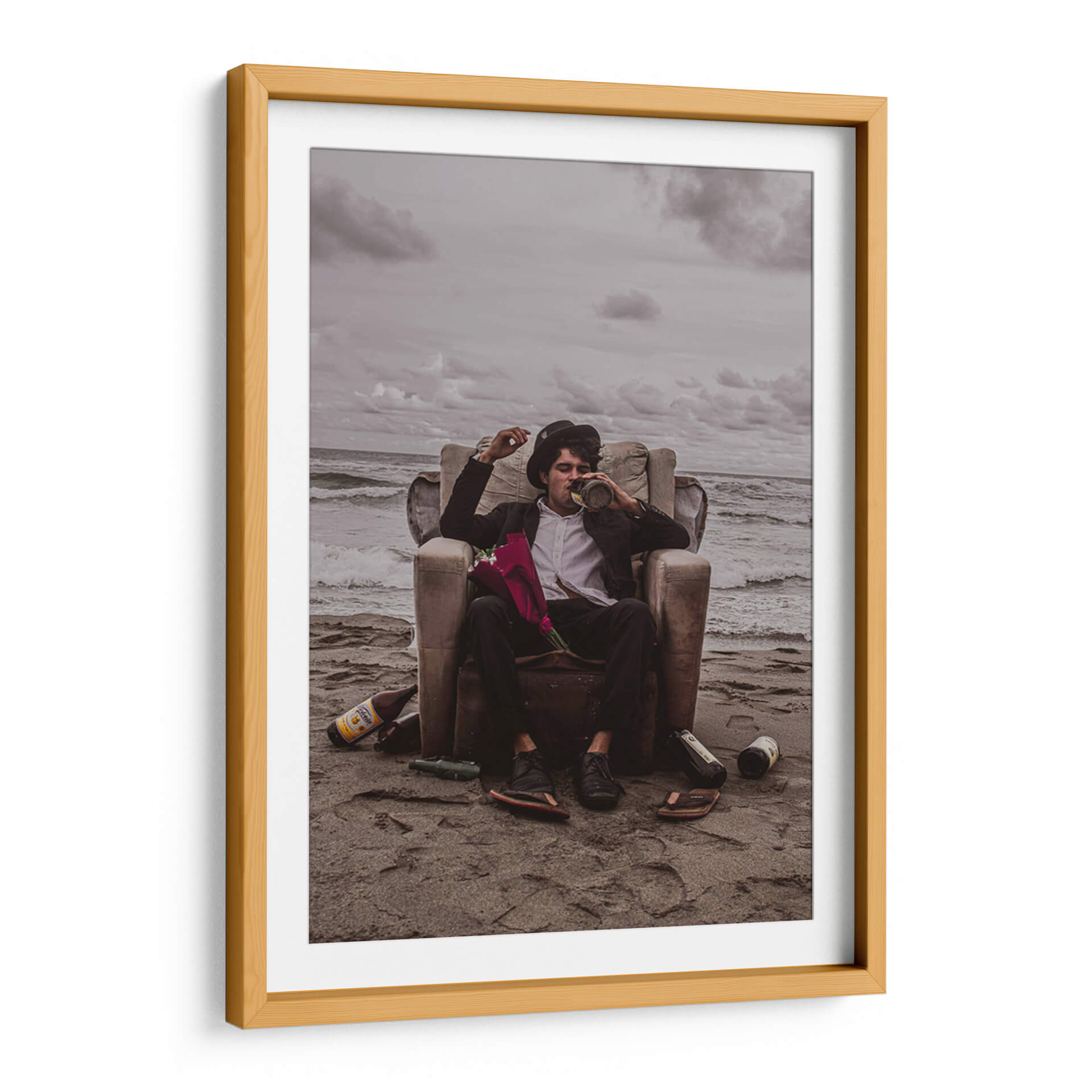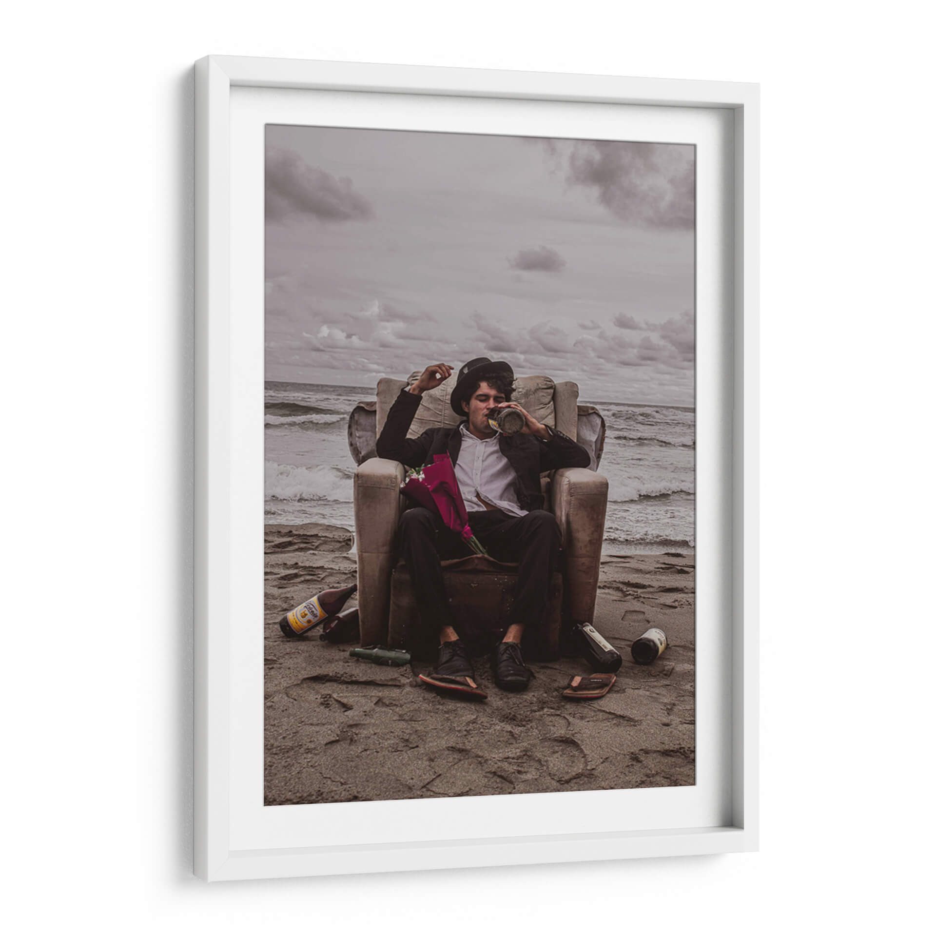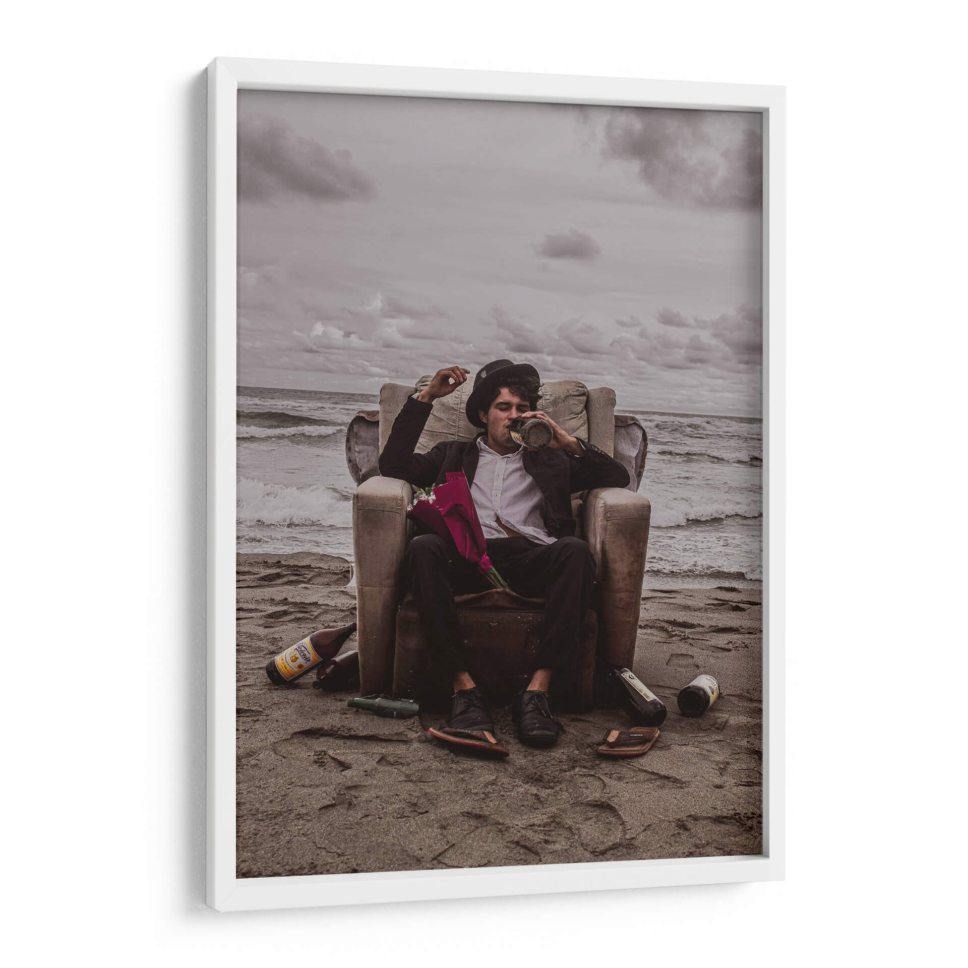 Sumérgete en la atmósfera melancólica y reflexiva de "Borracho", una obra de arte cautivadora del artista Wara-Wara. Esta pieza visualmente impactante presenta a un hombre solitario sentado en un sillón desgastado en medio de una playa desolada, con el mar agitado y un cielo nublado de fondo. La composición, dominada por tonos grises y terrosos, evoca una profunda sensación de introspección y desasosiego, capturando un momento de vulnerabilidad humana. Las botellas esparcidas y el ramo de flores marchitas añaden capas de simbolismo, sugiriendo una narrativa de desamor o introspección profunda. Este cuadro decorativo es ideal para espacios que buscan una declaración audaz y emocional, como salas de estar modernas, estudios privados o incluso oficinas creativas que aprecien el arte con profundidad. Su estilo fotográfico, con un toque surrealista, invita a la contemplación y al debate, convirtiéndolo en un punto focal que sin duda generará conversación. Añade un toque de arte contemporáneo con significado a tu decoración y permite que esta poderosa imagen resuene con tus invitados y contigo.