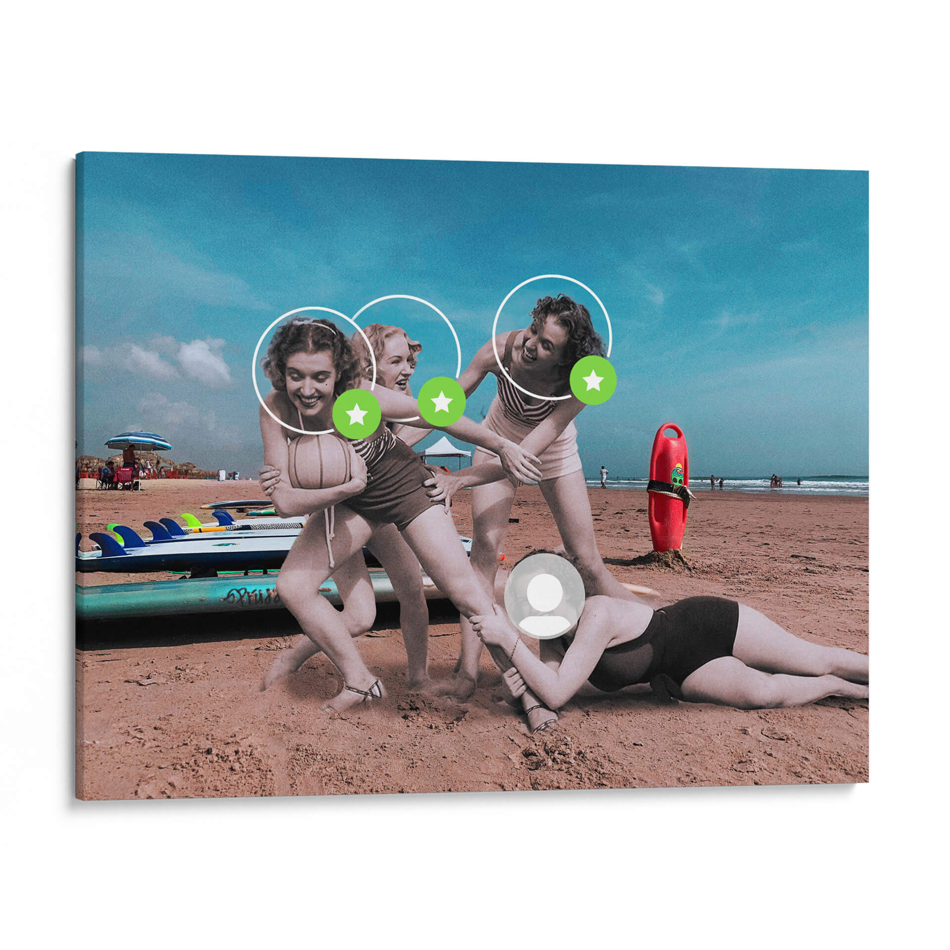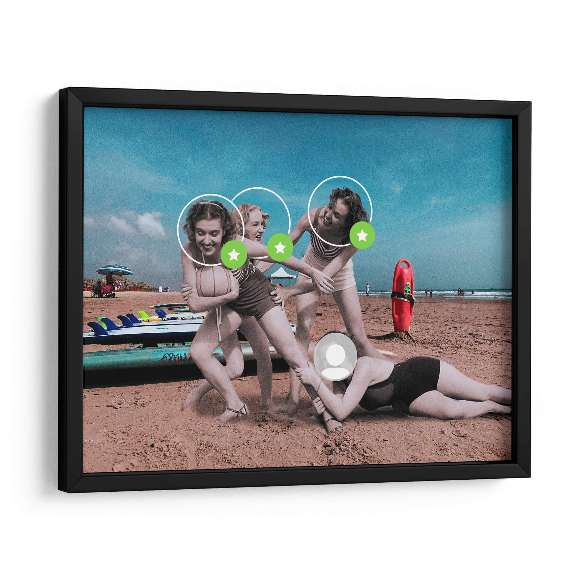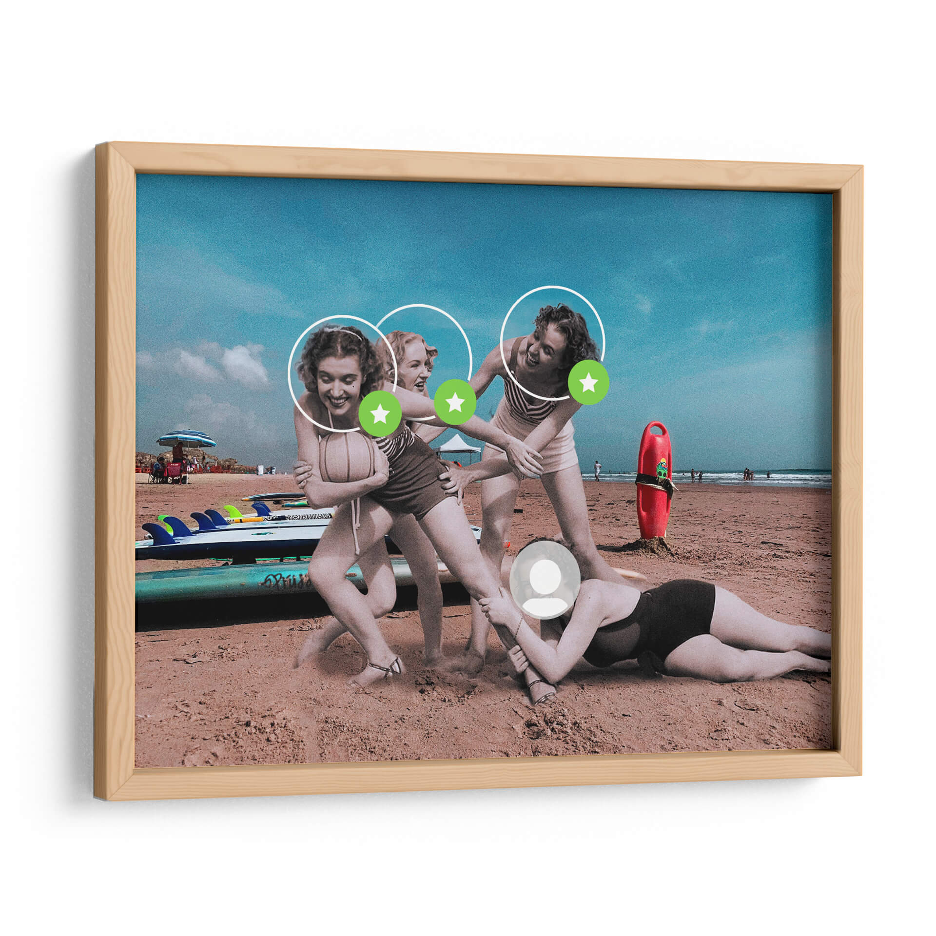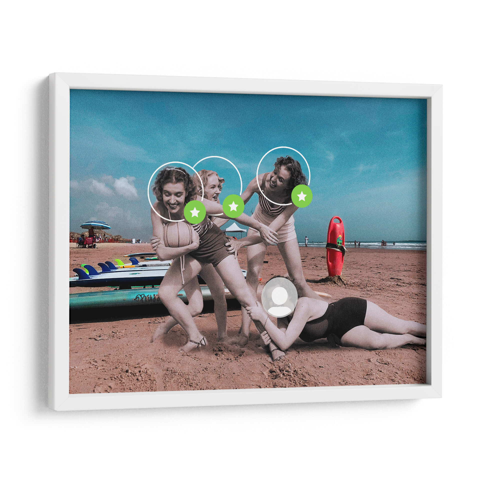 Captura la esencia de la diversión veraniega y la camaradería con este cautivador cuadro decorativo titulado 'Close Friends Miramar'. La obra de arte presenta una escena vibrante en la playa, donde un grupo de mujeres en trajes de baño de época se divierten y juegan, evocando una sensación de nostalgia y alegría despreocupada. Los colores cálidos de la arena se combinan con el azul intenso del cielo y el mar, creando una atmósfera estival y relajada. Las figuras, capturadas en un momento de movimiento y risas, transmiten la energía de la amistad y los buenos tiempos. El estilo de la obra, que fusiona elementos de collage y fotografía vintage, le confiere un carácter único y artístico. Este cuadro es ideal para añadir un toque retro y divertido a cualquier espacio, ya sea una sala de estar, un dormitorio o una oficina, convirtiéndose en un punto focal que invita a la conversación y a revivir la nostalgia de días soleados y momentos compartidos con seres queridos. Es una pieza que celebra la conexión humana y la ligereza del verano.