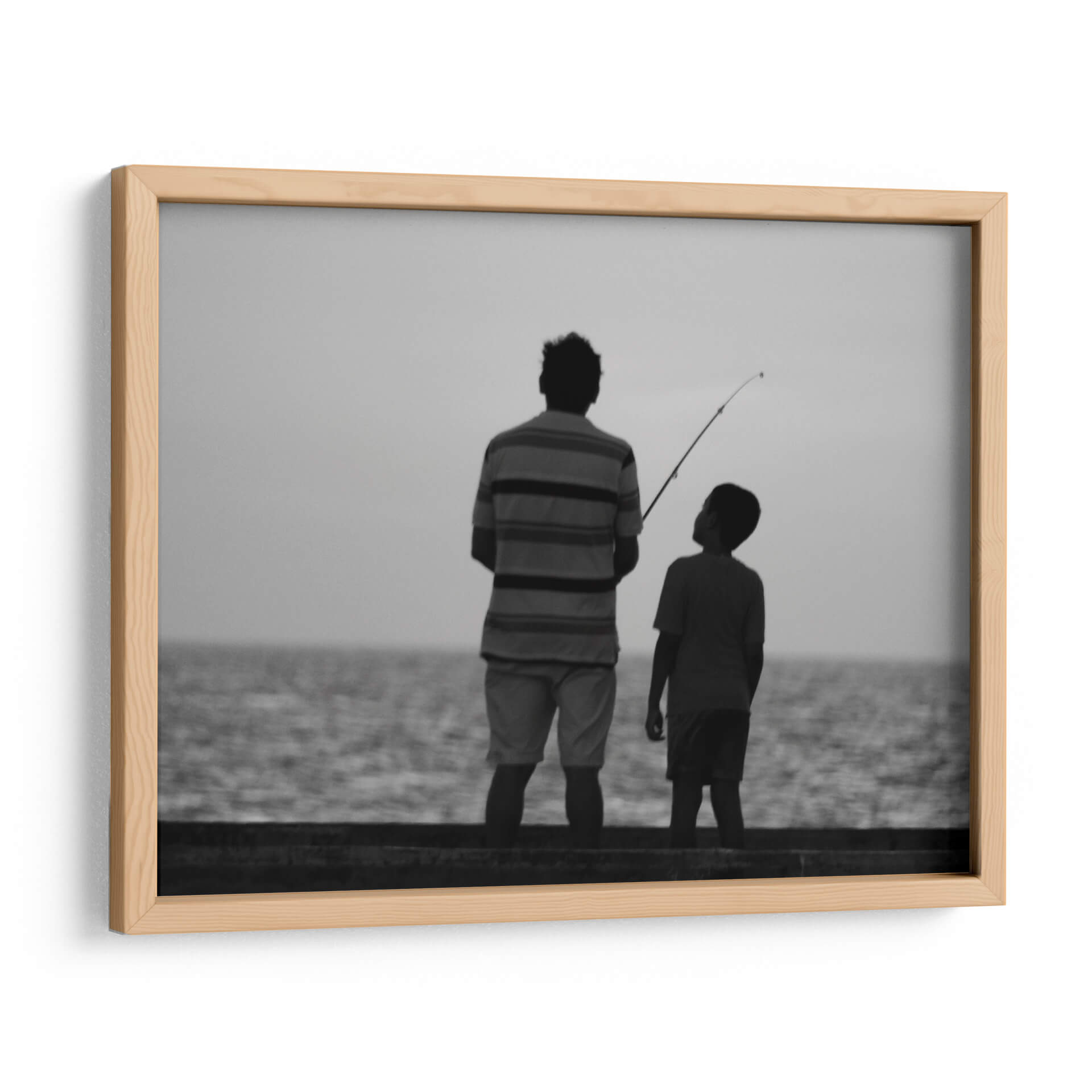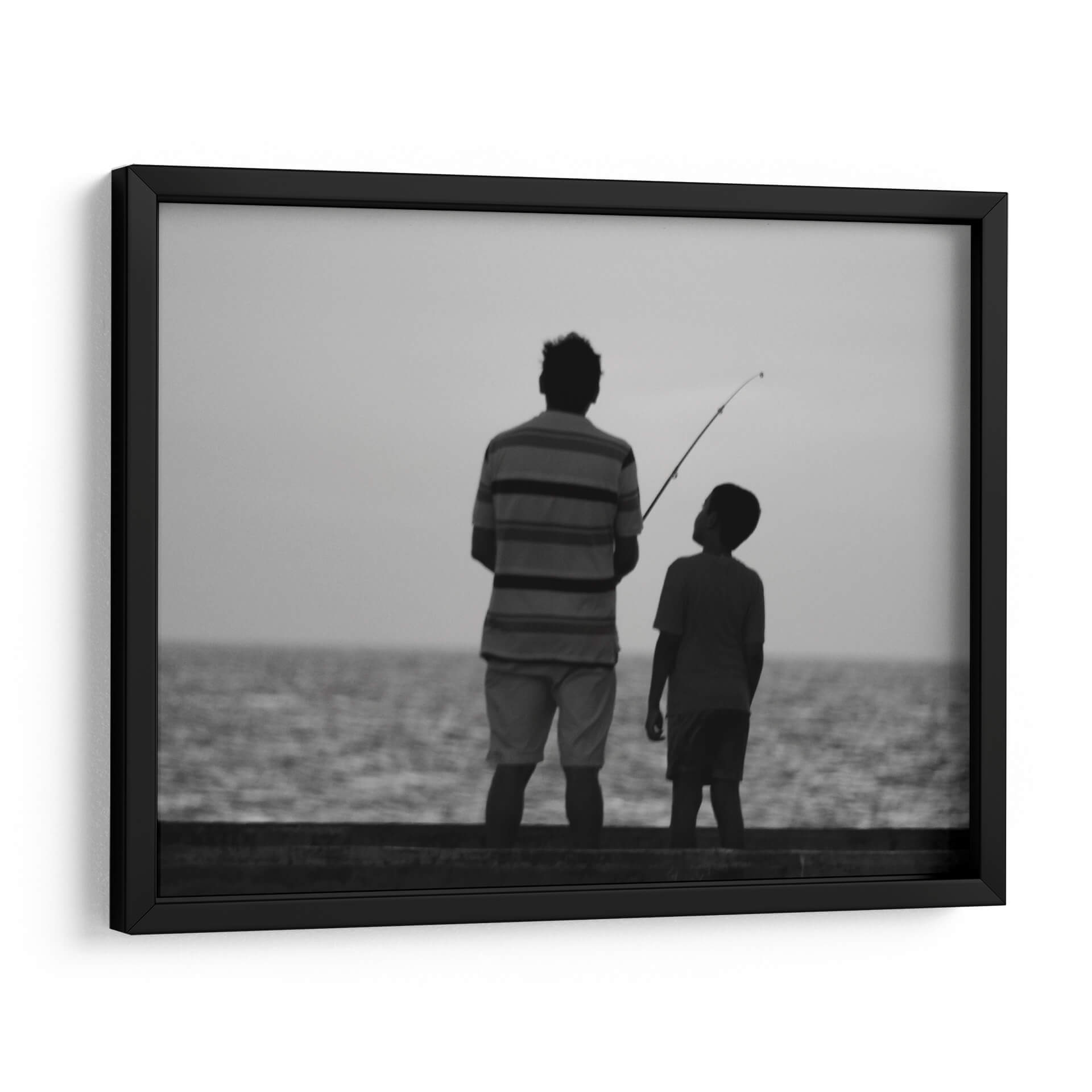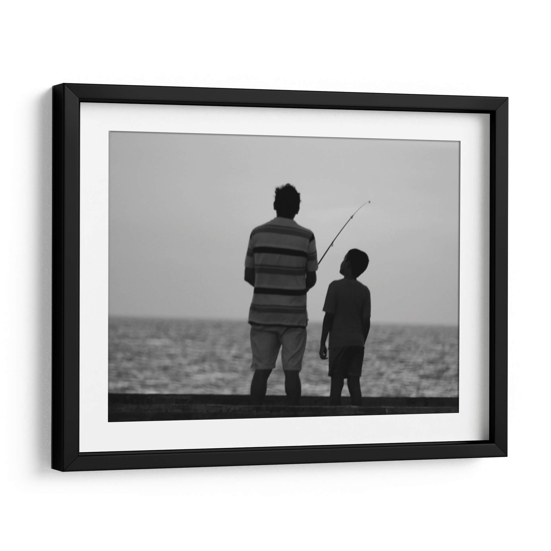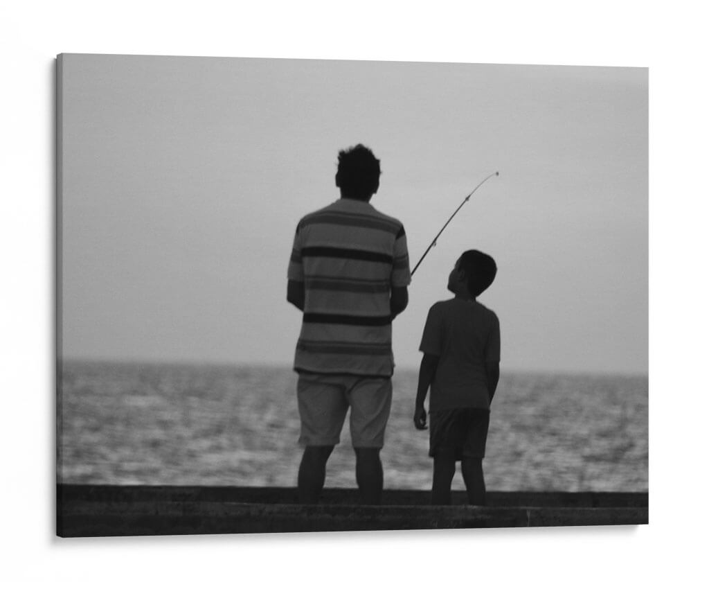 Sumérgete en la ternura y la nostalgia con "Días de miel", una conmovedora obra de arte de Hugo Segura que captura un momento íntimo entre un padre y su hijo. Esta pieza, presentada en una estética monocromática que evoca una atmósfera atemporal y serena, muestra a dos figuras de espaldas, contemplando el horizonte marino mientras pescan. La delicada representación de la silueta del padre, con su camiseta a rayas, y la curiosidad reflejada en la mirada del niño hacia la caña de pescar, transmiten una profunda sensación de conexión intergeneracional y la belleza de los instantes sencillos. El uso de grises sutiles y el contraste entre las figuras y el vasto mar y cielo crean una composición equilibrada que invita a la reflexión y a la contemplación. "Días de miel" es ideal para añadir un toque de calidez, paz y significado a cualquier espacio, ya sea un salón acogedor, un dormitorio tranquilo o un estudio personal. Este cuadro decorativo es perfecto para quienes buscan una pieza que hable de recuerdos, familia y la tranquilidad de los momentos compartidos, transformando tu hogar en un refugio de emociones positivas. Descubre la obra de Hugo Segura y deja que "Días de miel" inspire tus días.
