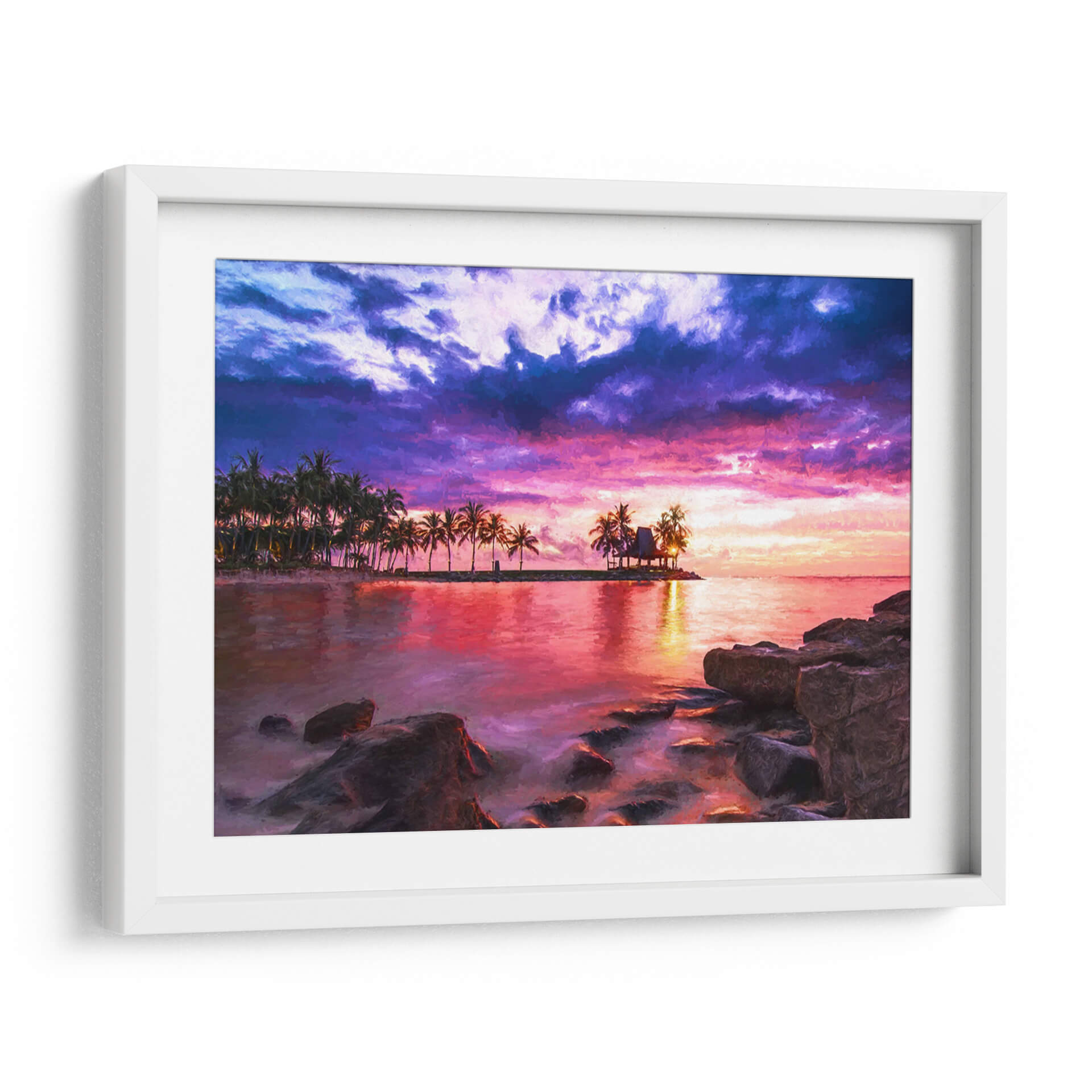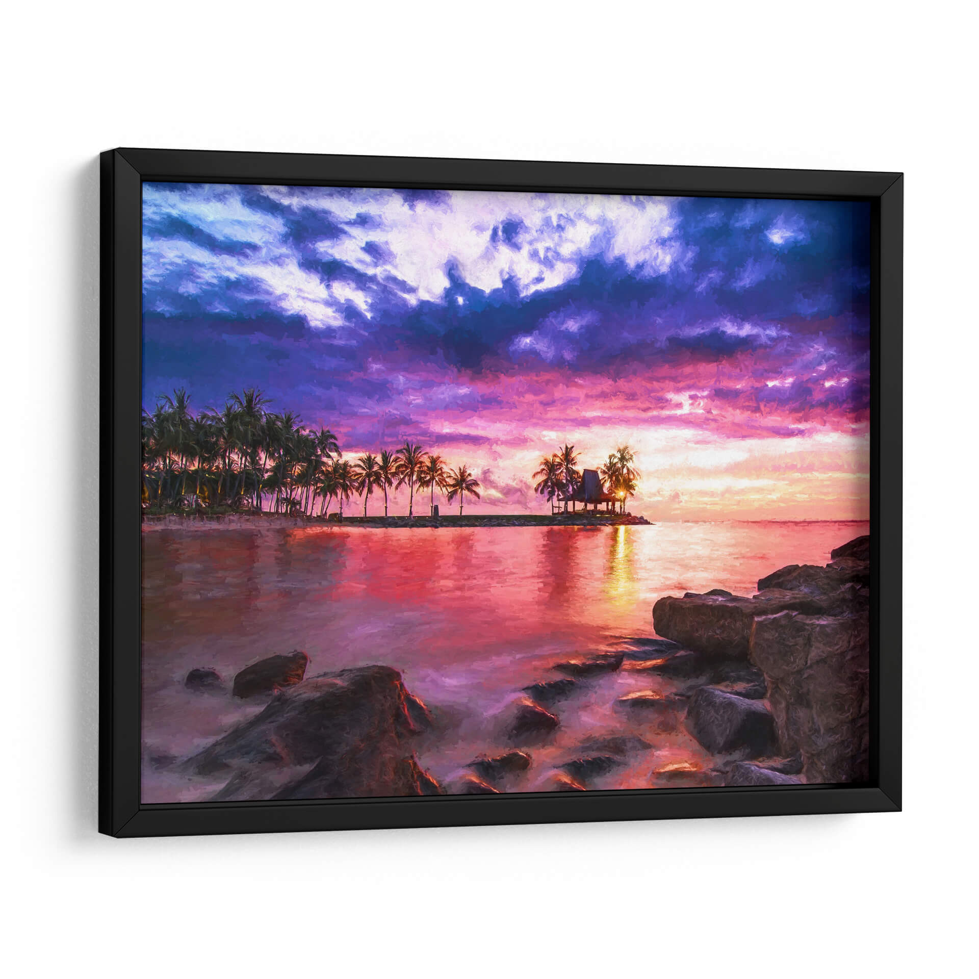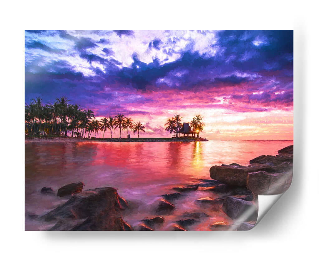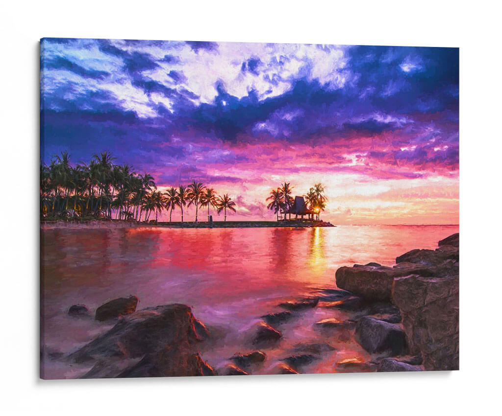 Sumérgete en la serenidad y el drama de "El Mar 1", una obra de Marcos Rodríguez que captura un atardecer tropical vibrante. Esta pieza evoca la tranquilidad de un paraíso costero, con una paleta de colores intensos que fusiona púrpuras profundos, rosas eléctricos y naranjas cálidos en un cielo tormentoso que contrasta con la calma reflejada en el agua. La silueta de palmeras y una cabaña en una pequeña isla añaden un toque exótico y de ensueño a la composición. Las rocas en primer plano brindan una sensación de anclaje y realismo a la escena, mientras que el estilo pictórico aporta una textura visual rica y expresiva. Ideal para transformar cualquier espacio en un refugio de paz y belleza, este cuadro decorativo es perfecto para salones, dormitorios o estudios que buscan una conexión con la naturaleza y una atmósfera de evasión. La obra invita a la contemplación, transportando al espectador a un momento de pura magia natural, donde el día se despide con un espectáculo de luz y color inolvidable. Añade una dosis de escapismo y elegancia a tu hogar con este impresionante paisaje marino.