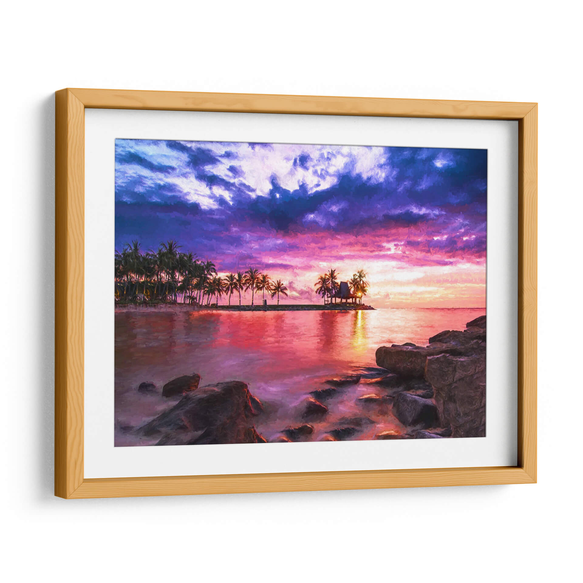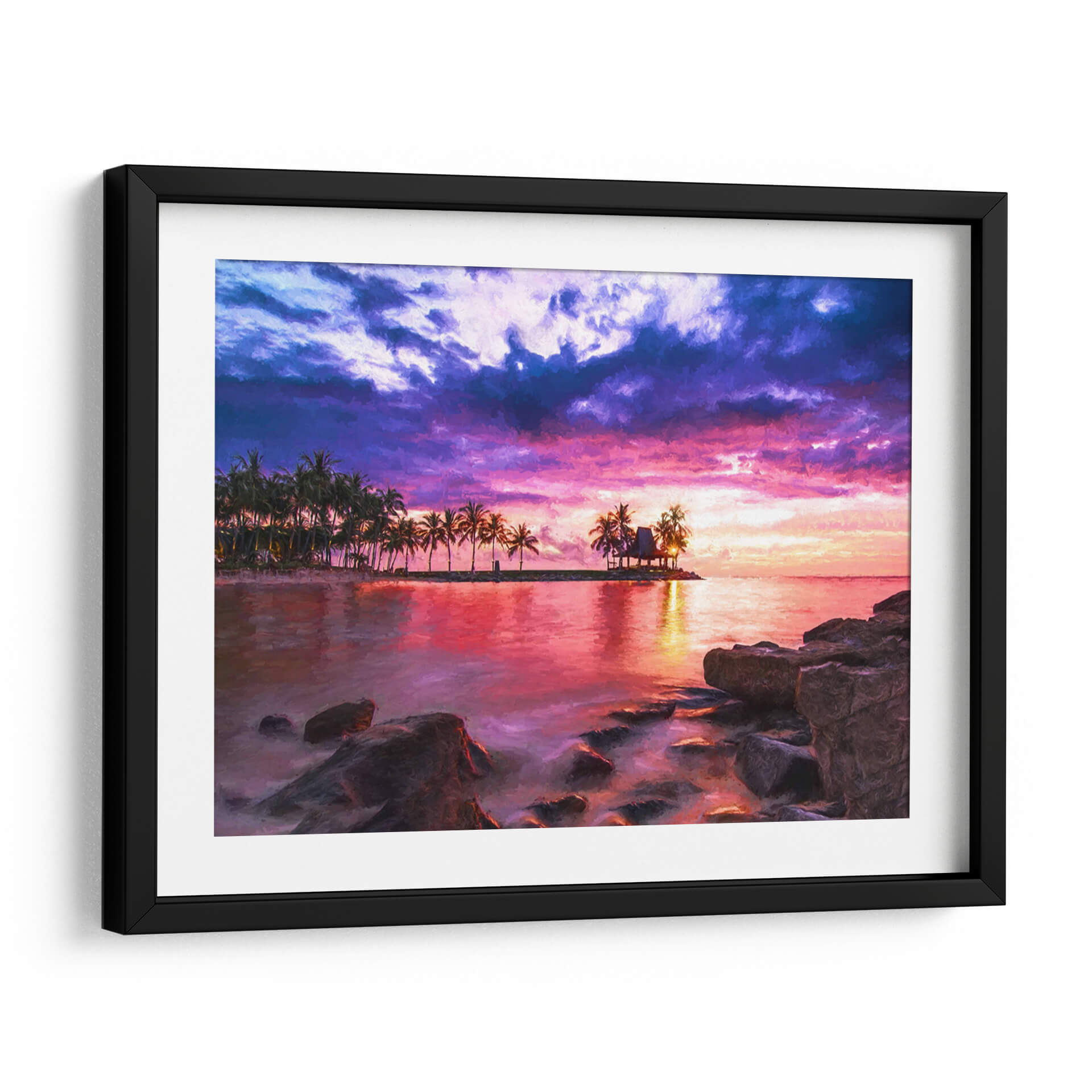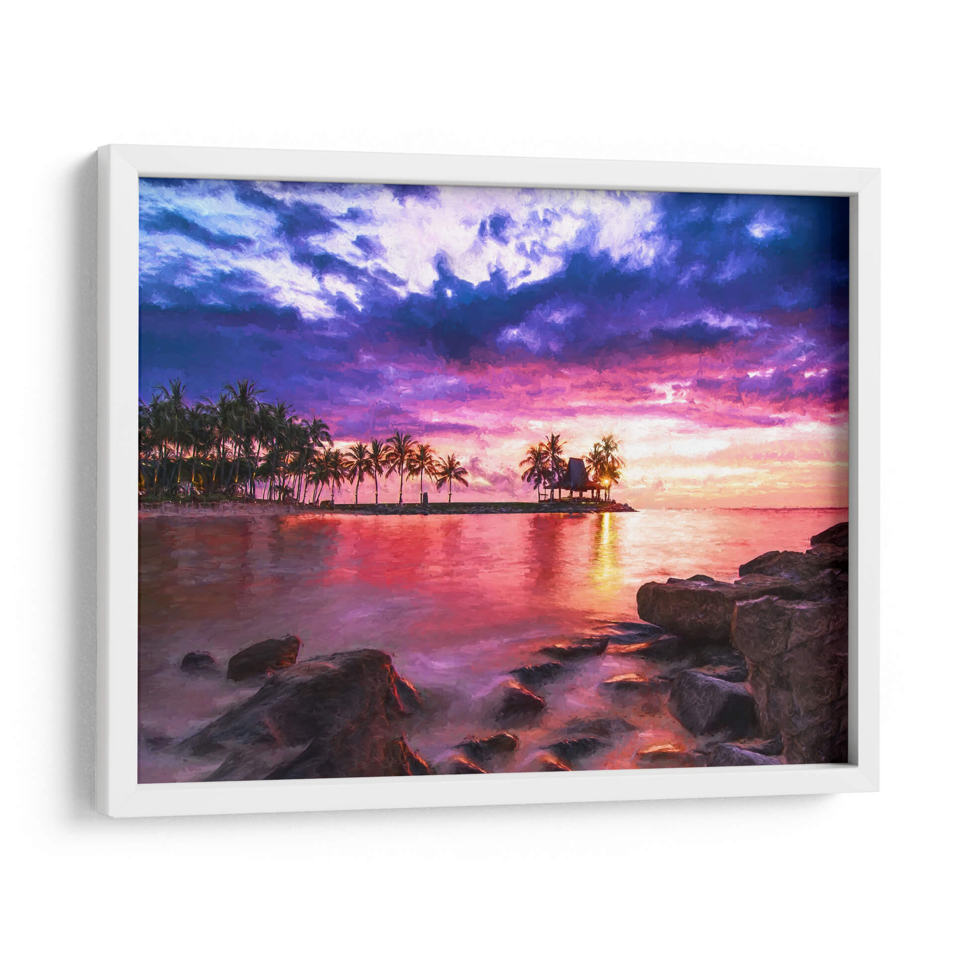 Sumérgete en la serenidad y el drama de "El Mar 1", una obra de Marcos Rodríguez que captura un atardecer tropical vibrante. Esta pieza evoca la tranquilidad de un paraíso costero, con una paleta de colores intensos que fusiona púrpuras profundos, rosas eléctricos y naranjas cálidos en un cielo tormentoso que contrasta con la calma reflejada en el agua. La silueta de palmeras y una cabaña en una pequeña isla añaden un toque exótico y de ensueño a la composición. Las rocas en primer plano brindan una sensación de anclaje y realismo a la escena, mientras que el estilo pictórico aporta una textura visual rica y expresiva. Ideal para transformar cualquier espacio en un refugio de paz y belleza, este cuadro decorativo es perfecto para salones, dormitorios o estudios que buscan una conexión con la naturaleza y una atmósfera de evasión. La obra invita a la contemplación, transportando al espectador a un momento de pura magia natural, donde el día se despide con un espectáculo de luz y color inolvidable. Añade una dosis de escapismo y elegancia a tu hogar con este impresionante paisaje marino.