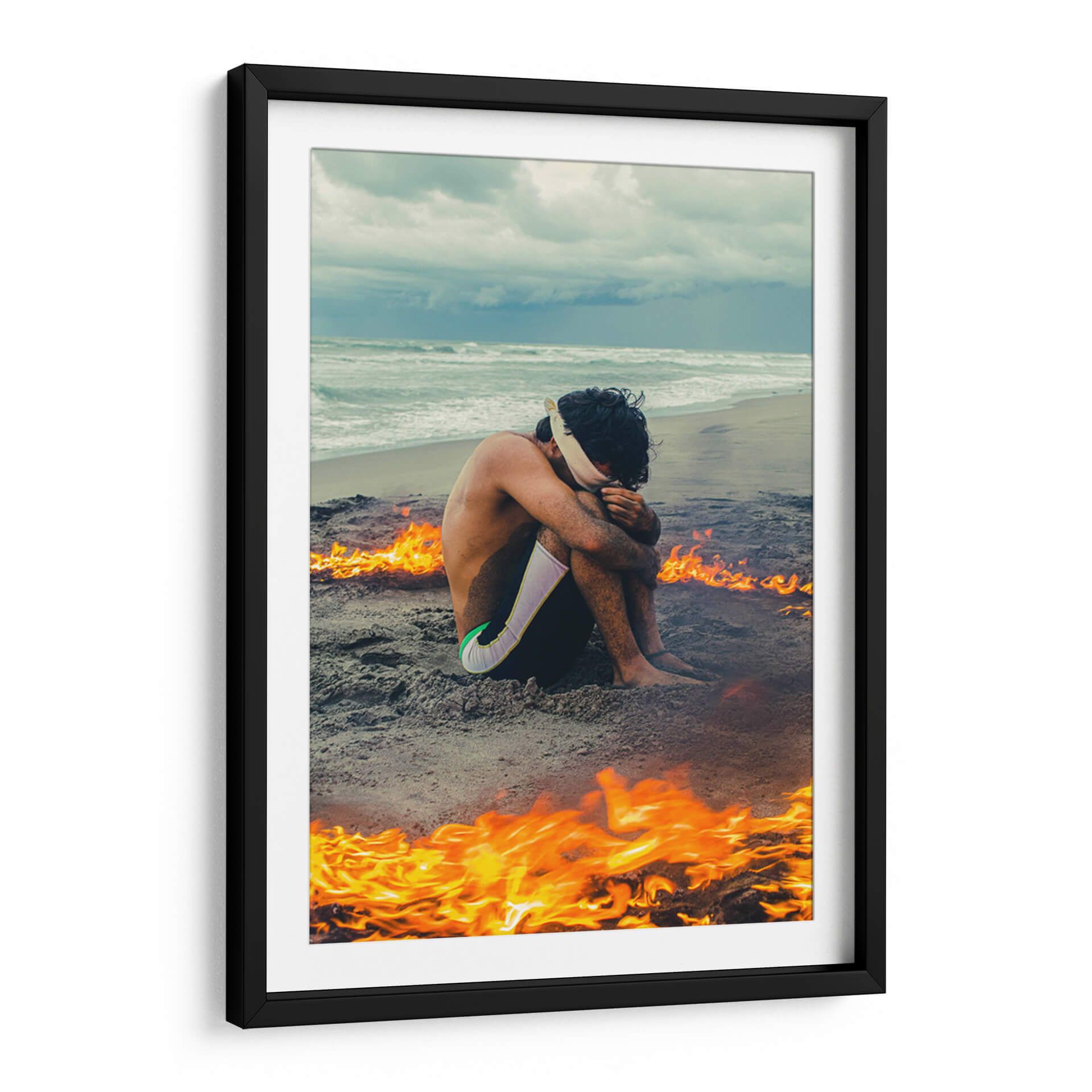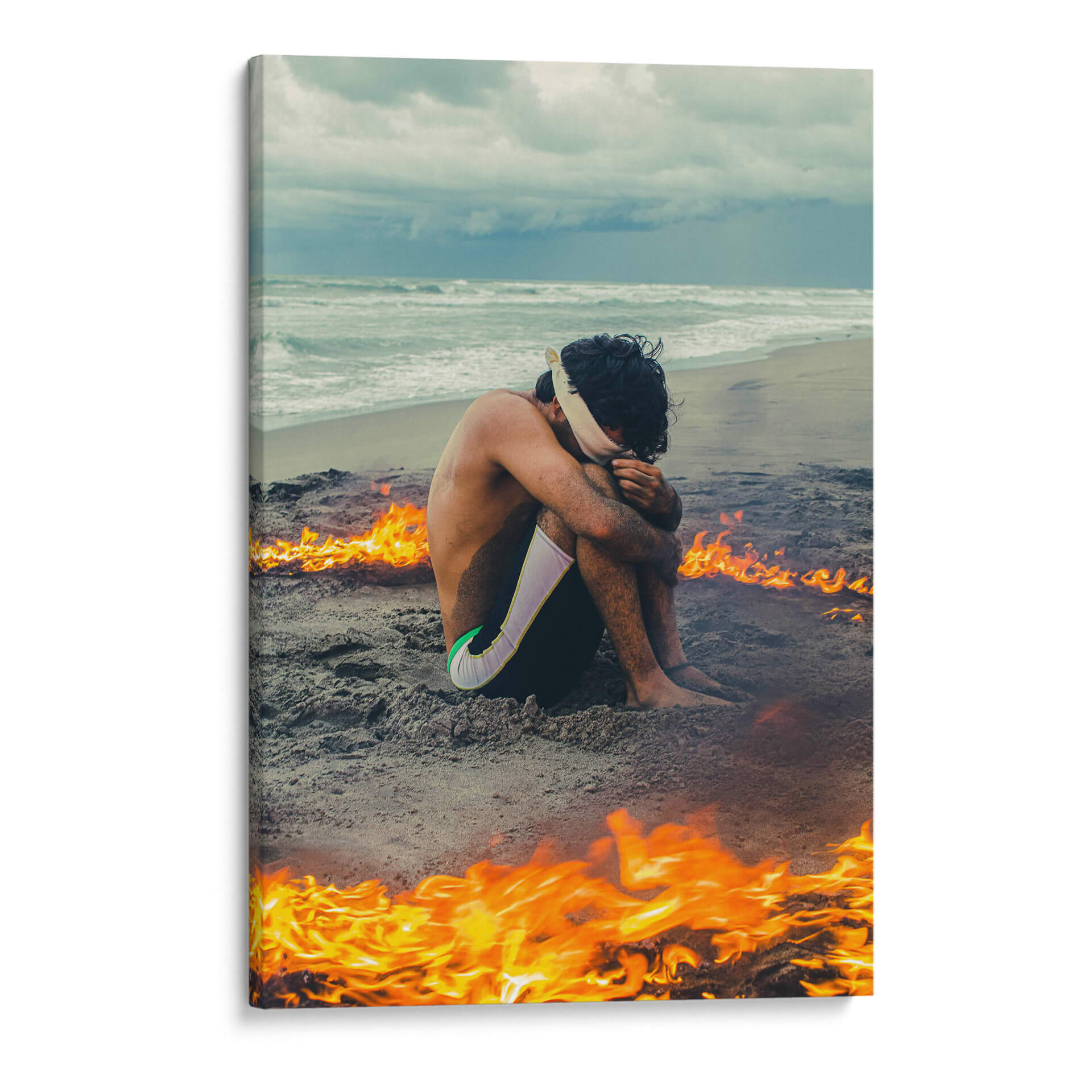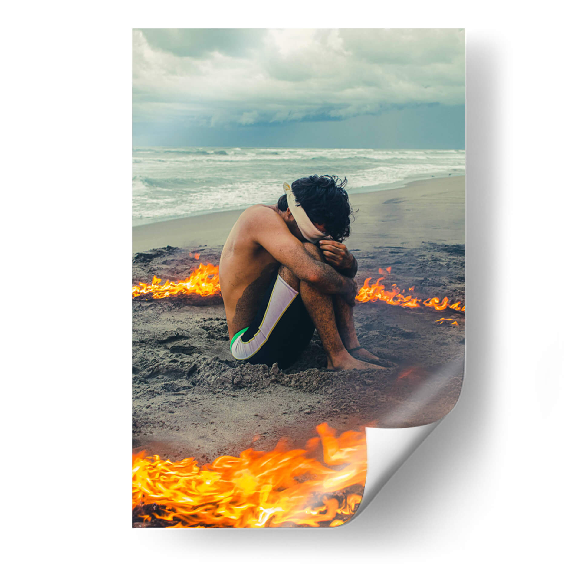Sumérgete en la cruda emotividad de "Miedo", una obra de arte contemporáneo que captura un instante de profunda introspección y vulnerabilidad. La imagen presenta a una figura humana acurrucada en la arena de una playa desolada, rodeada por un círculo de llamas intensas que contrastan dramáticamente con el cielo nublado y el oleaje del mar al fondo. Los colores son sombríos y evocadores, con tonos grises y azules en el cielo y el mar, que resaltan la calidez ardiente del fuego y la palidez de la piel. La composición es potente, centrada en la figura solitaria, transmitiendo una sensación de aislamiento y confrontación interna. Este cuadro decorativo es ideal para espacios que buscan un toque de dramatismo y reflexión, como un estudio o una sala de estar moderna, invitando a la contemplación sobre las batallas internas. Su estilo, que podría interpretarse como surrealista o conceptual, ofrece una pieza de conversación única que resuena con la complejidad de la experiencia humana. Añade una dimensión de profundidad emocional a tu decoración con esta impactante representación artística.