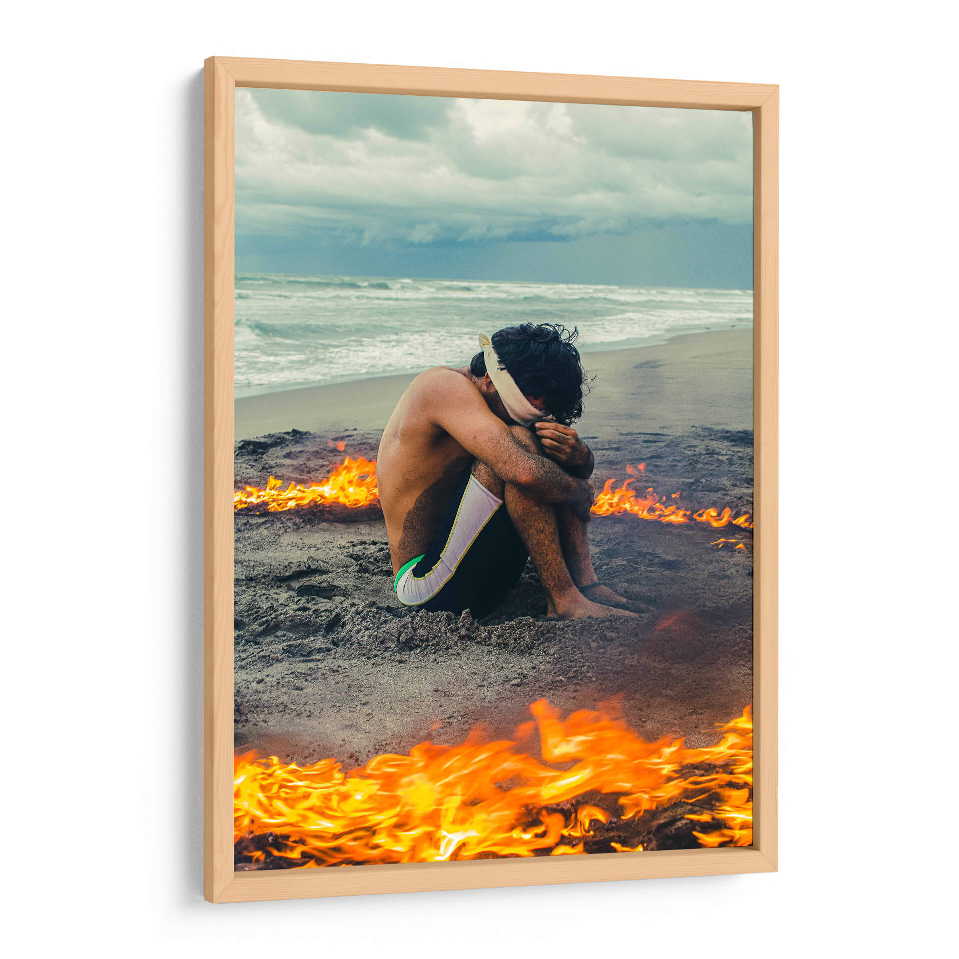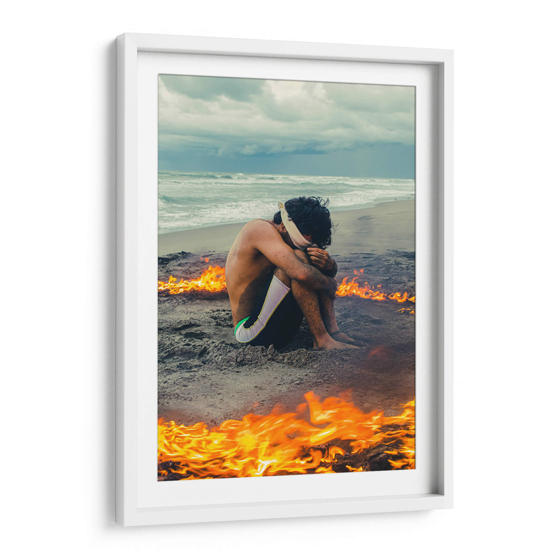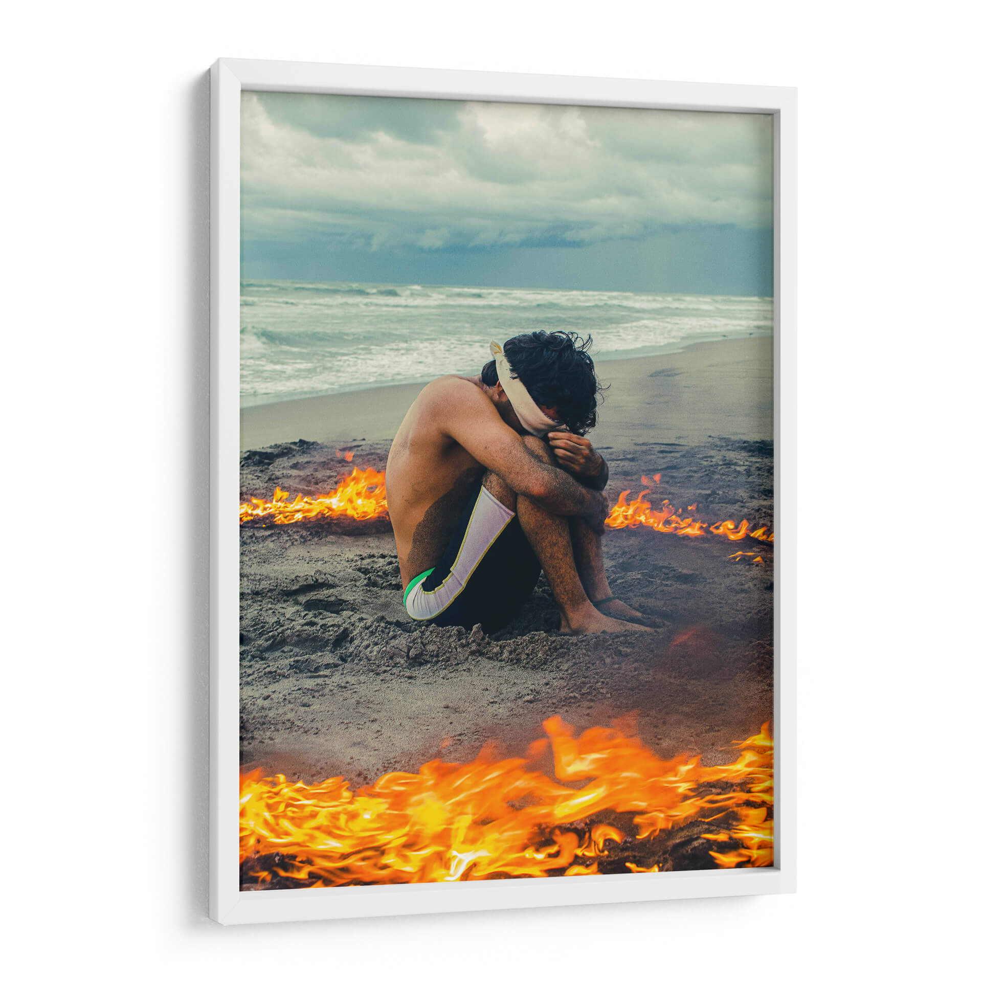 Sumérgete en la cruda emotividad de "Miedo", una obra de arte contemporáneo que captura un instante de profunda introspección y vulnerabilidad. La imagen presenta a una figura humana acurrucada en la arena de una playa desolada, rodeada por un círculo de llamas intensas que contrastan dramáticamente con el cielo nublado y el oleaje del mar al fondo. Los colores son sombríos y evocadores, con tonos grises y azules en el cielo y el mar, que resaltan la calidez ardiente del fuego y la palidez de la piel. La composición es potente, centrada en la figura solitaria, transmitiendo una sensación de aislamiento y confrontación interna. Este cuadro decorativo es ideal para espacios que buscan un toque de dramatismo y reflexión, como un estudio o una sala de estar moderna, invitando a la contemplación sobre las batallas internas. Su estilo, que podría interpretarse como surrealista o conceptual, ofrece una pieza de conversación única que resuena con la complejidad de la experiencia humana. Añade una dimensión de profundidad emocional a tu decoración con esta impactante representación artística.