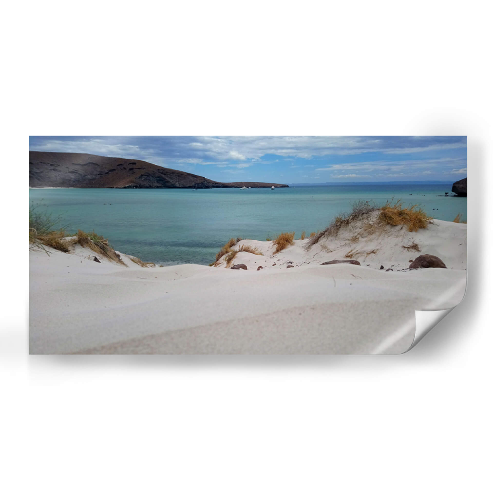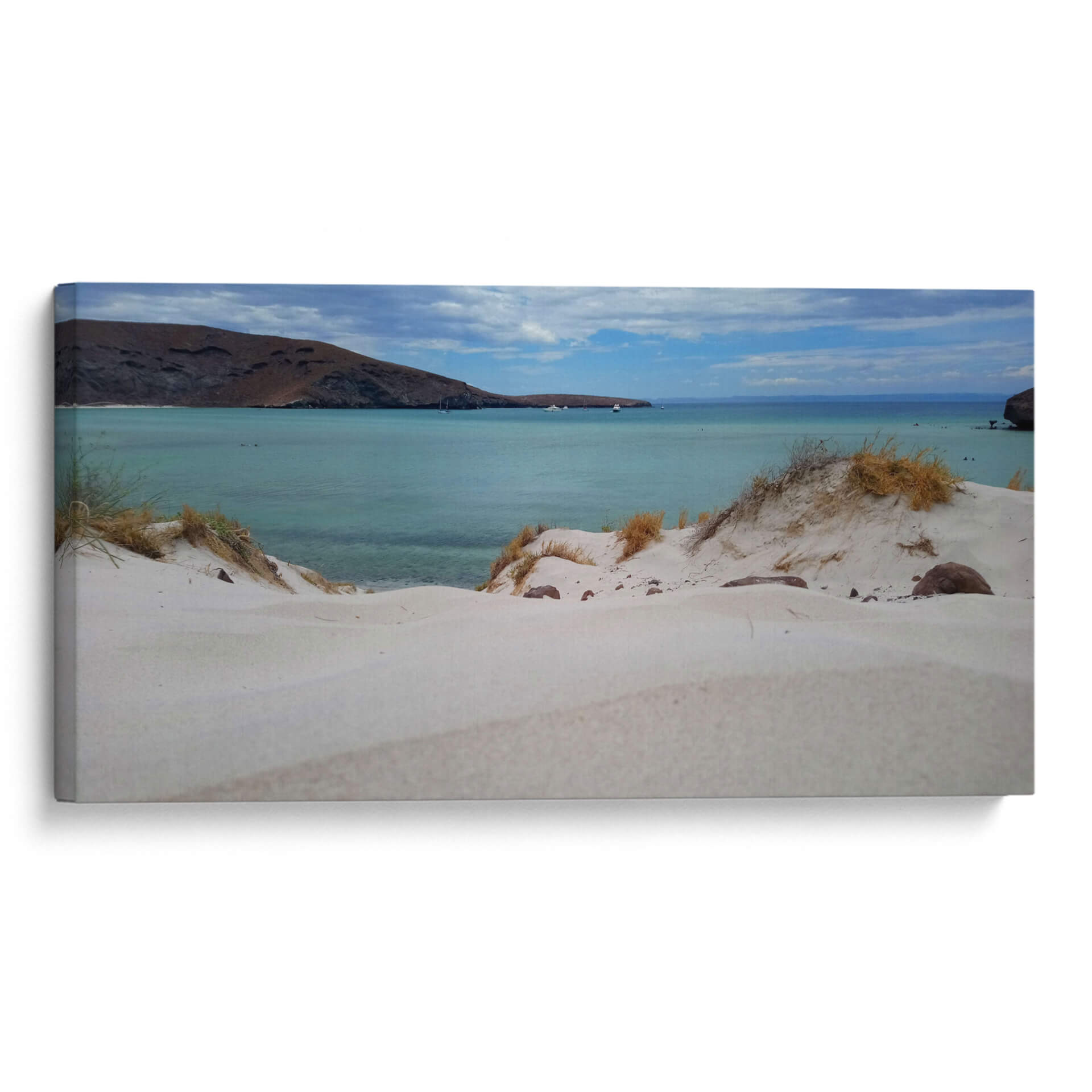 Sumérgete en la tranquilidad de 'Paz en Playa Balandra', una obra de arte que captura la serena belleza de un paisaje costero. El cuadro presenta una vista panorámica desde las dunas de arena blanca, descendiendo suavemente hacia unas aguas turquesas cristalinas. En el horizonte, se distingue una masa de tierra oscura y montañosa que contrasta con el cielo azul y las nubes dispersas. Pequeñas embarcaciones navegan pacíficamente en la distancia, añadiendo un toque de vida a la escena. La paleta de colores se centra en tonos azules y verdes acuáticos, complementados por los ocres cálidos de la vegetación seca en las dunas y los tonos tierra de la montaña. La composición, con las dunas en primer plano creando un marco natural, guía la mirada hacia el mar infinito y el cielo, evocando una profunda sensación de calma y escapismo. Este cuadro decorativo es ideal para infundir serenidad en cualquier espacio, desde un dormitorio hasta una sala de estar o una oficina que busque un refugio visual de la vida cotidiana. Las texturas sutiles de la arena y el agua invitan a la contemplación, haciendo de esta pieza un recordatorio constante de la majestuosidad y la paz que ofrece la naturaleza.