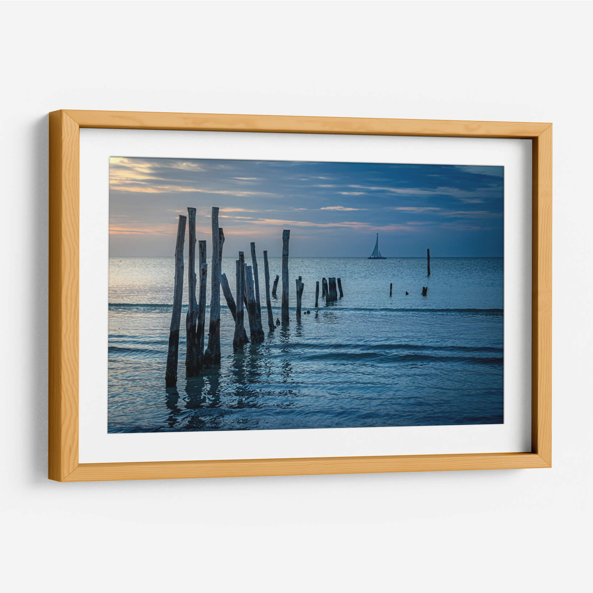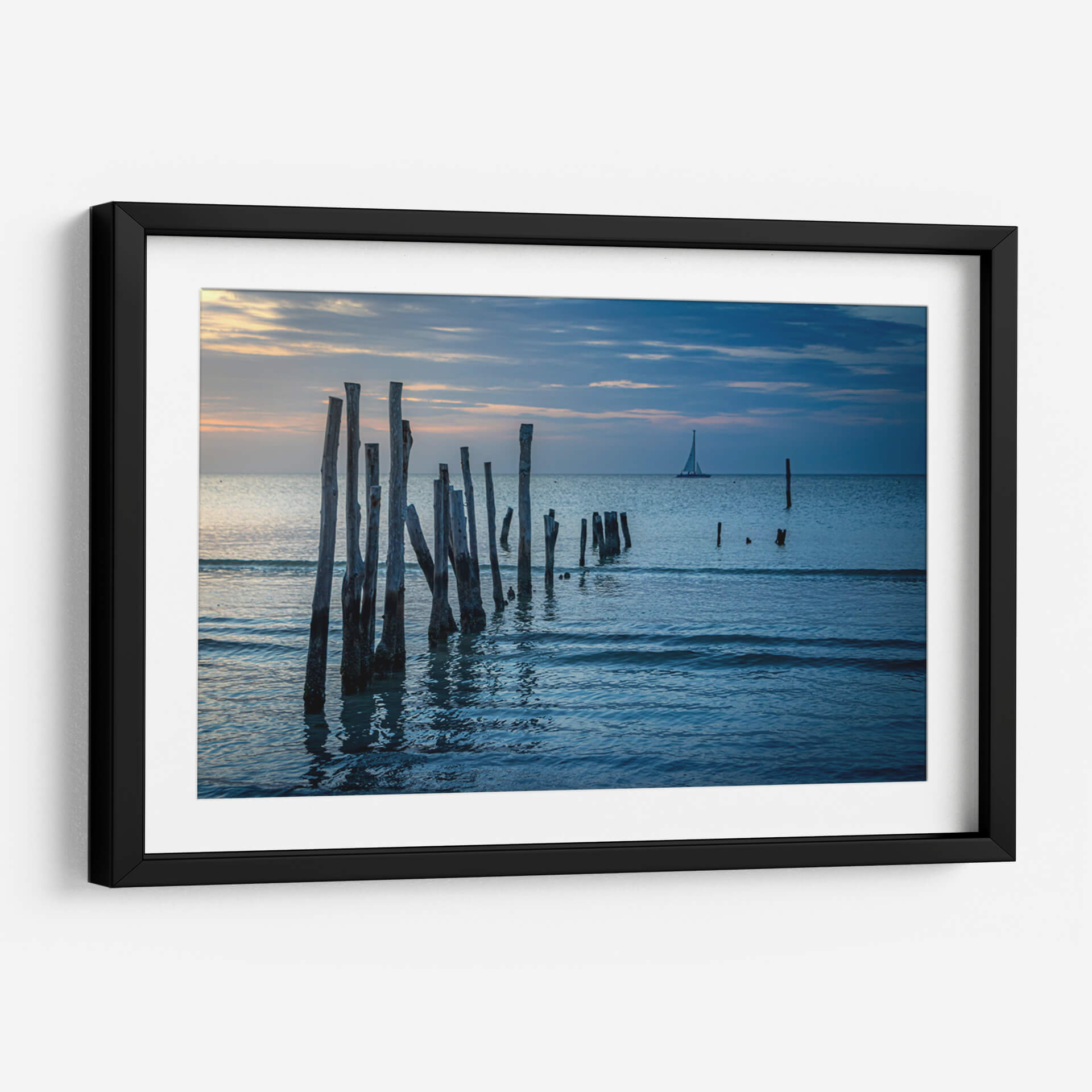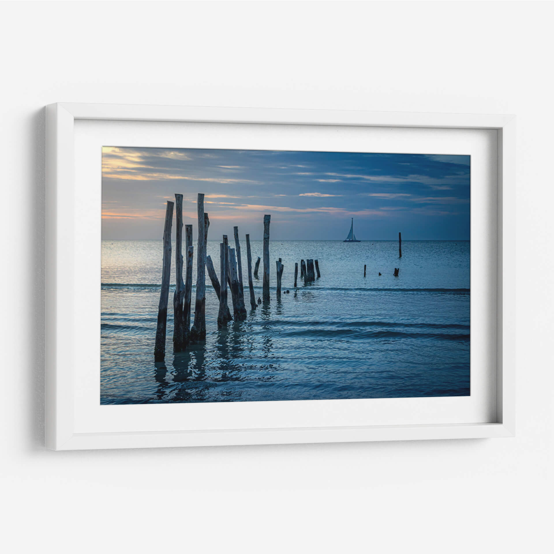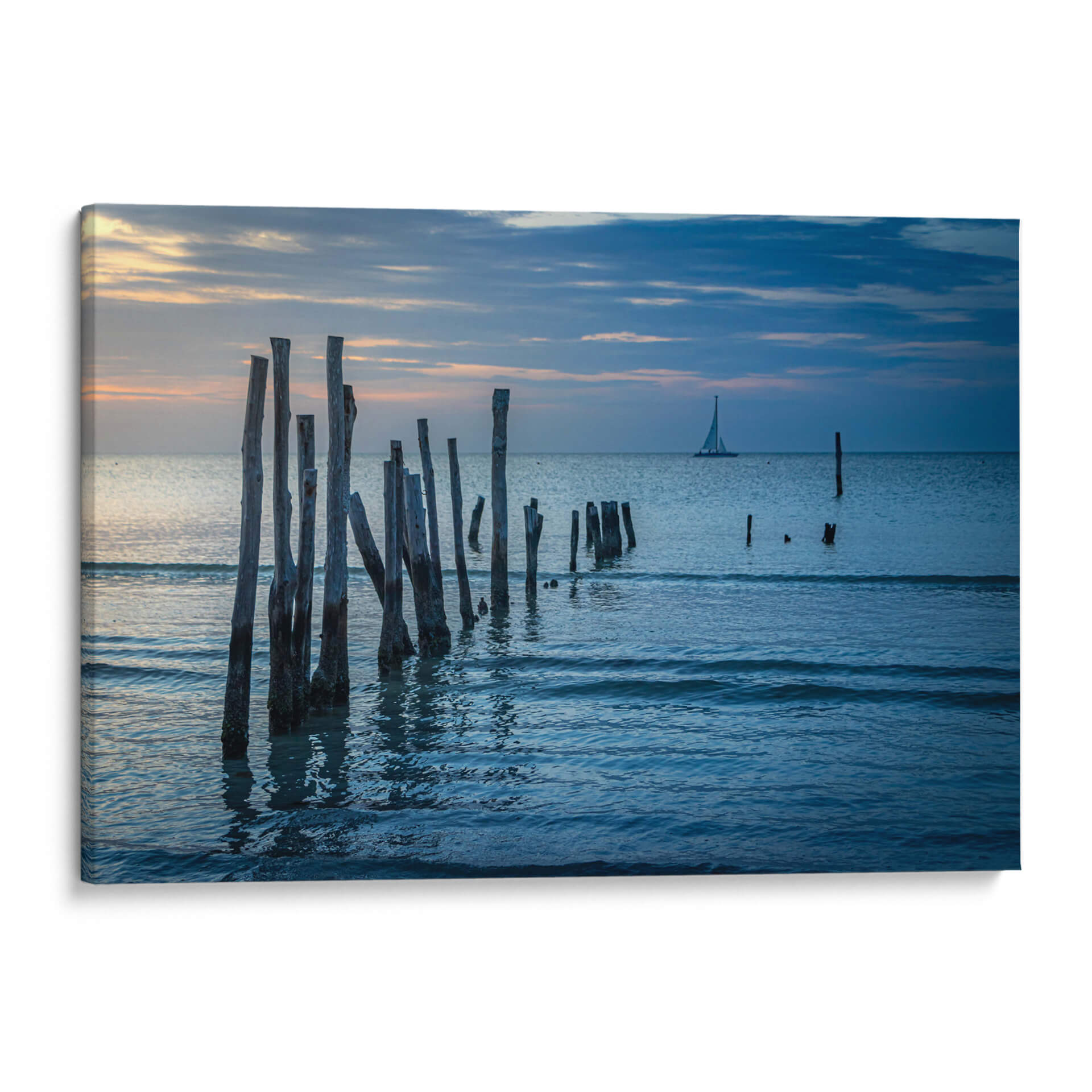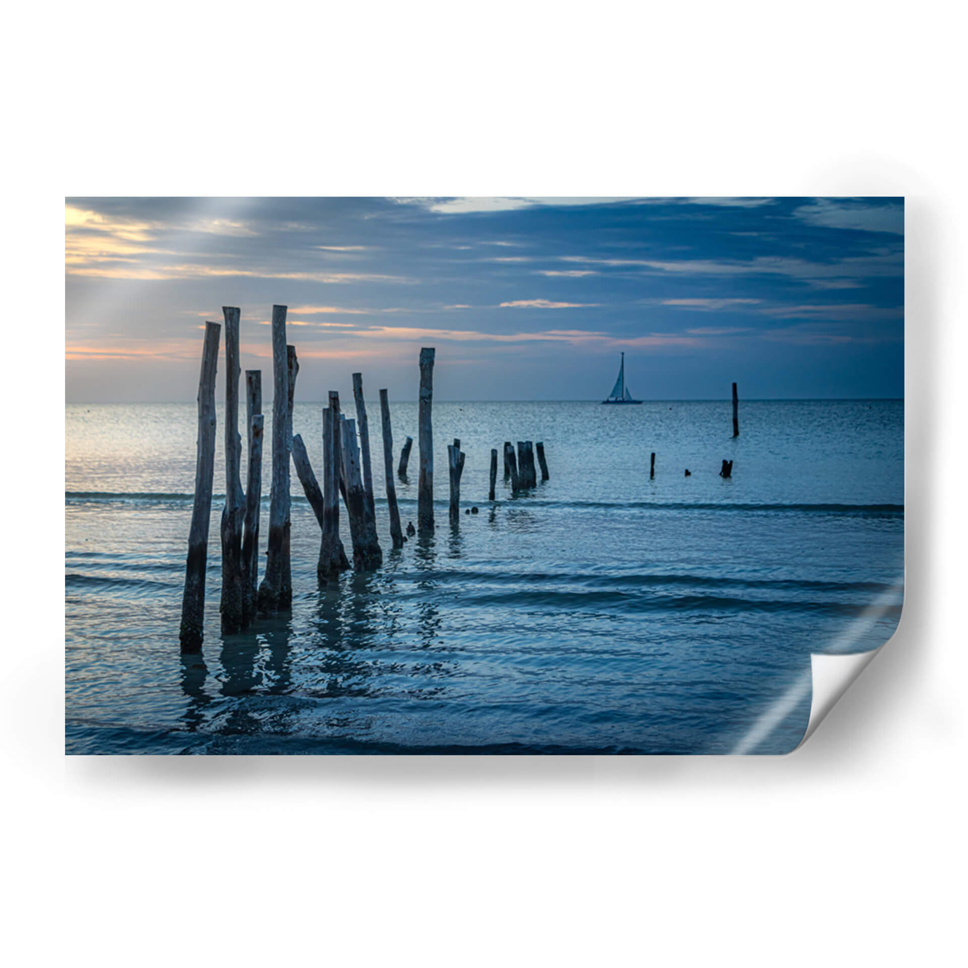 Sumérgete en la serenidad del océano con "Pilares del Mar" de Ulises Páez. Esta cautivadora obra de arte mural captura un momento de tranquilidad al atardecer, donde los restos de pilares de madera emergen majestuosamente del agua azul profunda. La luz suave del crepúsculo tiñe el cielo de tonos cálidos y fríos, creando un contraste atmosférico con la inmensidad del mar y la silueta distante de un velero. La composición, que equilibra la solidez de los pilares con la fluidez del agua, evoca una sensación de paz y contemplación. Cada pincelada o detalle digital en esta pieza parece invitar a la reflexión, transportando al espectador a un lugar de calma y escapismo. "Pilares del Mar" es ideal para quienes buscan añadir un toque de naturaleza serena y un punto focal evocador a su hogar u oficina. Este cuadro decorativo es perfecto para salones, dormitorios o estudios, aportando una atmósfera de relajación y sofisticación. Descubre la belleza atemporal de los paisajes marinos y deja que esta obra inspire momentos de paz en tu día a día.