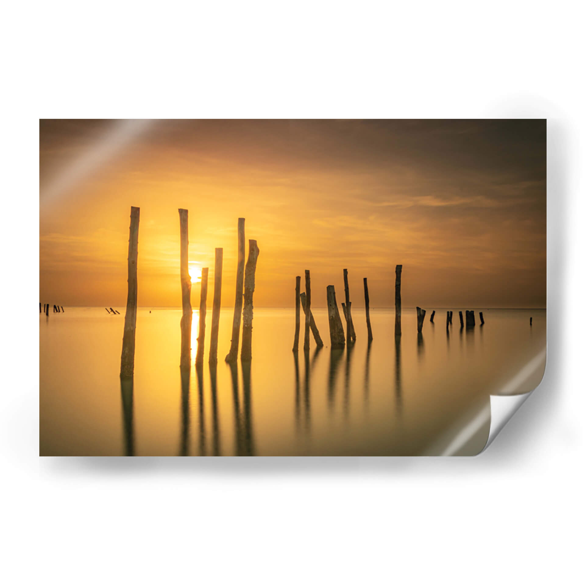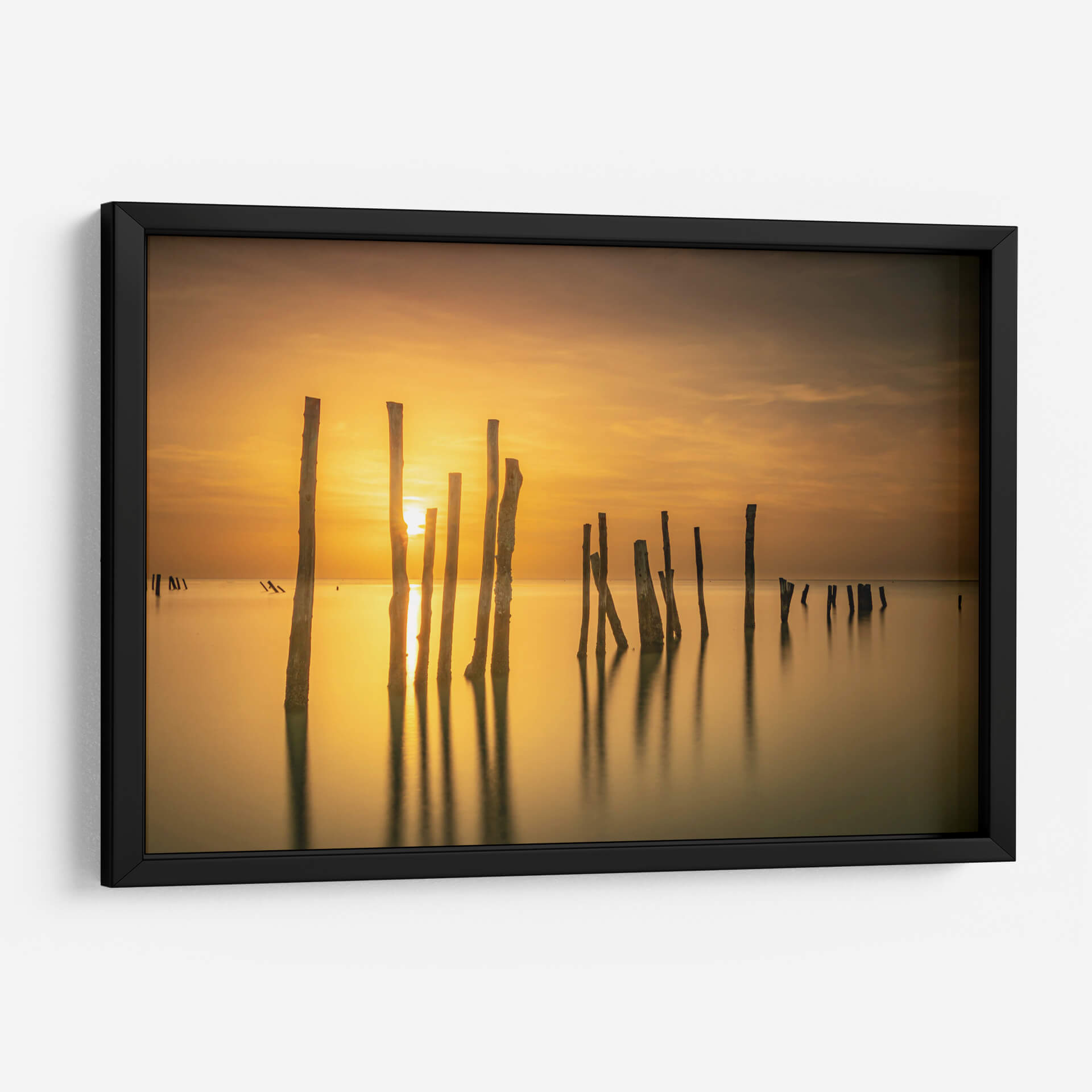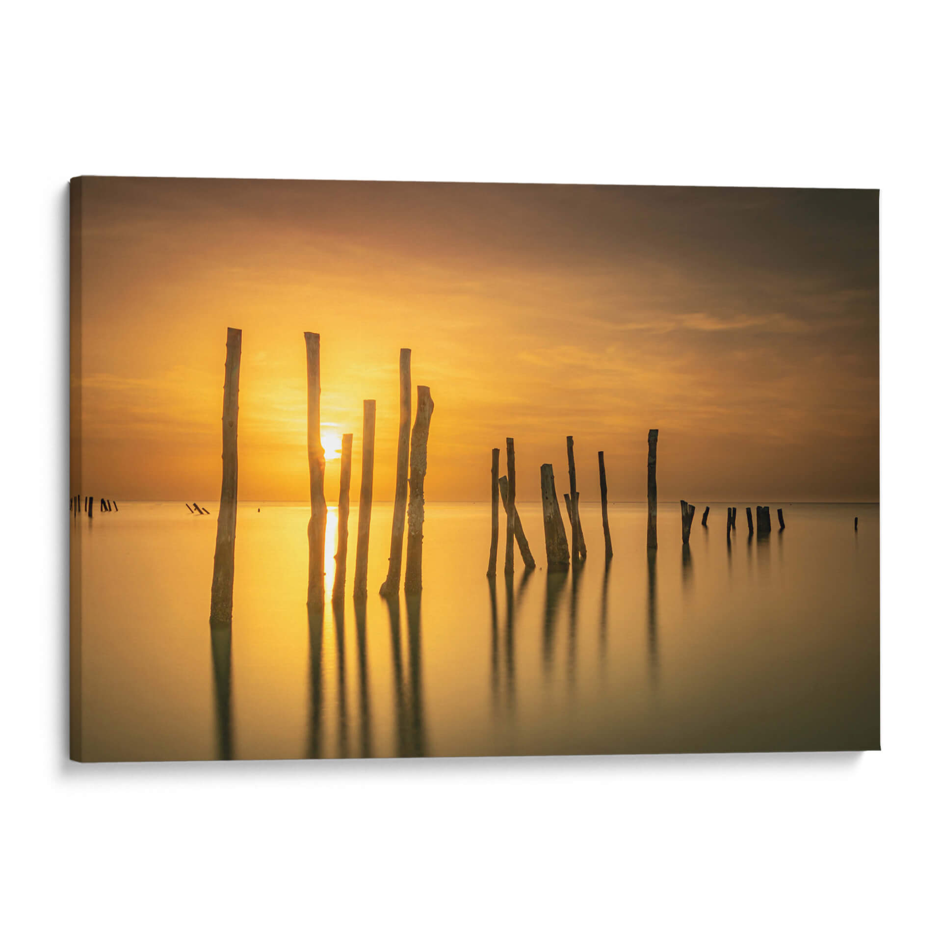 Captura la serenidad del amanecer o atardecer con este evocador cuadro decorativo, 'Sol entre mar y madera' de Ulises Páez. La obra presenta una composición minimalista de pilares de madera emergiendo de aguas tranquilas, bañados por la cálida luz dorada de un sol naciente o poniente. Las sutiles nubes en el cielo añaden profundidad a la escena, mientras que los reflejos de los pilares en el agua crean un efecto hipnótico. La paleta de colores, dominada por tonos ámbar, dorados y marrones suaves, transmite una sensación de paz y calma, ideal para espacios que buscan un oasis de tranquilidad. Este cuadro decorativo es perfecto para salones, dormitorios o estudios, aportando un toque de naturaleza serena y elegancia atemporal. Su estilo, que fusiona elementos fotográficos con una atmósfera casi pictórica, lo convierte en una pieza versátil que complementará tanto decoraciones modernas como rústicas. Permite que la luz y la quietud de esta obra transformen tu hogar en un santuario personal, invitando a la reflexión y al bienestar. Una elección acertada para quienes aprecian la belleza sutil de los paisajes marinos y la fuerza expresiva de la luz.
