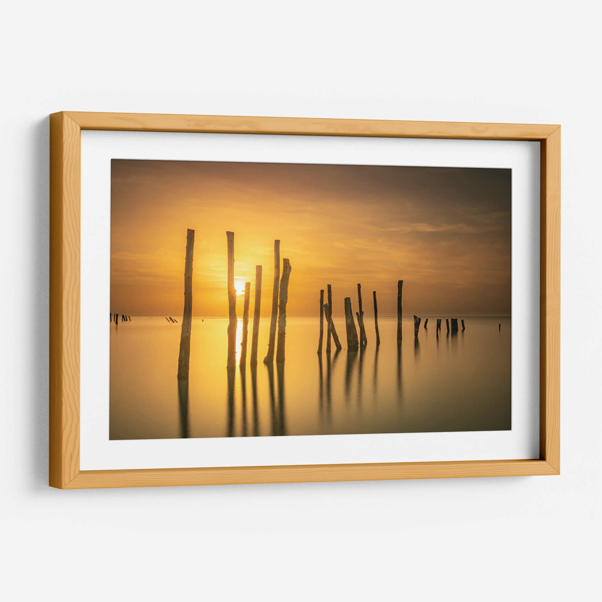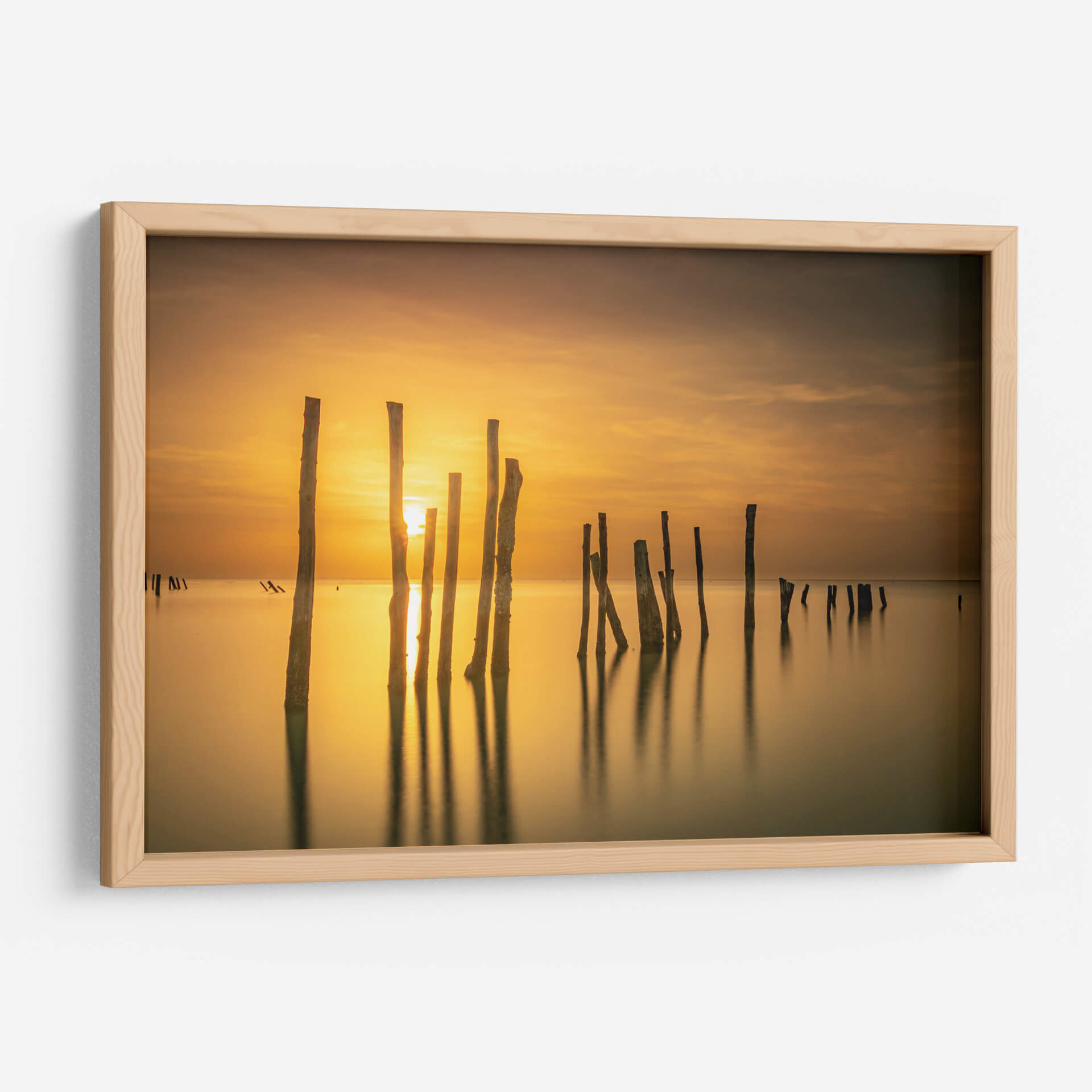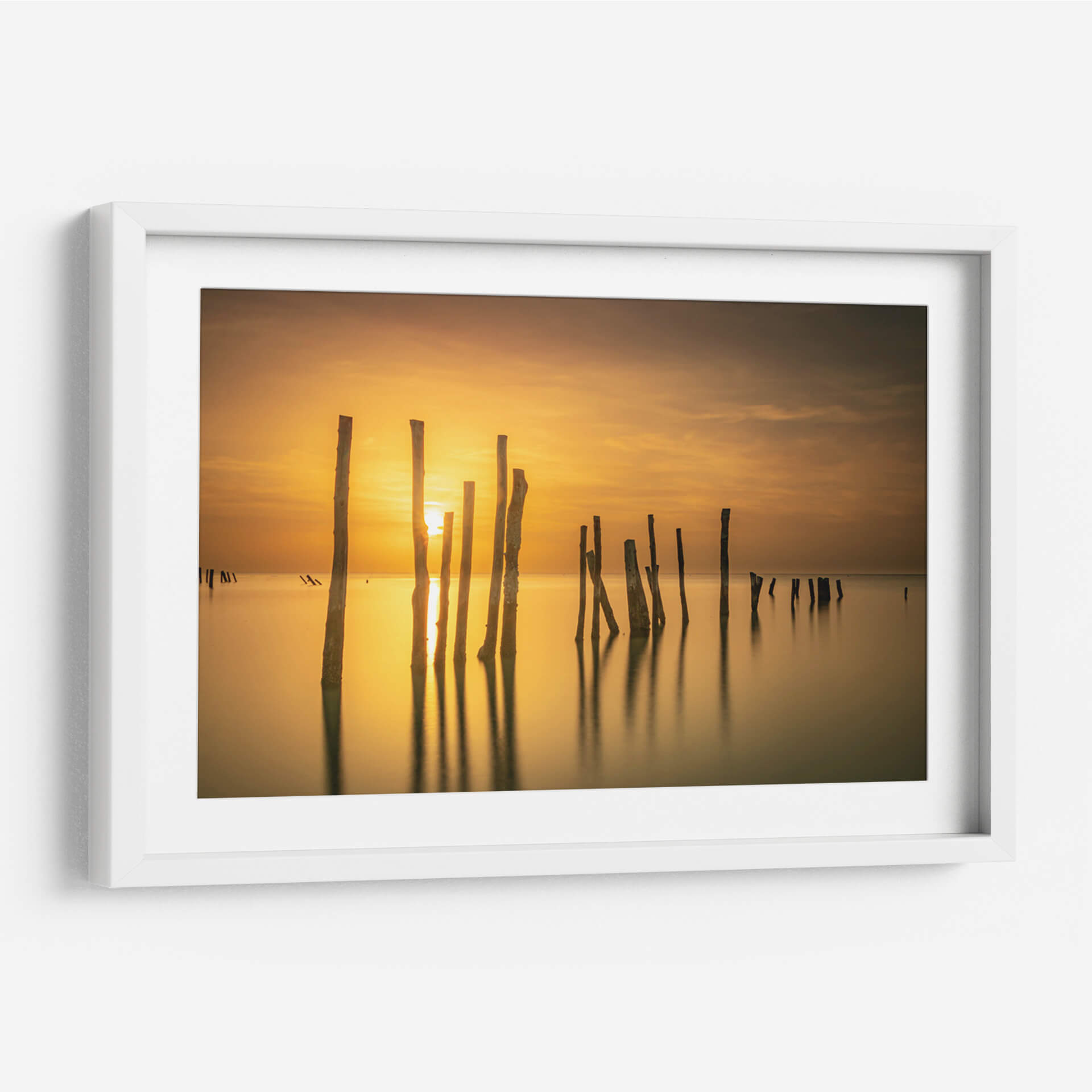 Captura la serenidad del amanecer o atardecer con este evocador cuadro decorativo, 'Sol entre mar y madera' de Ulises Páez. La obra presenta una composición minimalista de pilares de madera emergiendo de aguas tranquilas, bañados por la cálida luz dorada de un sol naciente o poniente. Las sutiles nubes en el cielo añaden profundidad a la escena, mientras que los reflejos de los pilares en el agua crean un efecto hipnótico. La paleta de colores, dominada por tonos ámbar, dorados y marrones suaves, transmite una sensación de paz y calma, ideal para espacios que buscan un oasis de tranquilidad. Este cuadro decorativo es perfecto para salones, dormitorios o estudios, aportando un toque de naturaleza serena y elegancia atemporal. Su estilo, que fusiona elementos fotográficos con una atmósfera casi pictórica, lo convierte en una pieza versátil que complementará tanto decoraciones modernas como rústicas. Permite que la luz y la quietud de esta obra transformen tu hogar en un santuario personal, invitando a la reflexión y al bienestar. Una elección acertada para quienes aprecian la belleza sutil de los paisajes marinos y la fuerza expresiva de la luz.