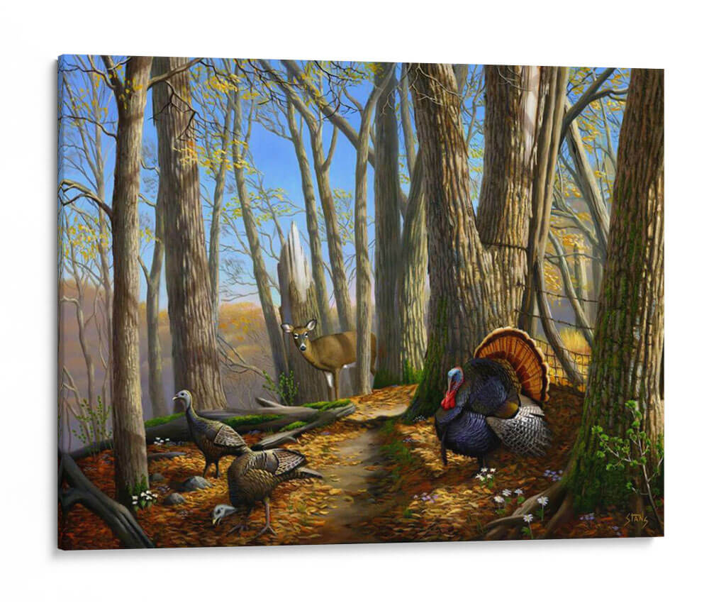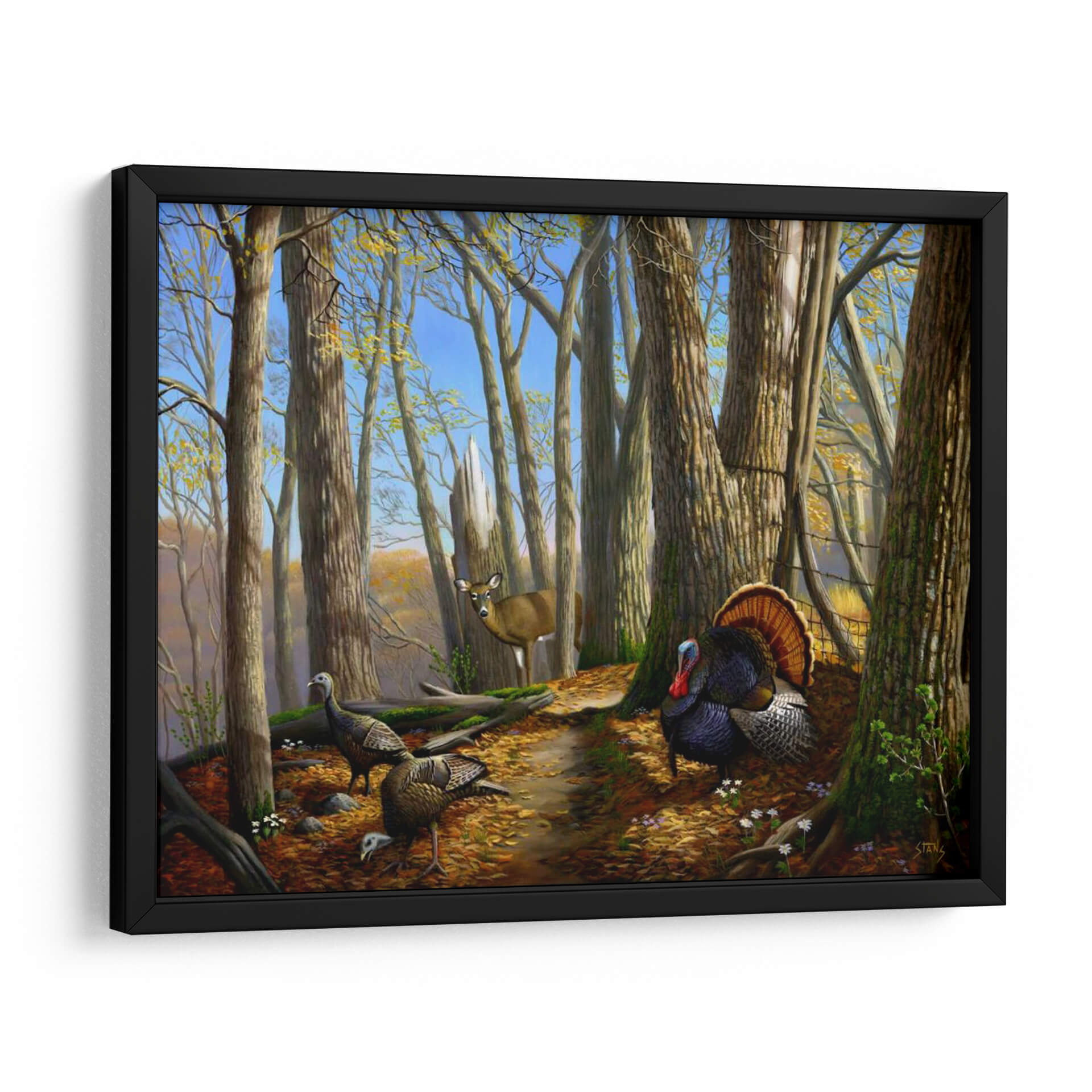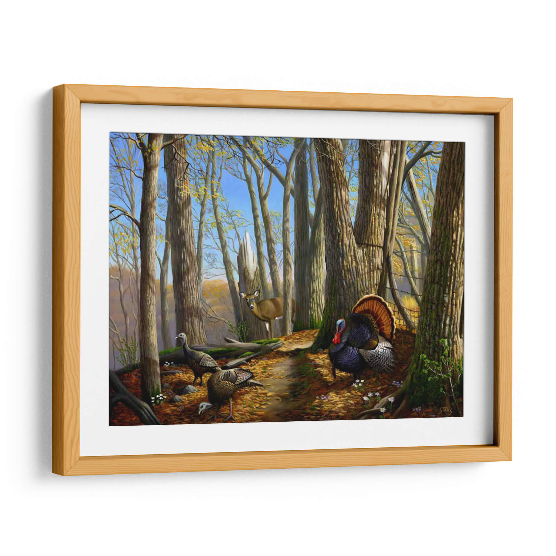 Sumérgete en la serenidad del bosque con "A Lo Largo De La Cerca", una obra maestra de Leo Stans que captura la esencia de la vida silvestre en su hábitat natural. Este cuadro decorativo te transporta a un sendero otoñal, donde la luz del sol se filtra entre las imponentes copas de los árboles, iluminando un escenario vibrante y detallado. La pieza presenta un pavo real en primer plano, con su plumaje desplegado en una exhibición de colores y texturas, acompañado por dos pavos más y un ciervo astuto que observa desde la espesura. La paleta de colores, dominada por tonos tierra, ocres, verdes profundos y un cielo azul claro, evoca una sensación de paz y conexión con la naturaleza. El realismo y la atención al detalle de Stans dan vida a cada hoja caída, a cada corteza de árbol y al movimiento sutil de los animales. "A Lo Largo De La Cerca" es más que una simple imagen; es una ventana a un momento de tranquilidad salvaje, perfecta para añadir un toque de naturaleza y sofisticación a tu salón, estudio u oficina. Este cuadro decorativo es ideal para amantes de la fauna, la caza, o para quienes buscan infundir en su hogar la calma y la belleza del mundo natural. Una adición exquisita para cualquier espacio que necesite una conexión visual con la tierra.