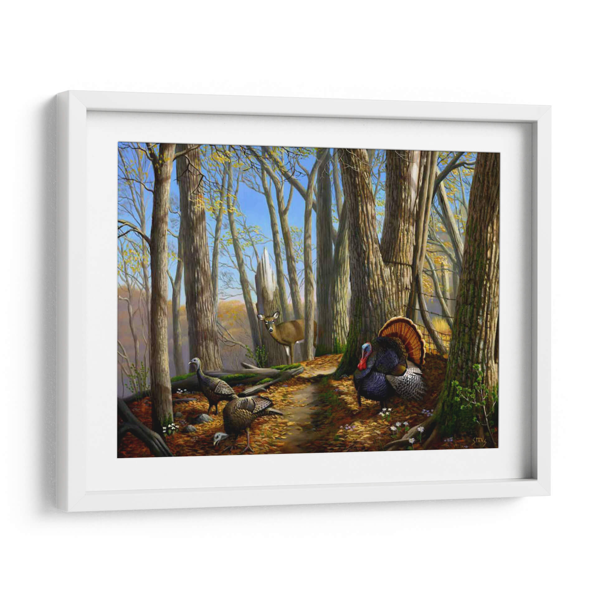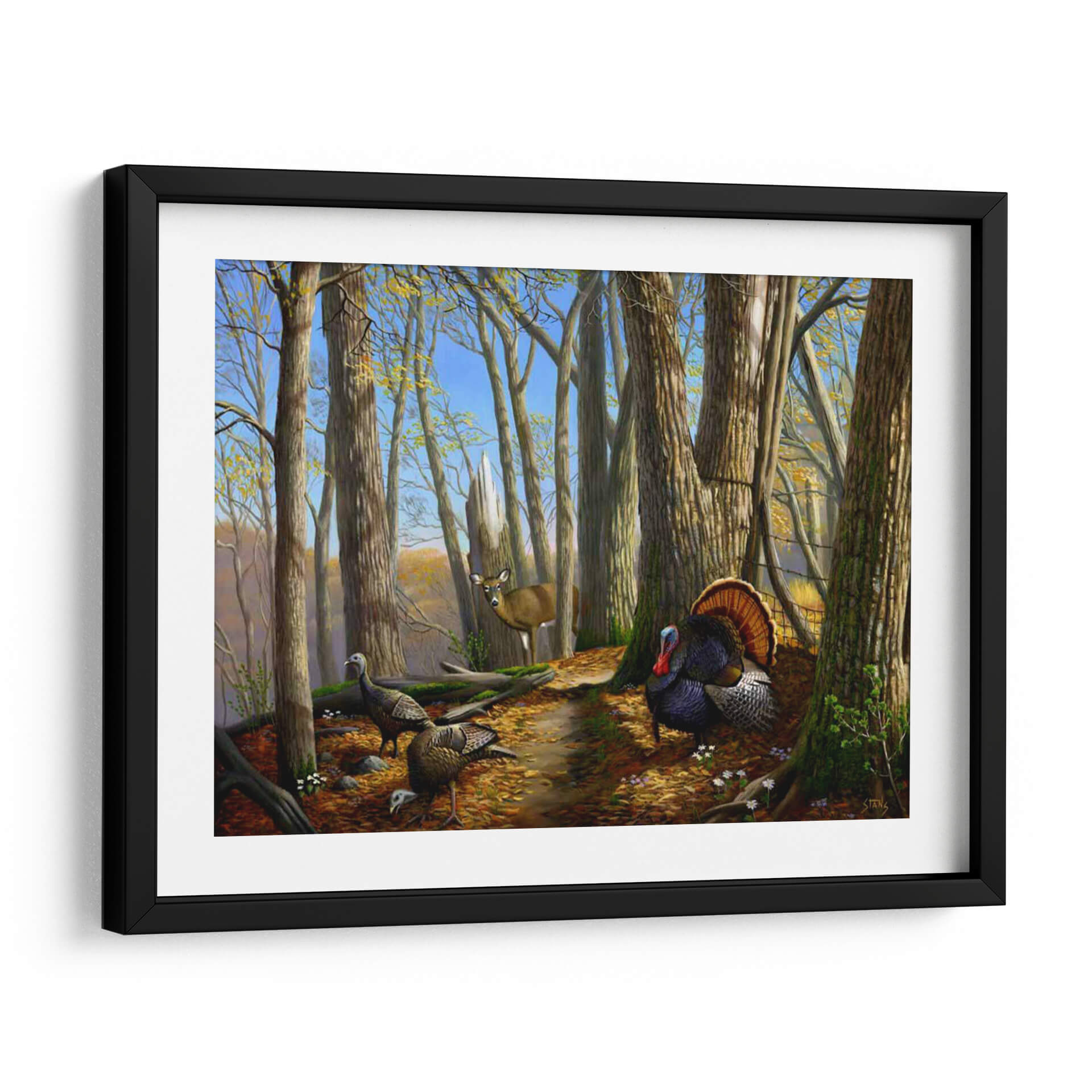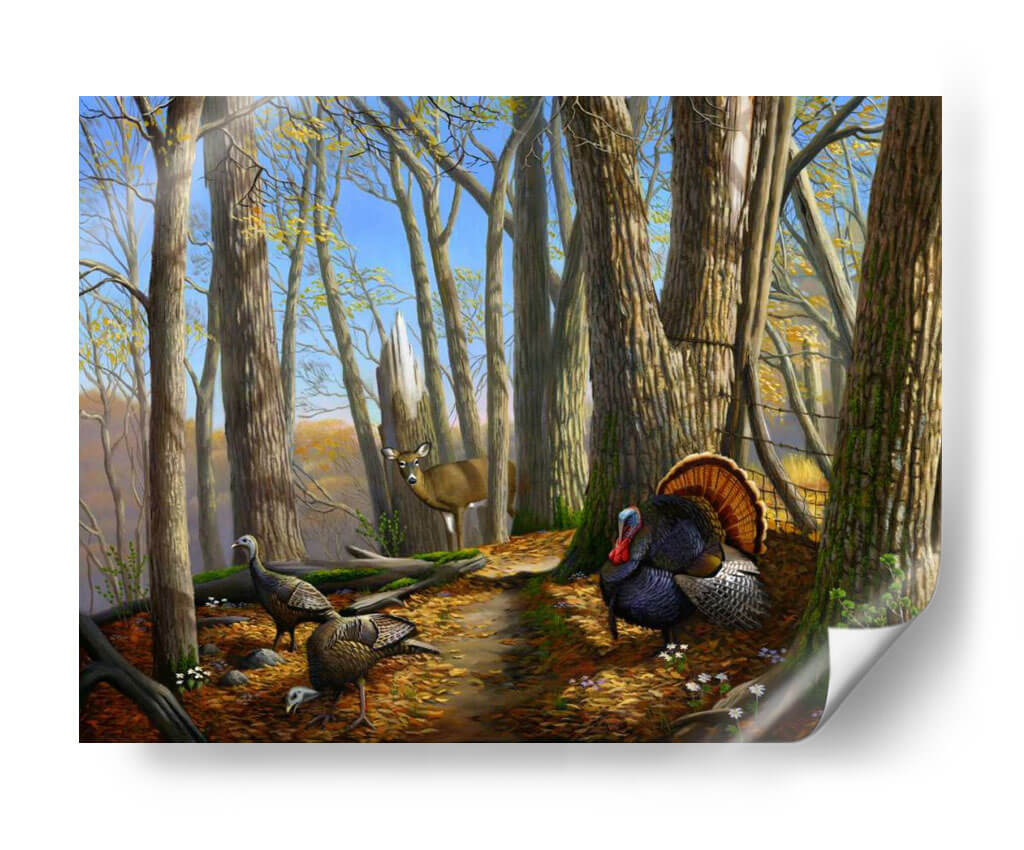 Sumérgete en la serenidad del bosque con "A Lo Largo De La Cerca", una obra maestra de Leo Stans que captura la esencia de la vida silvestre en su hábitat natural. Este cuadro decorativo te transporta a un sendero otoñal, donde la luz del sol se filtra entre las imponentes copas de los árboles, iluminando un escenario vibrante y detallado. La pieza presenta un pavo real en primer plano, con su plumaje desplegado en una exhibición de colores y texturas, acompañado por dos pavos más y un ciervo astuto que observa desde la espesura. La paleta de colores, dominada por tonos tierra, ocres, verdes profundos y un cielo azul claro, evoca una sensación de paz y conexión con la naturaleza. El realismo y la atención al detalle de Stans dan vida a cada hoja caída, a cada corteza de árbol y al movimiento sutil de los animales. "A Lo Largo De La Cerca" es más que una simple imagen; es una ventana a un momento de tranquilidad salvaje, perfecta para añadir un toque de naturaleza y sofisticación a tu salón, estudio u oficina. Este cuadro decorativo es ideal para amantes de la fauna, la caza, o para quienes buscan infundir en su hogar la calma y la belleza del mundo natural. Una adición exquisita para cualquier espacio que necesite una conexión visual con la tierra.
