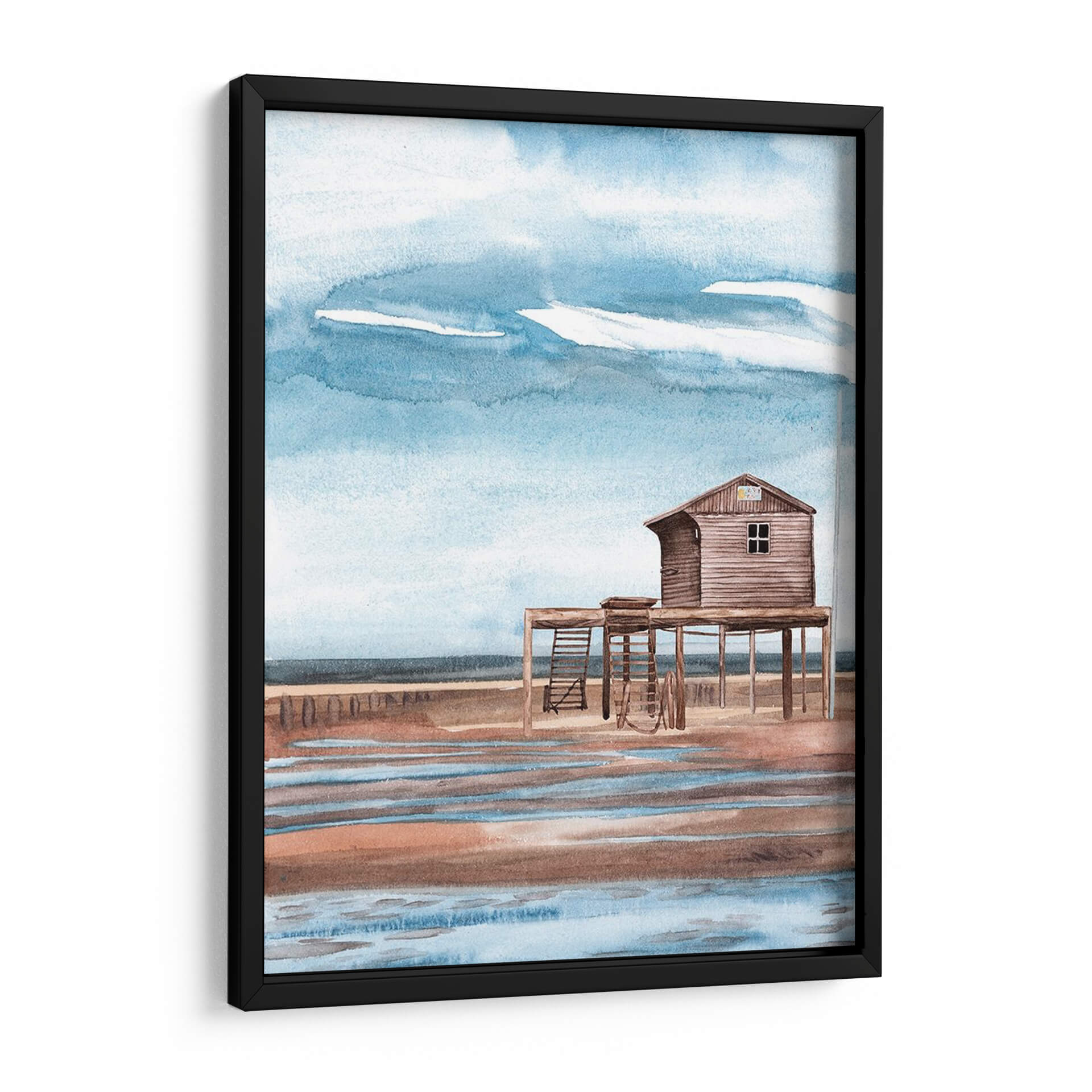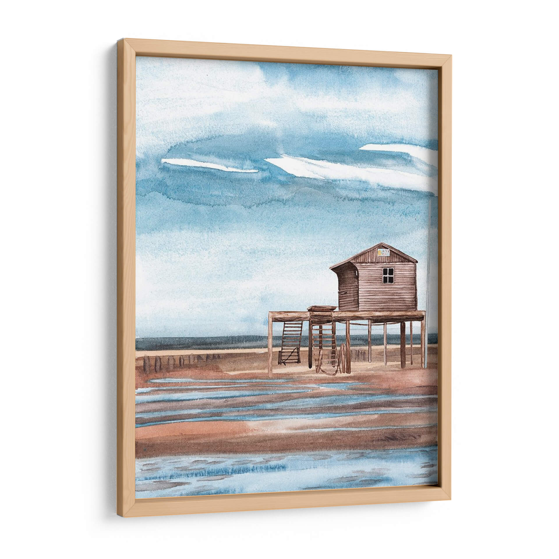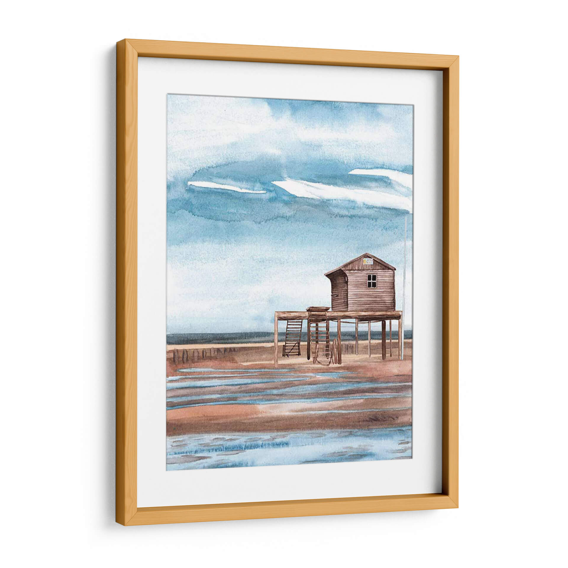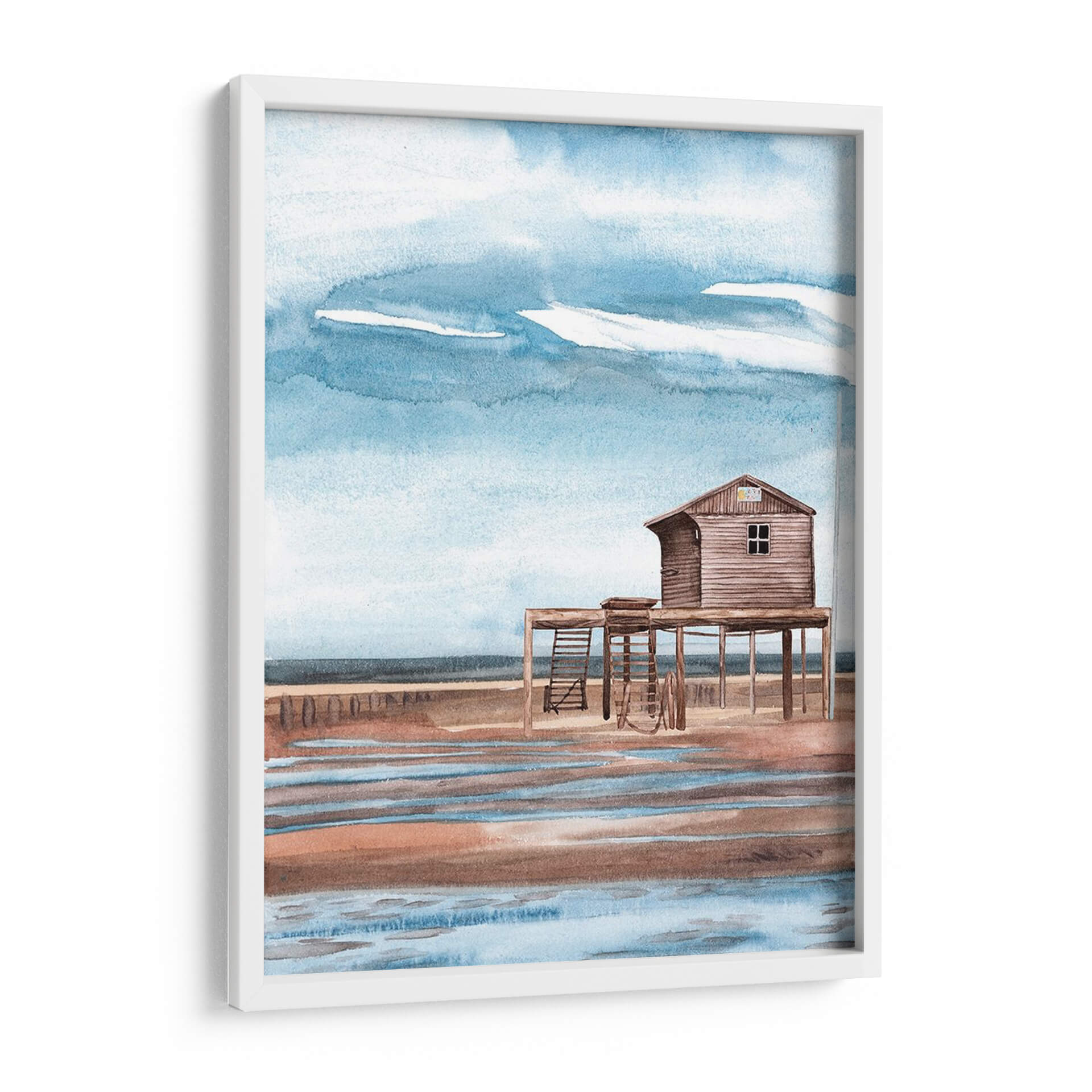 Sumérgete en la serenidad costera con "A Lo Largo De La Costa I", una cautivadora obra de arte de Melissa Wang. Esta pieza evoca la tranquilidad de un día en la playa con su paleta de colores suaves y su atmósfera pacífica. La acuarela representa una cabaña de madera elevada sobre pilotes, con una escalera que invita a la imaginación, y se alza sobre una orilla que refleja los tonos cálidos de la arena y los azules celestes del cielo. Las pinceladas delicadas y la técnica de acuarela capturan la fluidez del agua y la textura de la madera, creando una escena que respira calma y nostalgia. El cielo, con sus nubes etéreas y tonos azules cambiantes, aporta una sensación de amplitud y brisa marina. Este cuadro decorativo es ideal para añadir un toque de sosiego y conexión con la naturaleza a tu sala de estar, dormitorio u oficina. Su estilo, que recuerda a las escenas costeras clásicas con un toque contemporáneo, lo convierte en una pieza versátil que complementa diversos estilos de decoración, desde el bohemio hasta el costero o minimalista. Deja que "A Lo Largo De La Costa I" te transporte a ese lugar de paz y escape, transformando tu espacio en un refugio de tranquilidad visual. Una obra que invita a la contemplación y al descanso.