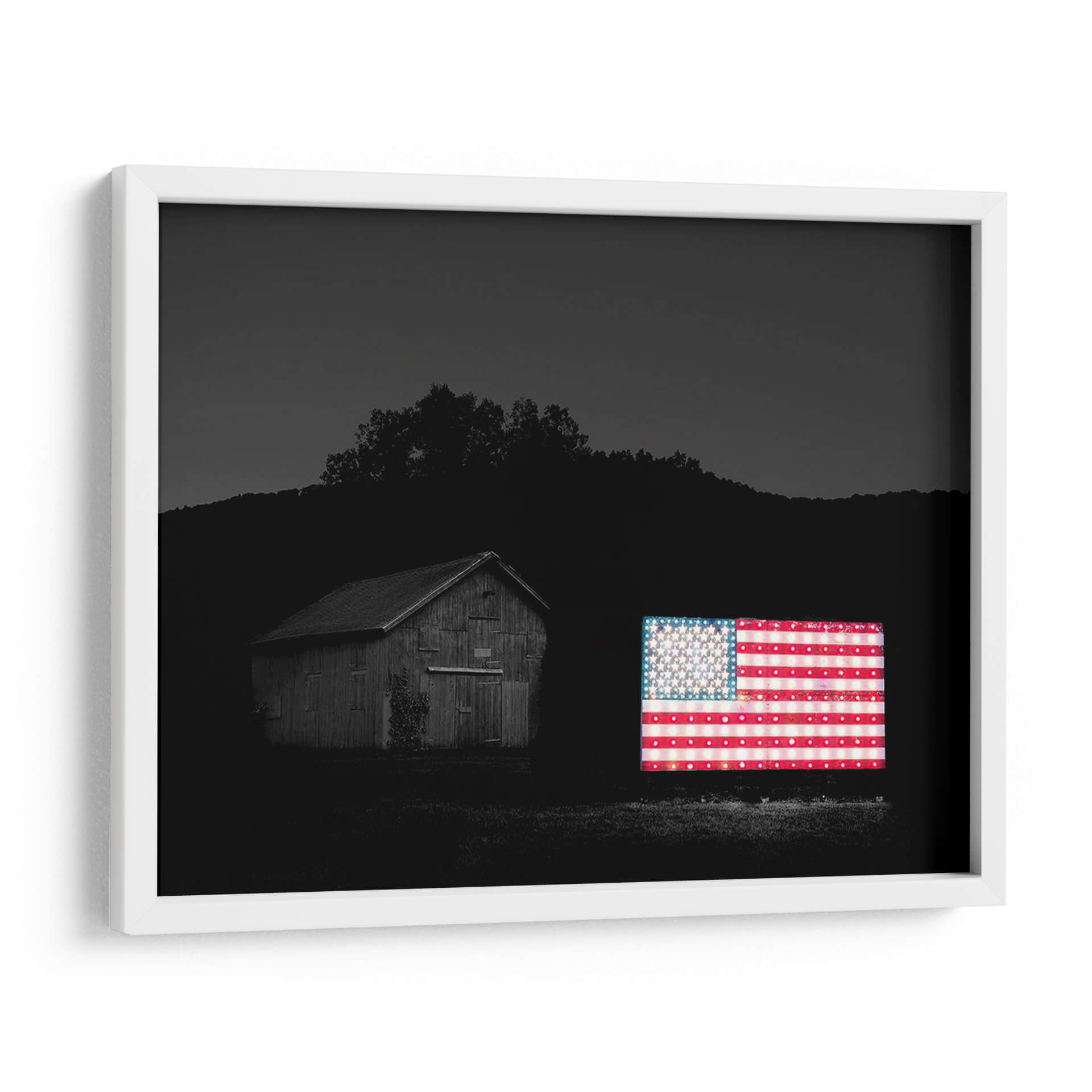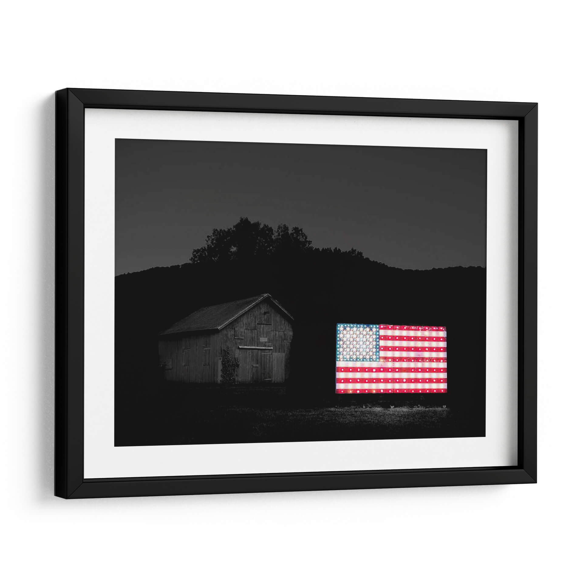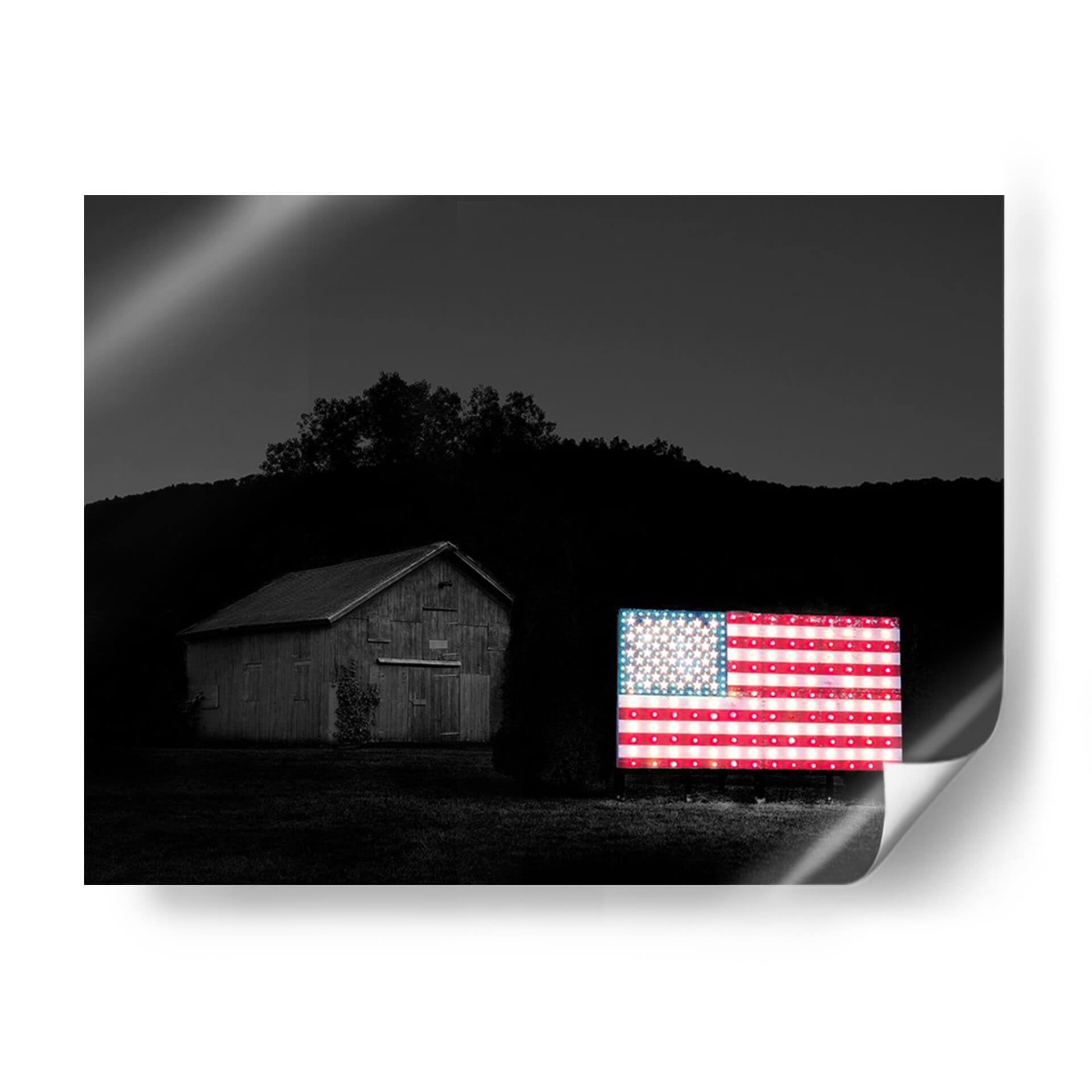Sumérgete en la evocadora atmósfera de "Banderas De Nuestros Agricultores Vi" de James McLoughlin, una obra que captura la esencia de la identidad americana con un toque moderno y vibrante. Este cuadro decorativo presenta una icónica bandera estadounidense iluminada, que contrasta poderosamente con el entorno oscuro y sereno de un granero rústico y un paisaje montañoso al anochecer. La fotografía, aunque en blanco y negro en su mayoría, resalta el brillo y la calidez de la bandera, creando un punto focal impactante. Los detalles de las estrellas y las franjas cobran vida, sugiriendo una narrativa de patriotismo y tradición, pero también de innovación y luz en la oscuridad. La composición equilibra la arquitectura rural con el símbolo nacional, invitando a la reflexión sobre las raíces y el futuro. Ideal para espacios que buscan un toque de carácter y conversación, este cuadro es perfecto para salas de estar, estudios o incluso oficinas que deseen proyectar una imagen de fuerza y orgullo. Añade un elemento visualmente cautivador y emocionalmente resonante a tu decoración.