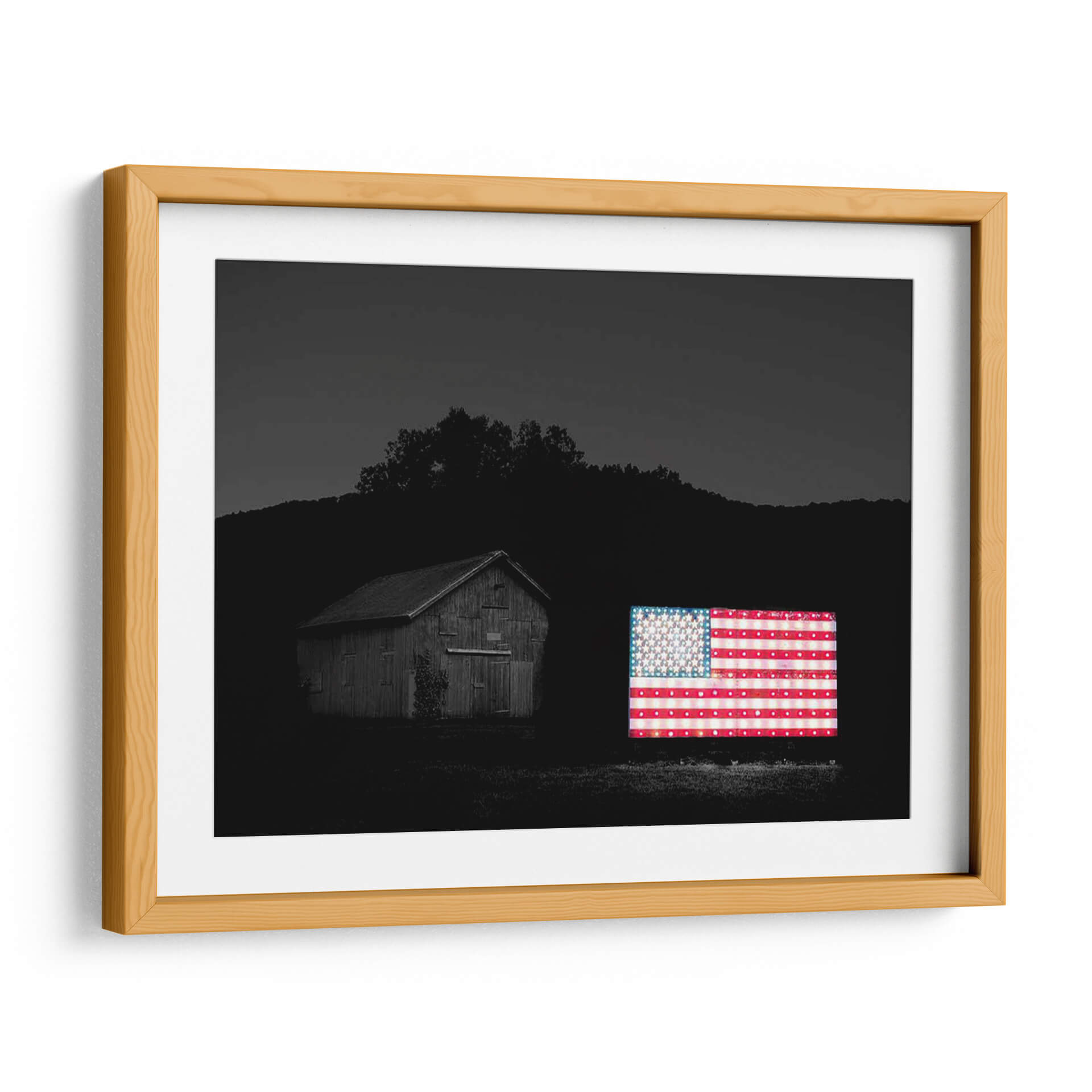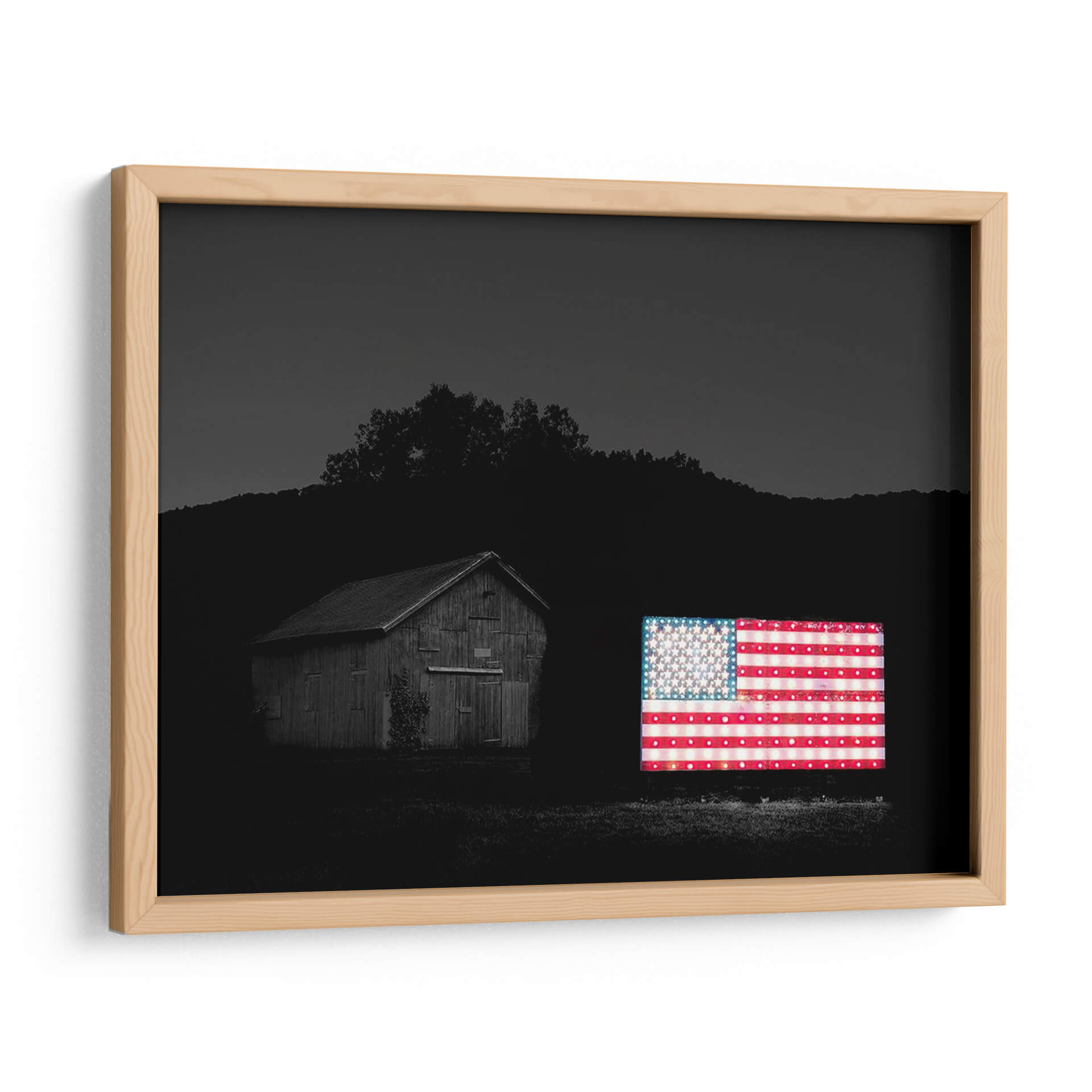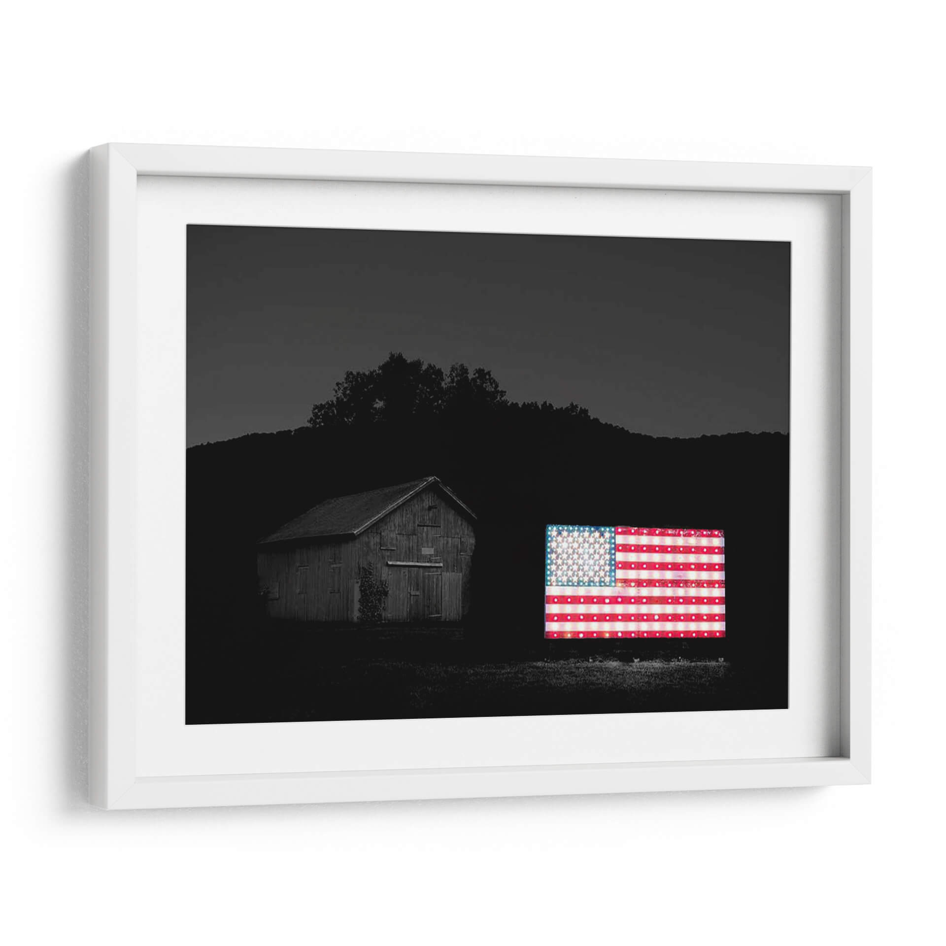 Sumérgete en la evocadora atmósfera de "Banderas De Nuestros Agricultores Vi" de James McLoughlin, una obra que captura la esencia de la identidad americana con un toque moderno y vibrante. Este cuadro decorativo presenta una icónica bandera estadounidense iluminada, que contrasta poderosamente con el entorno oscuro y sereno de un granero rústico y un paisaje montañoso al anochecer. La fotografía, aunque en blanco y negro en su mayoría, resalta el brillo y la calidez de la bandera, creando un punto focal impactante. Los detalles de las estrellas y las franjas cobran vida, sugiriendo una narrativa de patriotismo y tradición, pero también de innovación y luz en la oscuridad. La composición equilibra la arquitectura rural con el símbolo nacional, invitando a la reflexión sobre las raíces y el futuro. Ideal para espacios que buscan un toque de carácter y conversación, este cuadro es perfecto para salas de estar, estudios o incluso oficinas que deseen proyectar una imagen de fuerza y orgullo. Añade un elemento visualmente cautivador y emocionalmente resonante a tu decoración.