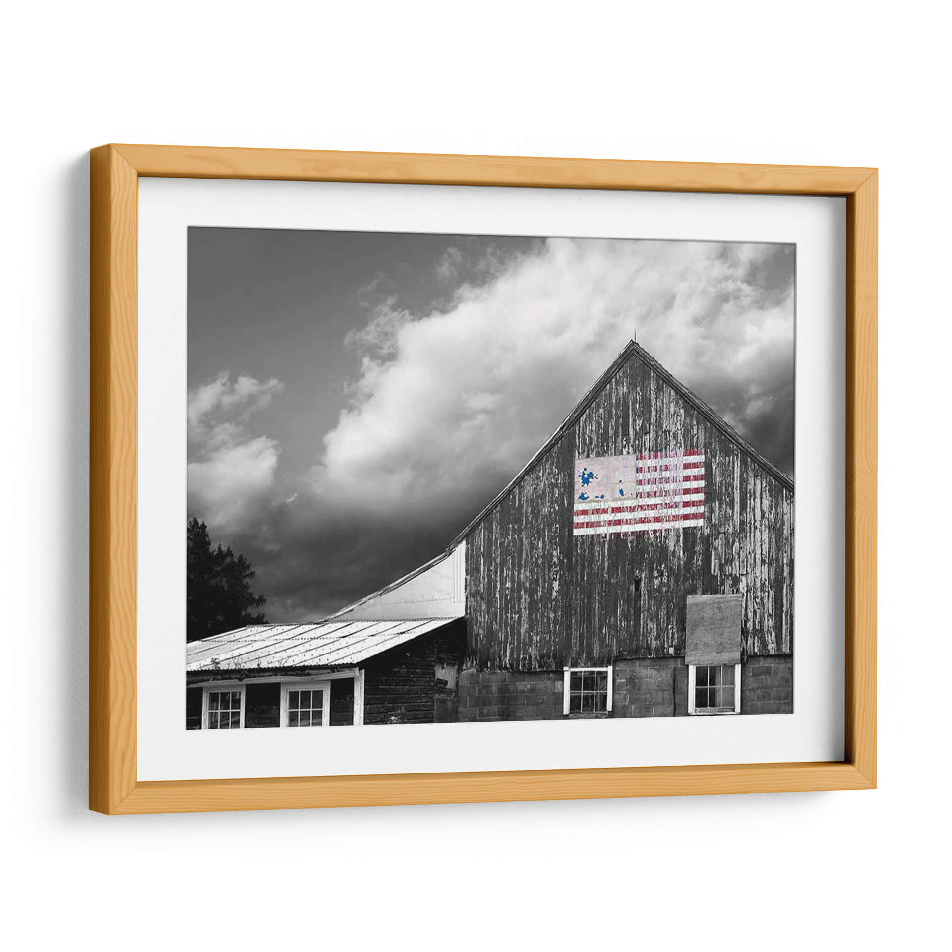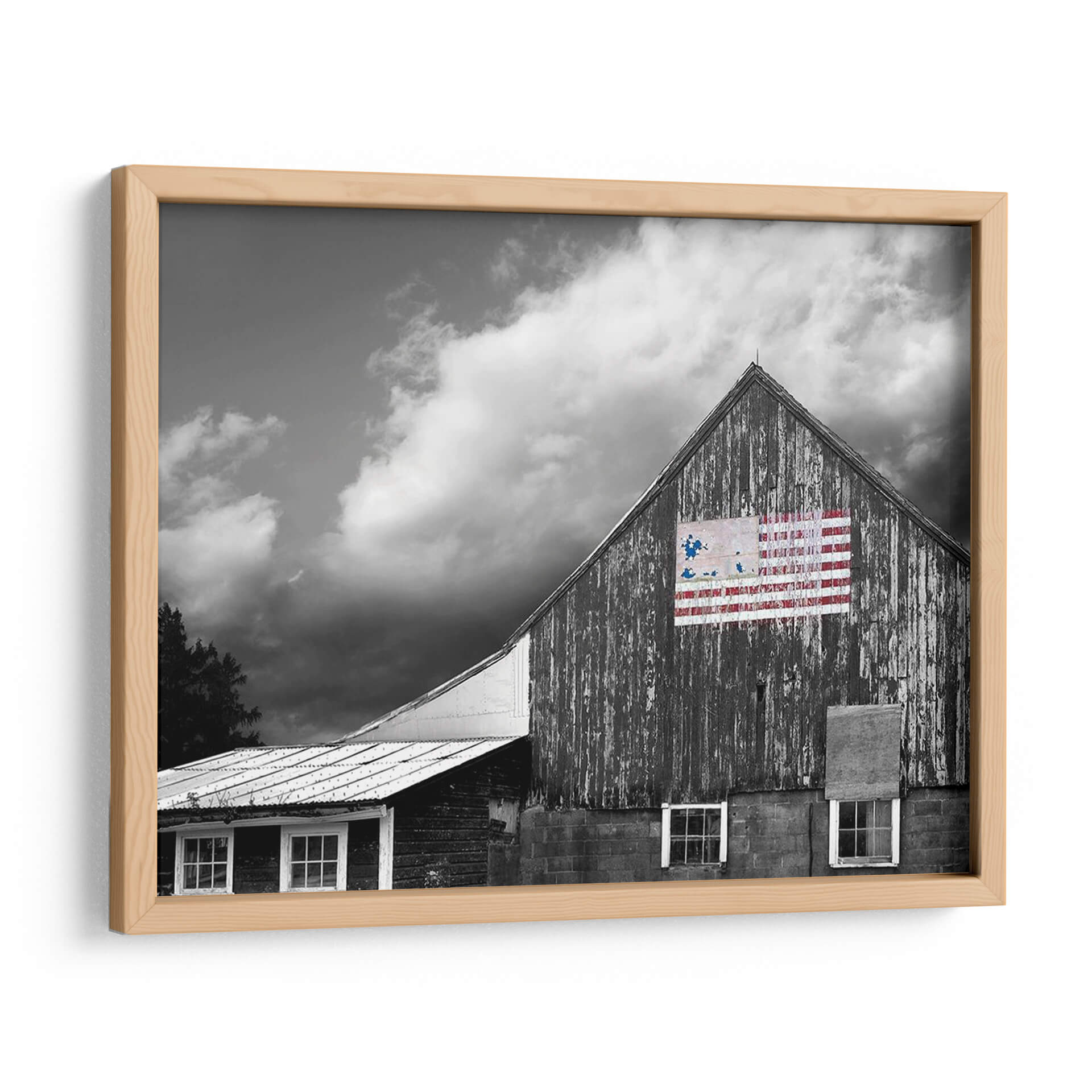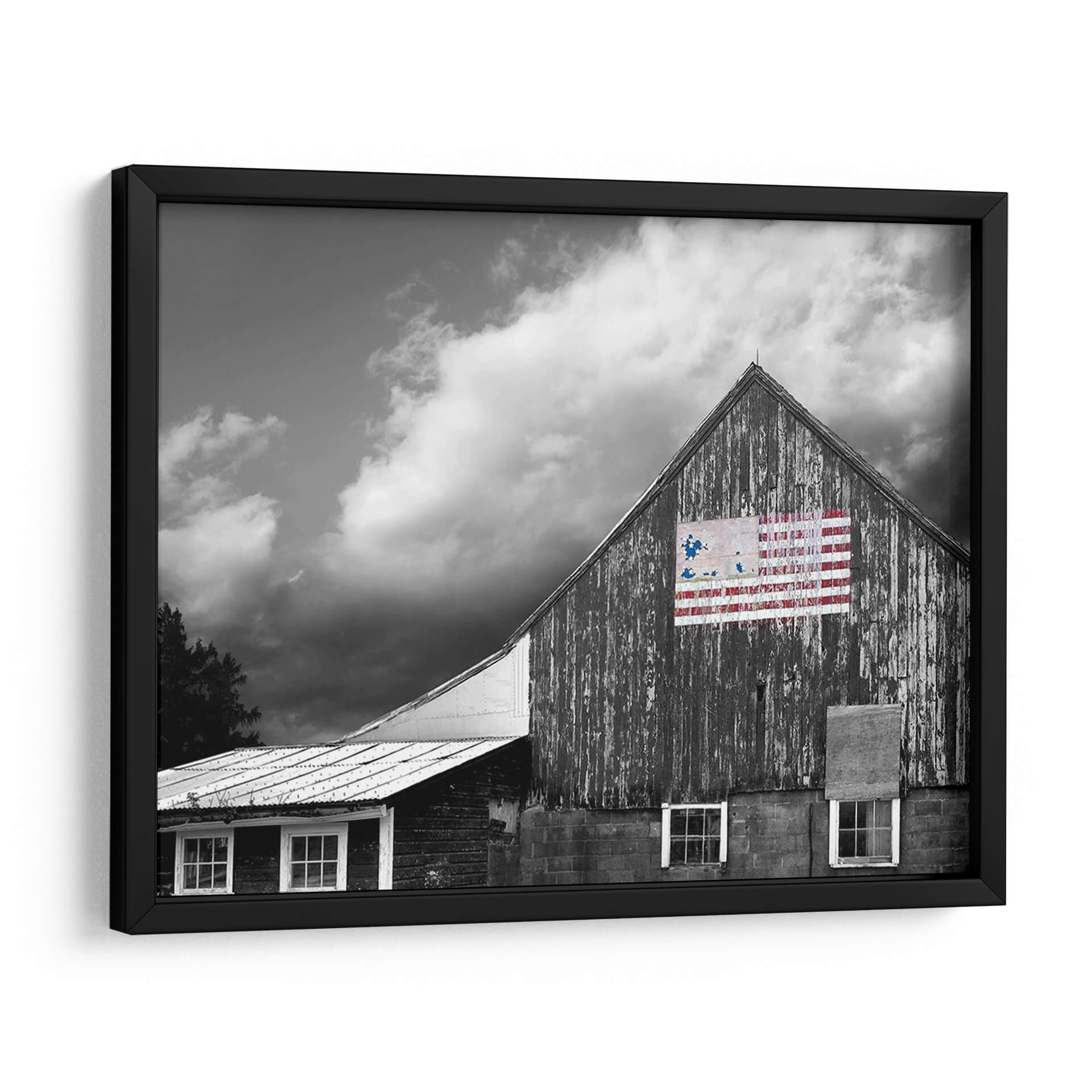 Este cautivador cuadro decorativo, "Banderas De Nuestros Agricultores Vii" de James McLoughlin, captura la esencia de la vida rural y el espíritu americano con una estética impactante. La obra presenta una granja de madera en tonos de gris, con texturas que evocan el paso del tiempo y la historia. Sobre la pared principal, un detalle de la bandera estadounidense, intervenida con pinceladas audaces en rojo y azul, añade un toque de color vibrante y un simbolismo patriótico. Las nubes dramáticas en el cielo crean una atmósfera de profundidad y carácter, mientras que las ventanas del granero y los detalles de la estructura aportan autenticidad a la escena. Este cuadro es ideal para quienes buscan infundir a sus espacios un sentido de herencia, fuerza y orgullo nacional. Su estilo rústico y contemporáneo lo hace perfecto para salas de estar, estudios o espacios que buscan un punto focal con historia y personalidad. Añade una pieza que habla de tradición y resiliencia, evocando paisajes americanos y la fuerza de sus orígenes.