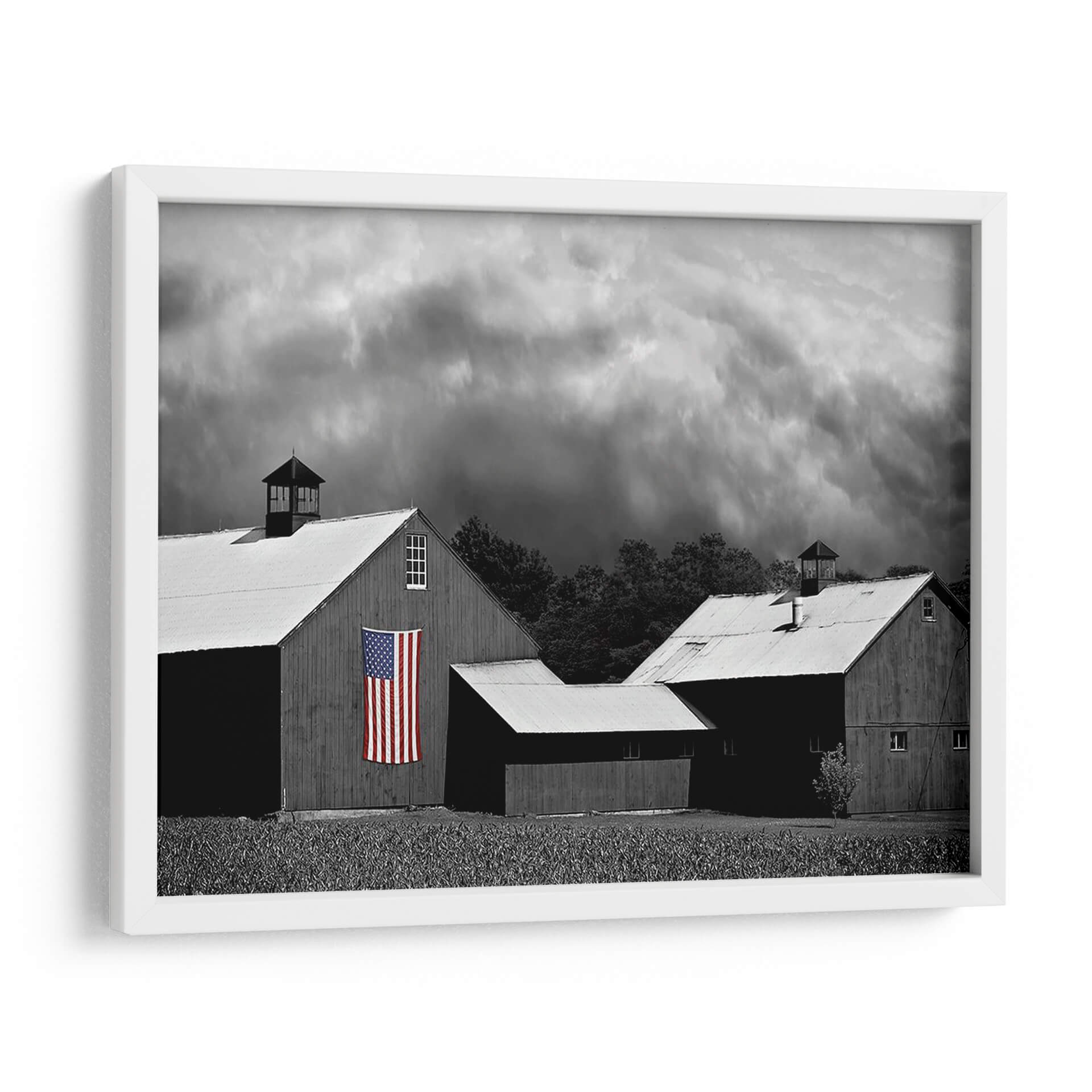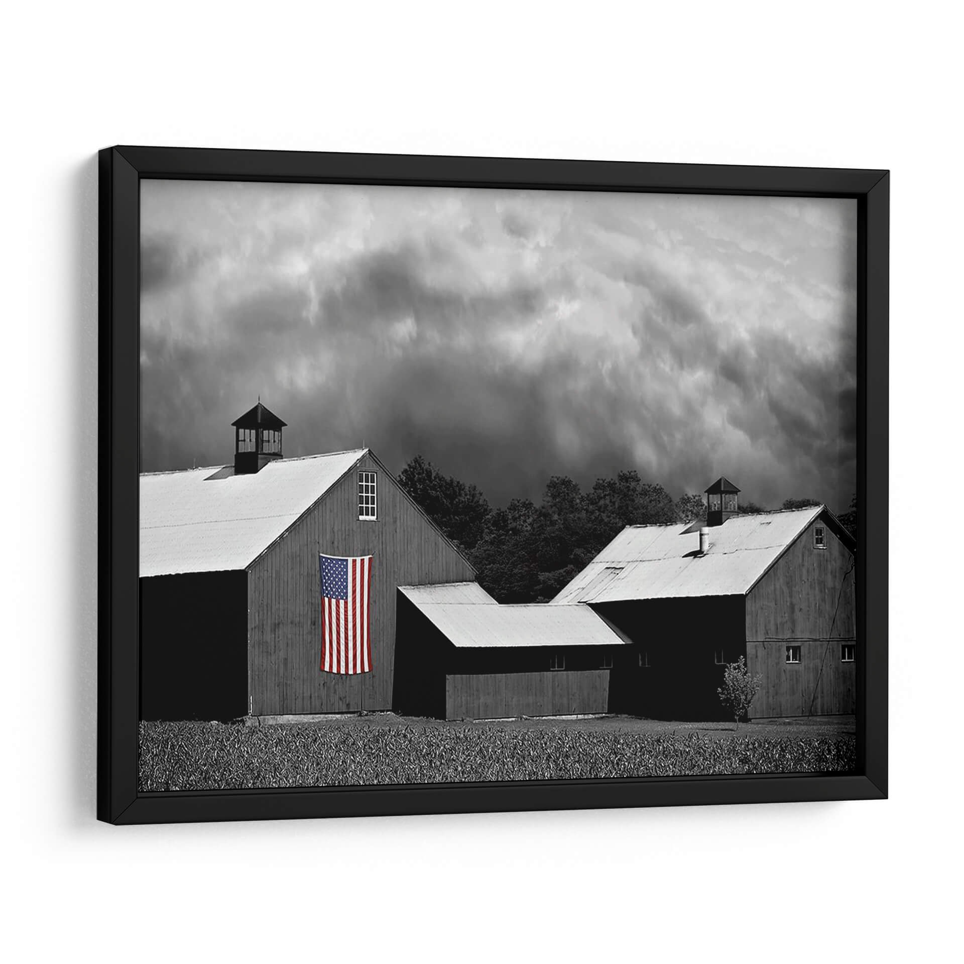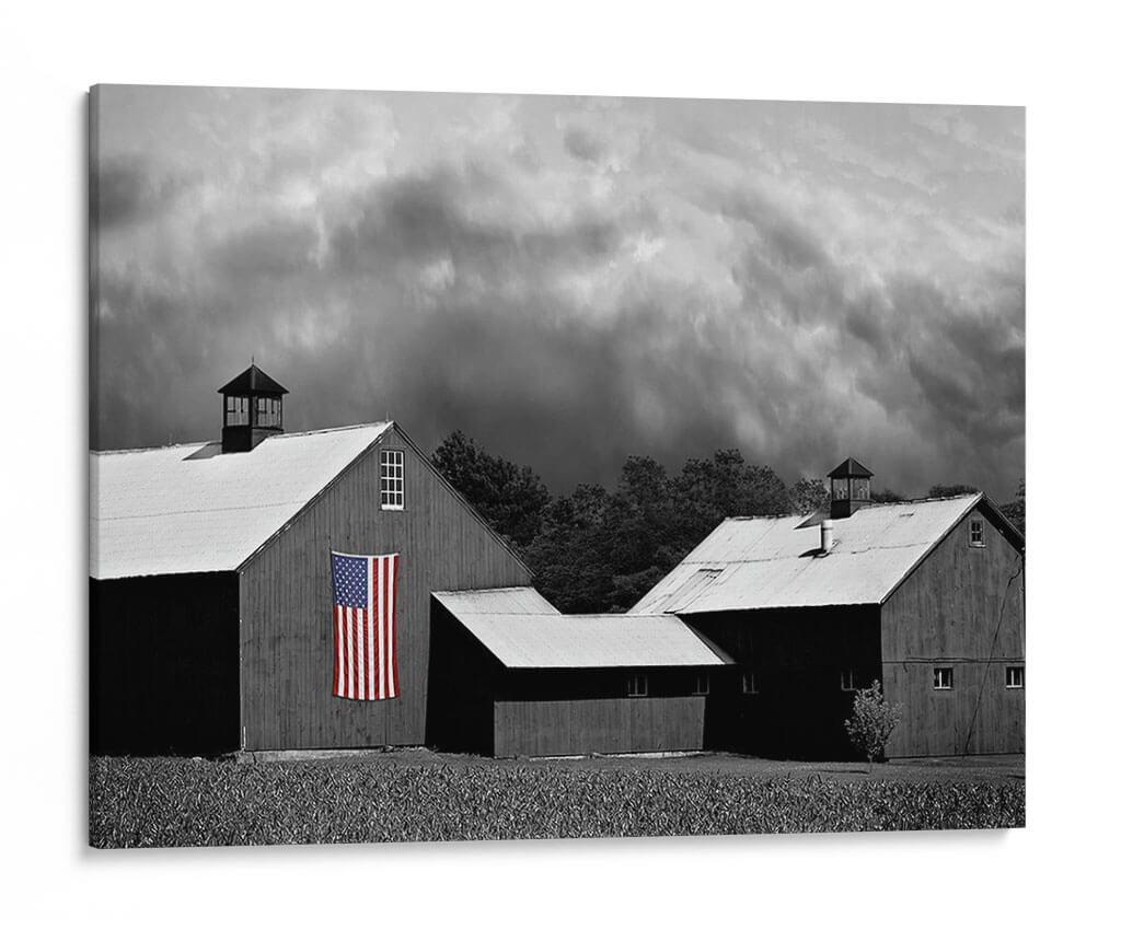 Captura la esencia de la vida rural y el espíritu patriótico con este impactante cuadro decorativo, "Banderas De Nuestros Agricultores Xv", del artista James McLoughlin. La obra presenta una escena evocadora en blanco y negro de graneros rústicos bajo un cielo dramático y nublado. Destaca la icónica bandera estadounidense, colgada con orgullo en uno de los graneros, añadiendo un vibrante toque de color y simbolismo a la composición monocromática. Las texturas rústicas de la madera de los graneros, el techo nevado que sugiere una estación particular, y el campo de cultivo en primer plano, crean una atmósfera rica y llena de historia. La iluminación contrastada y las nubes amenazantes aportan un dramatismo sutil, invitando a la reflexión sobre la resiliencia y la herencia. Este cuadro decorativo es ideal para añadir carácter y un punto de conversación a cualquier sala de estar, estudio u oficina que busque una conexión con la tradición americana y el arte contemporáneo con un toque emotivo. Su estilo fotográfico y su composición equilibrada lo convierten en una pieza versátil para diversos entornos decorativos.