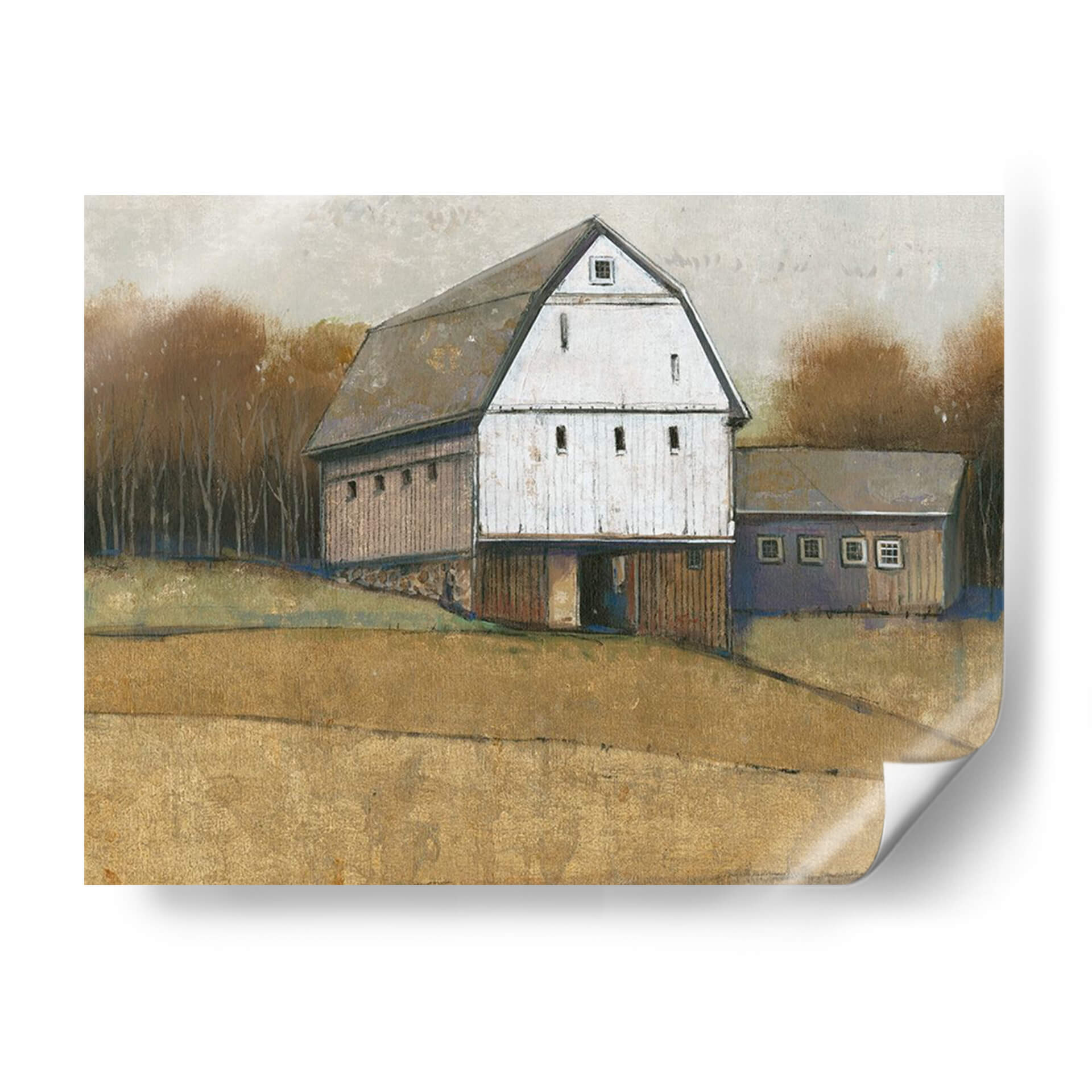 Captura la esencia de la vida rural con "Barn White View Ii", una obra de arte que evoca serenidad y nostalgia. Este cuadro decorativo presenta un granero blanco rústico, un símbolo icónico del campo, rodeado por un bosque de árboles de otoño en tonos tierra y un campo dorado que se extiende hacia el horizonte. La paleta de colores, dominada por blancos cálidos, marrones terrosos y grises suaves, crea una atmósfera tranquila y acogedora, perfecta para añadir un toque de calma a cualquier espacio. El estilo pictórico, con pinceladas visibles y una textura sutil, aporta profundidad y carácter, invitando a la contemplación. La composición equilibrada, con el granero como punto focal principal, guía la mirada a través de la escena, transmitiendo una sensación de paz y simplicidad. Ideal para salones, dormitorios o estudios que busquen una conexión con la naturaleza y un ambiente relajado. Este cuadro es más que una simple decoración; es una ventana a un paisaje sereno que invita a la reflexión y al bienestar. Añade esta pieza a tu colección y transforma tu hogar en un santuario de tranquilidad.