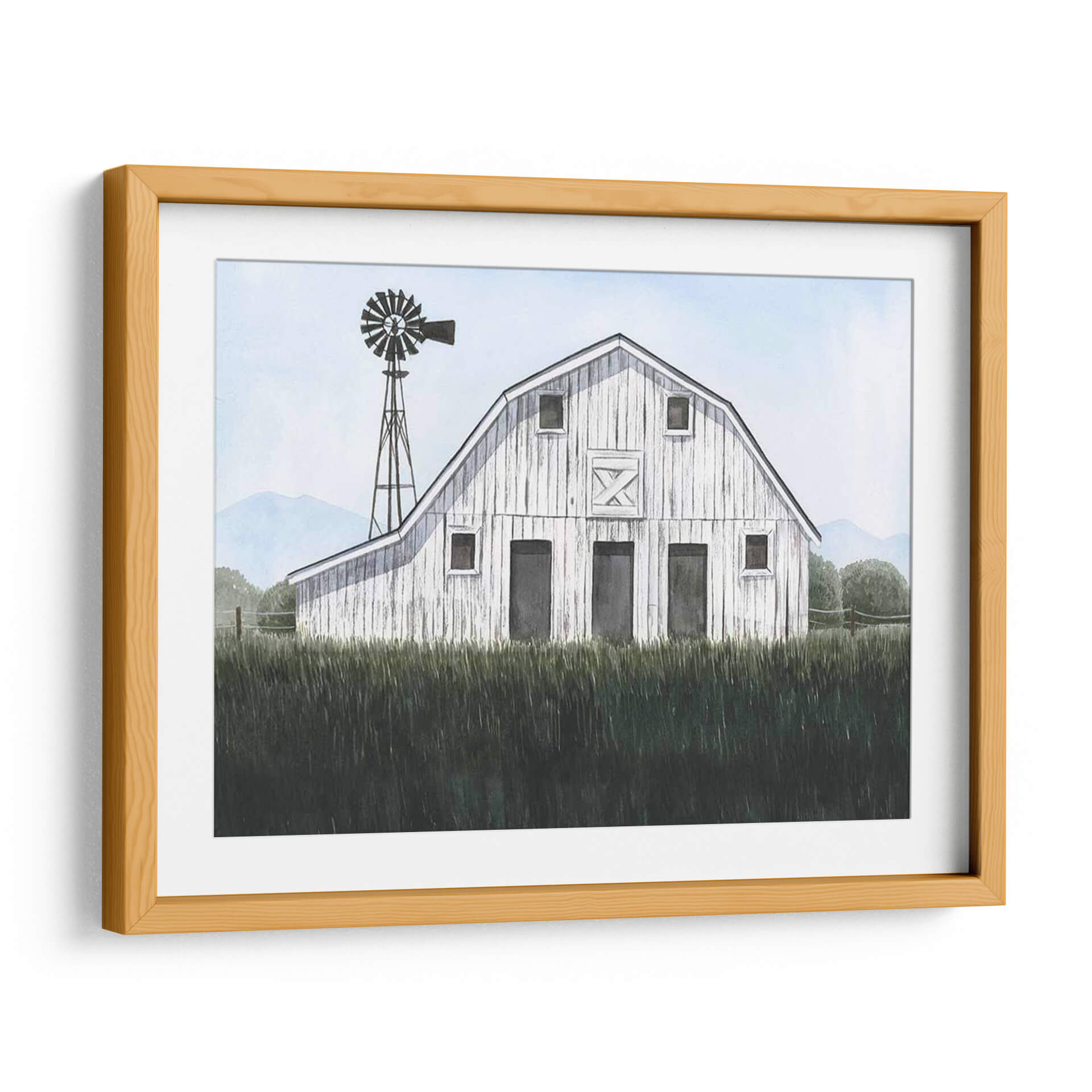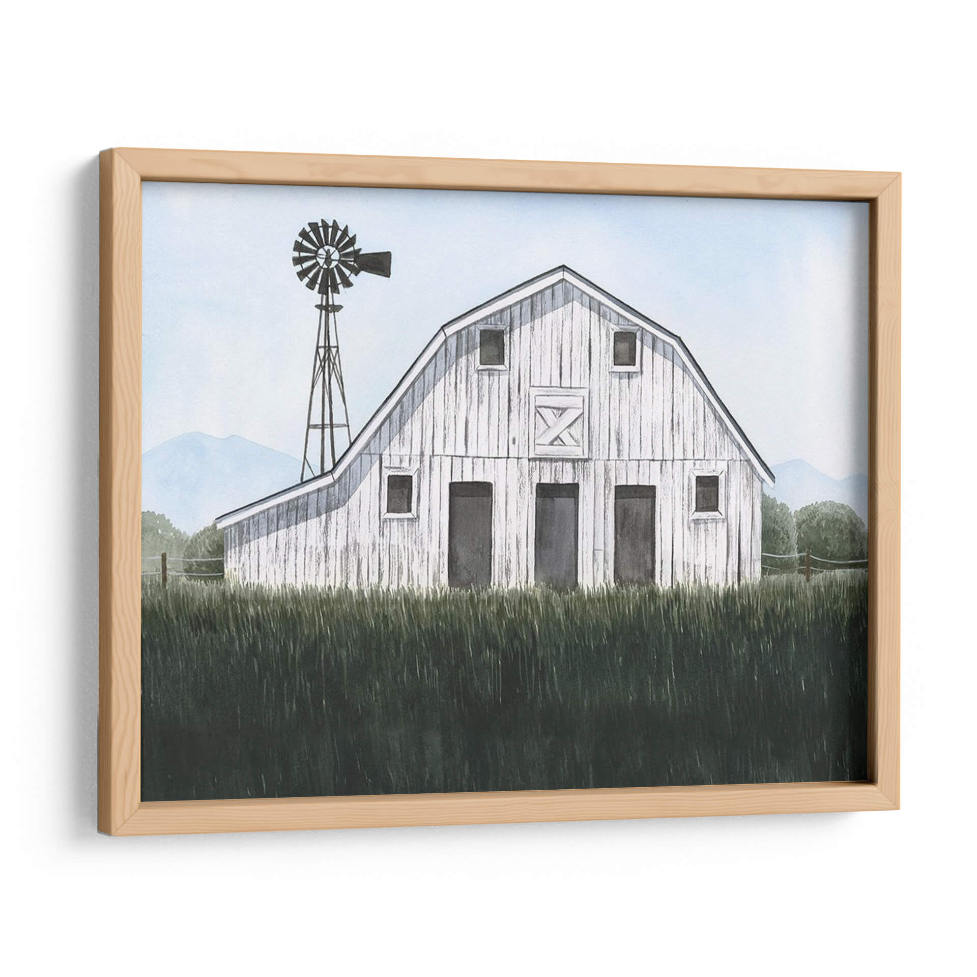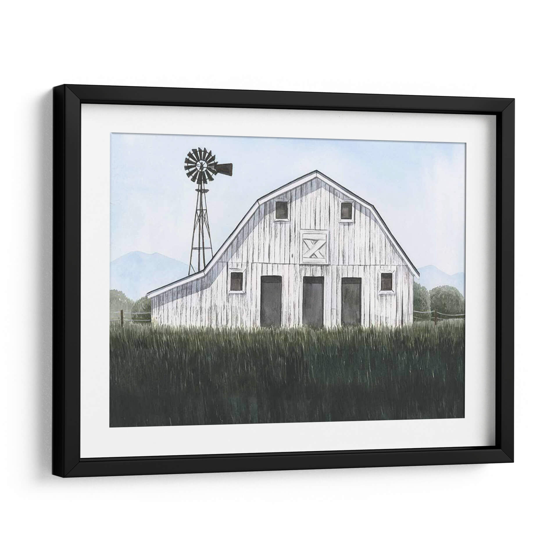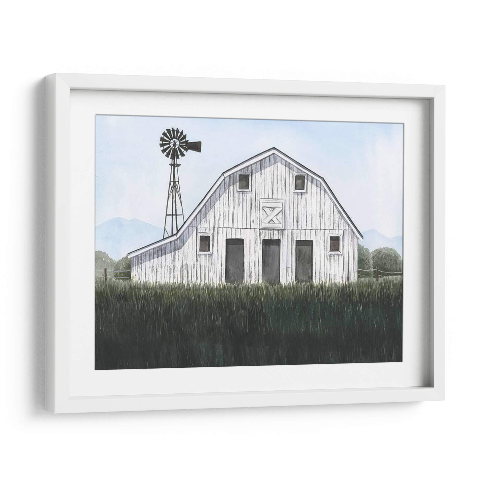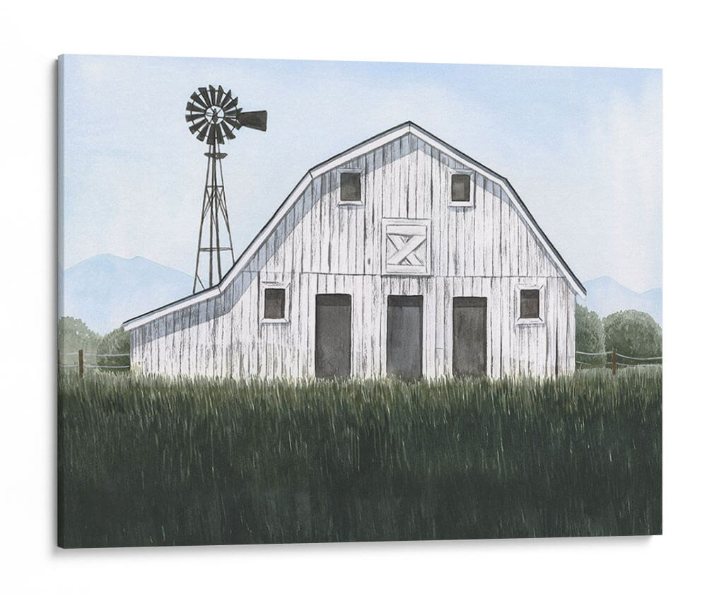 Sumérgete en la serenidad del campo con 'Blueridge Barn I', una obra de arte que captura la esencia de la vida rural con una delicadeza excepcional. Este cuadro decorativo presenta un granero blanco de madera, cuya textura y detalles evocan historias de tiempos pasados y la robustez de la naturaleza. Rodeado por una exuberante hierba alta en primer plano y colinas azuladas en el horizonte, la pieza crea una atmósfera de paz y tranquilidad. La presencia de un viejo molino de viento añade un toque nostálgico y un elemento visual intrigante que complementa la arquitectura del granero. La paleta de colores, dominada por suaves tonos celestes, verdes profundos y el blanco rústico del granero, transmite una sensación de calma y frescura. Ideal para espacios que buscan un refugio de la vida urbana, como dormitorios, salas de estar o estudios, este cuadro es perfecto para quienes aprecian la belleza sencilla y atemporal de los paisajes rurales. 'Blueridge Barn I' invita a la contemplación y añade un toque de encanto campestre a cualquier decoración.