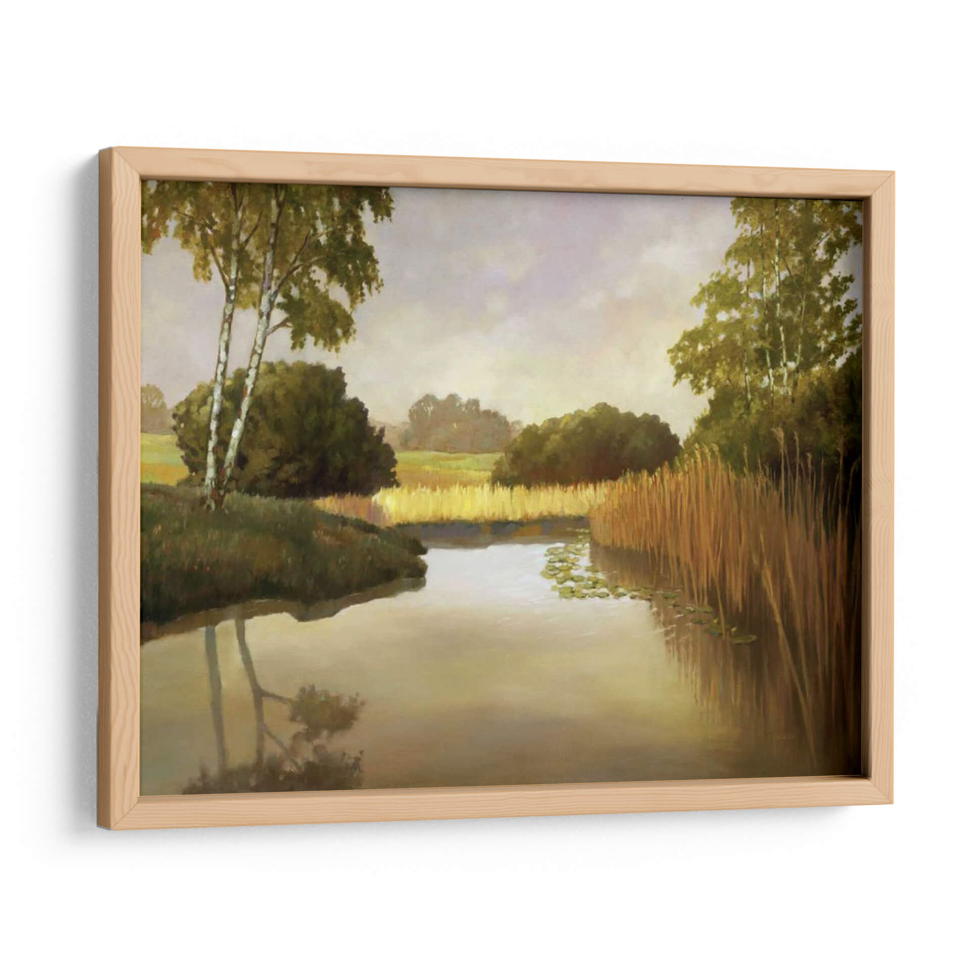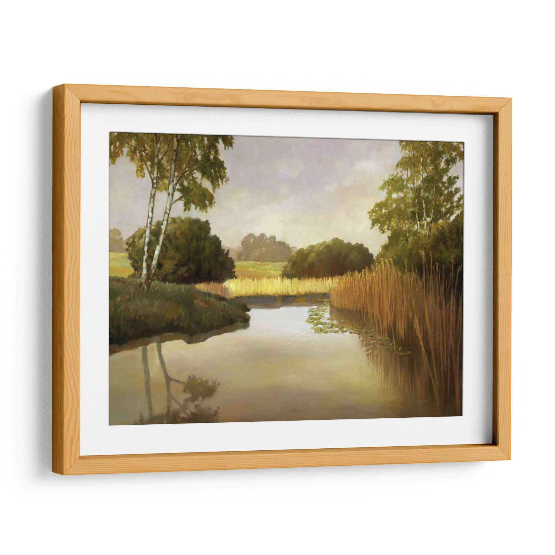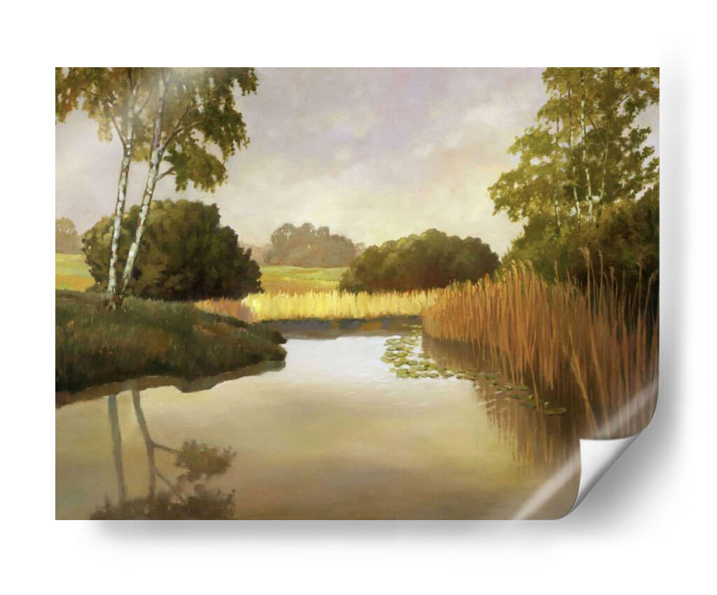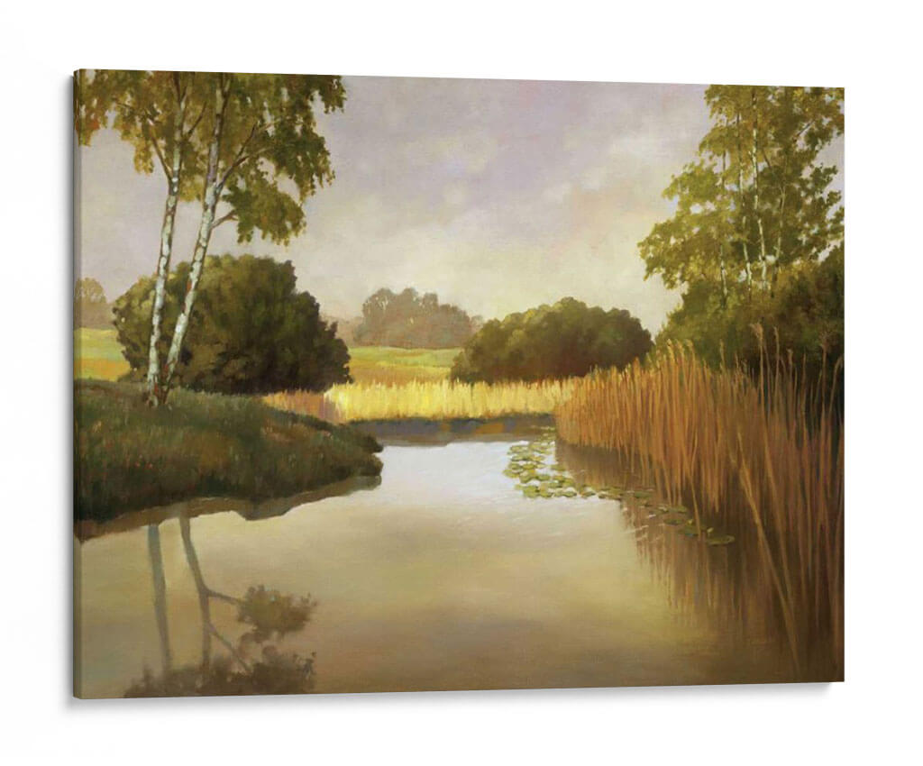 Sumérgete en la serenidad de "Cañas, Abedules Y Agua I", una obra maestra de Graham Reynolds que captura la esencia de un paisaje natural tranquilo. Este cuadro decorativo presenta una serena laguna bordeada por altas cañas doradas y la delicada presencia de abedules con sus característicos troncos blancos, reflejándose elegantemente sobre la superficie del agua. La paleta de colores, dominada por tonos tierra, verdes suaves y ocres luminosos, crea una atmósfera de calma y armonía, invitando a la contemplación. El estilo pictórico, con pinceladas que sugieren el impresionismo, aporta profundidad y textura a la escena, evocando la sensación de una brisa suave y la luz tenue de un atardecer o amanecer. Es la pieza ideal para quienes buscan añadir un toque de naturaleza y paz a su hogar u oficina, transformando cualquier espacio en un refugio de tranquilidad. Este lienzo es perfecto para salas de estar, dormitorios o estudios, aportando un punto focal natural y relajante que invita a la desconexión y al disfrute estético. Descubre la belleza atemporal de la naturaleza capturada en arte.