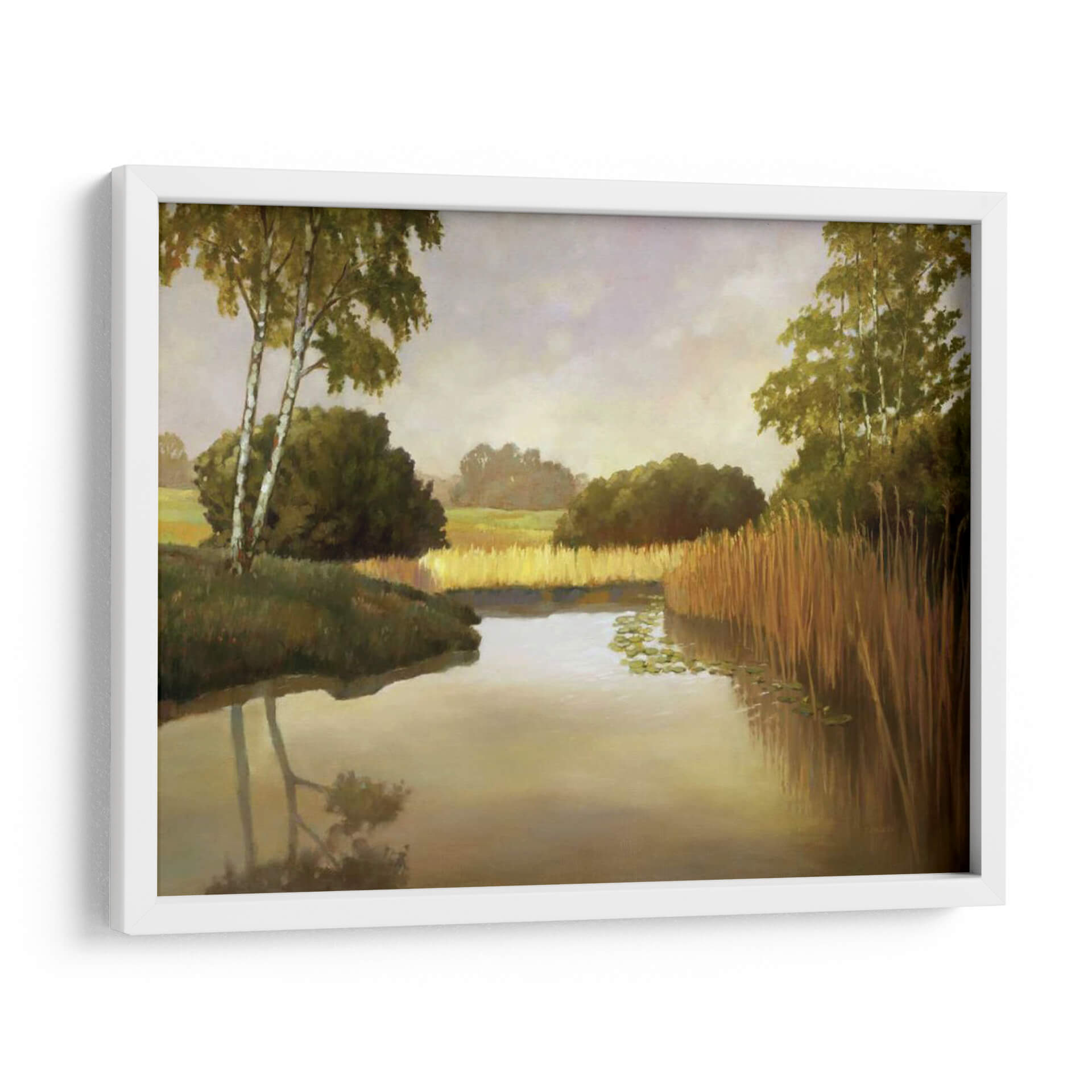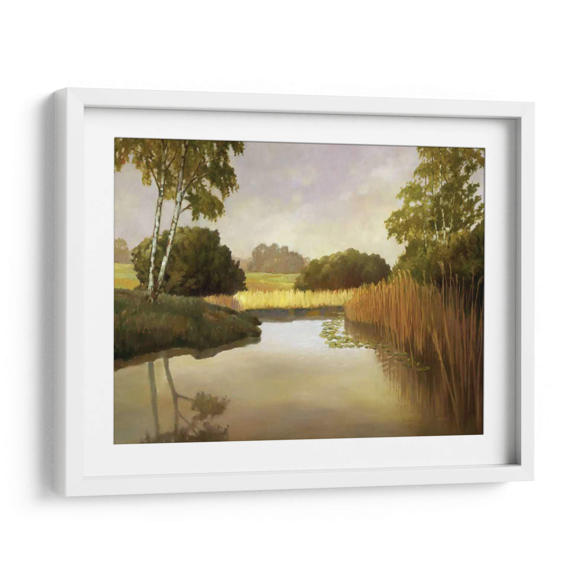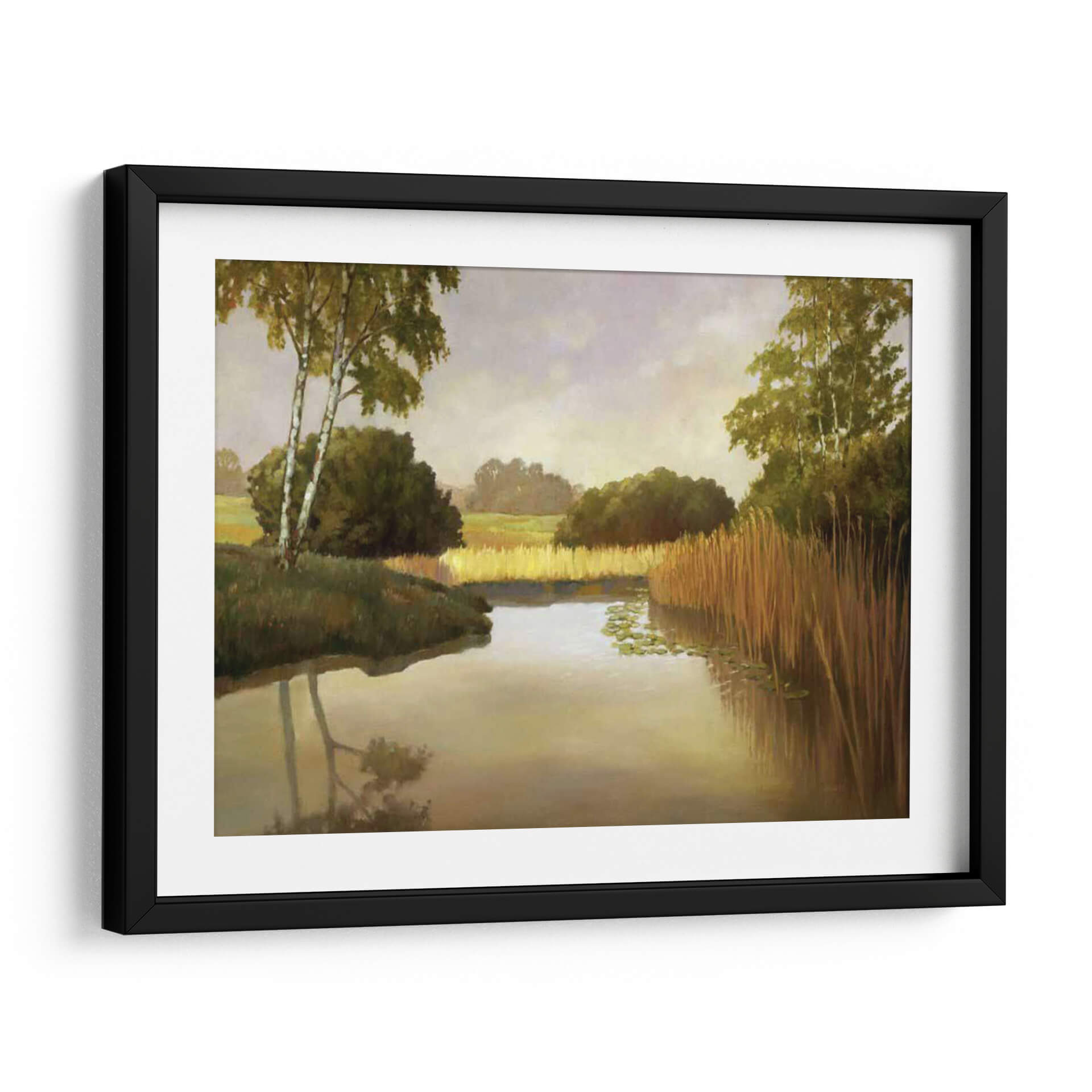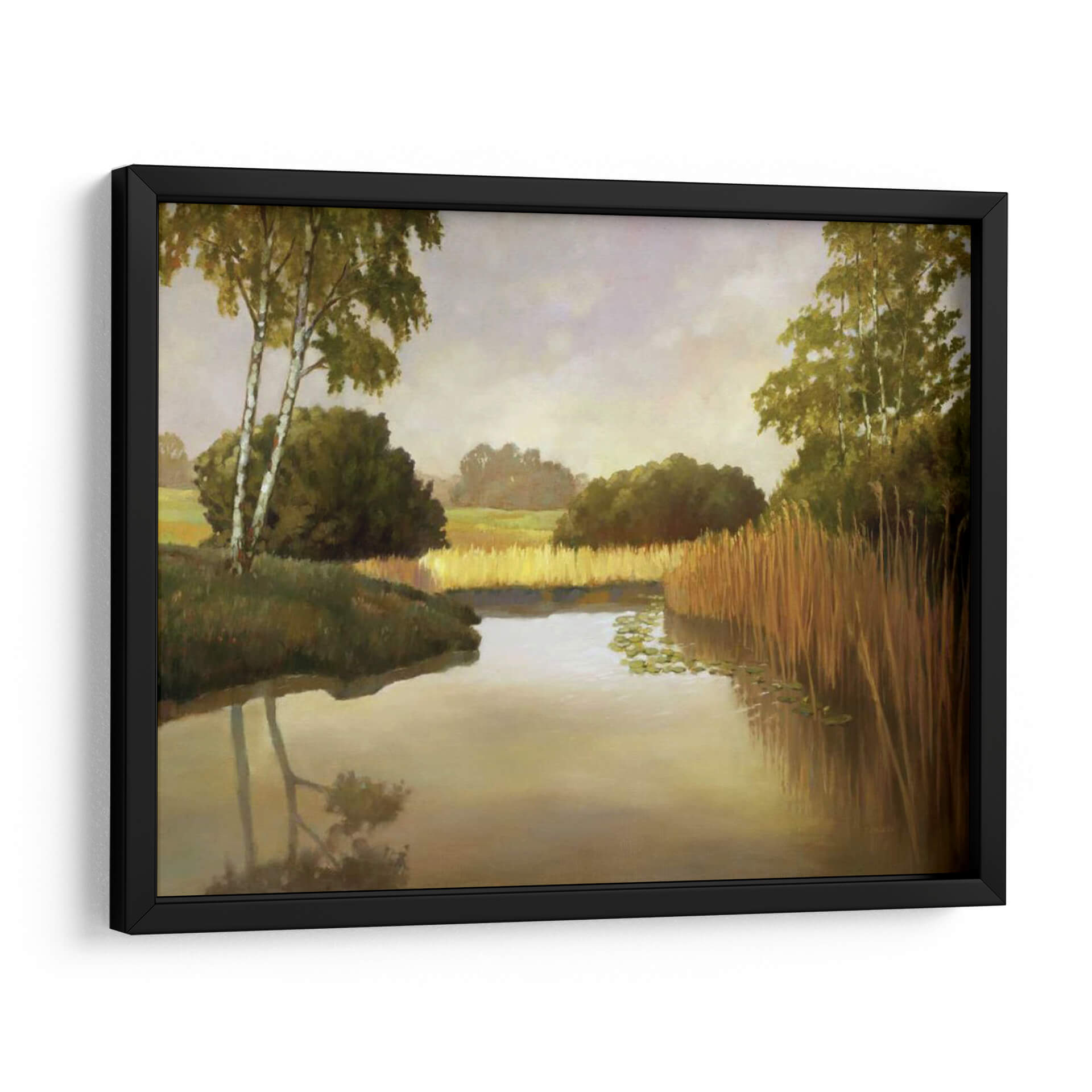 Sumérgete en la serenidad de "Cañas, Abedules Y Agua I", una obra maestra de Graham Reynolds que captura la esencia de un paisaje natural tranquilo. Este cuadro decorativo presenta una serena laguna bordeada por altas cañas doradas y la delicada presencia de abedules con sus característicos troncos blancos, reflejándose elegantemente sobre la superficie del agua. La paleta de colores, dominada por tonos tierra, verdes suaves y ocres luminosos, crea una atmósfera de calma y armonía, invitando a la contemplación. El estilo pictórico, con pinceladas que sugieren el impresionismo, aporta profundidad y textura a la escena, evocando la sensación de una brisa suave y la luz tenue de un atardecer o amanecer. Es la pieza ideal para quienes buscan añadir un toque de naturaleza y paz a su hogar u oficina, transformando cualquier espacio en un refugio de tranquilidad. Este lienzo es perfecto para salas de estar, dormitorios o estudios, aportando un punto focal natural y relajante que invita a la desconexión y al disfrute estético. Descubre la belleza atemporal de la naturaleza capturada en arte.
