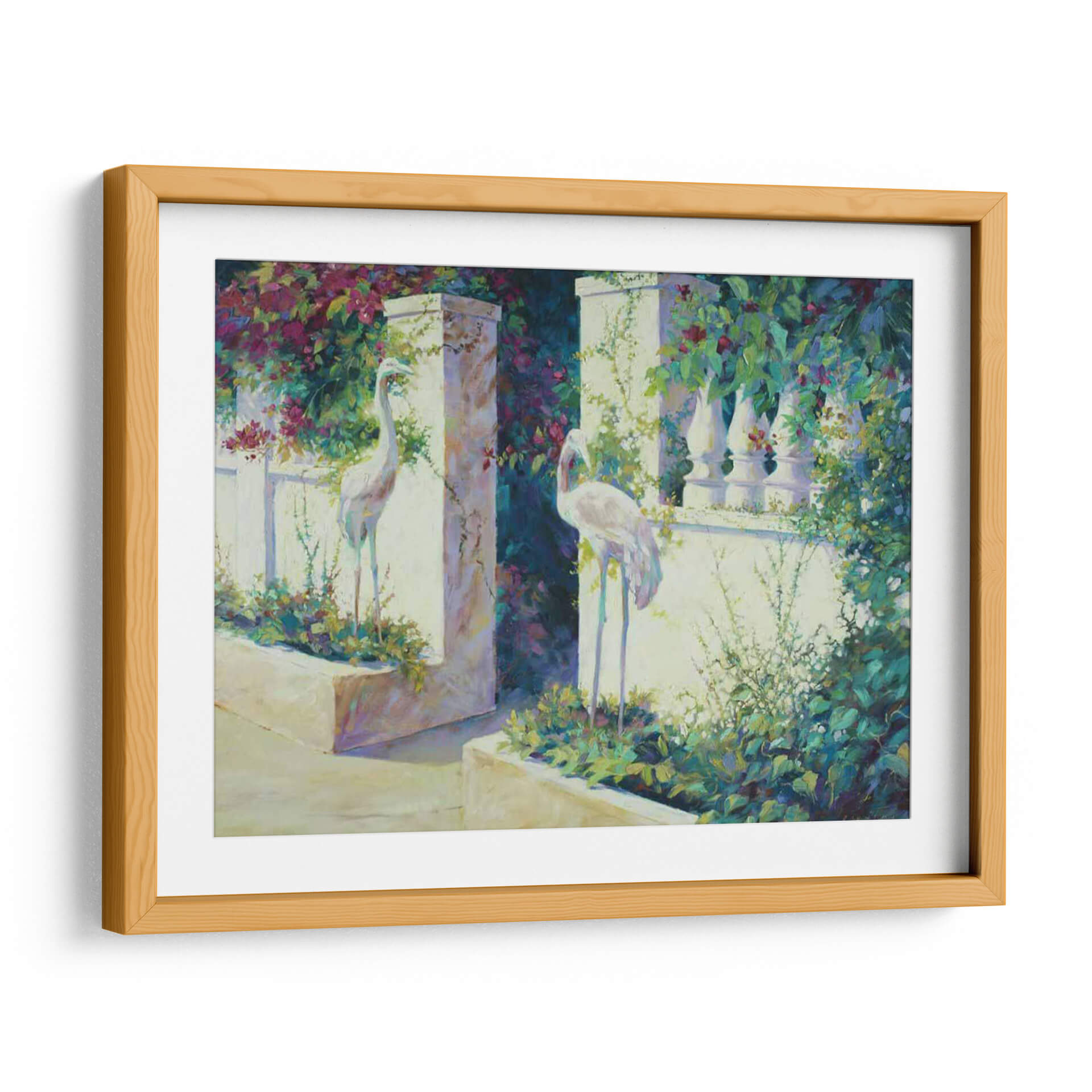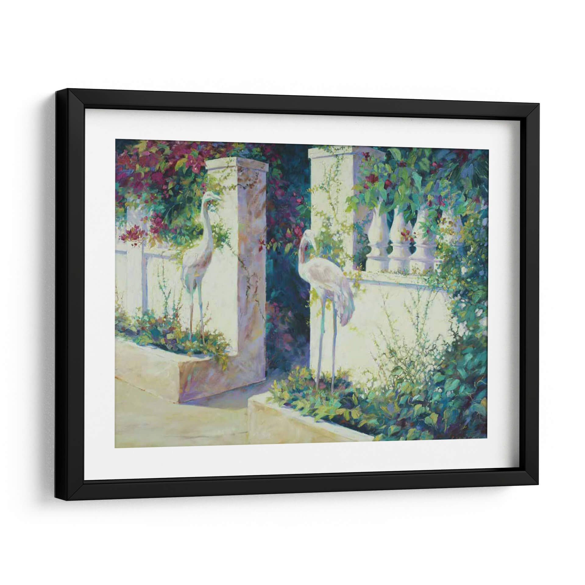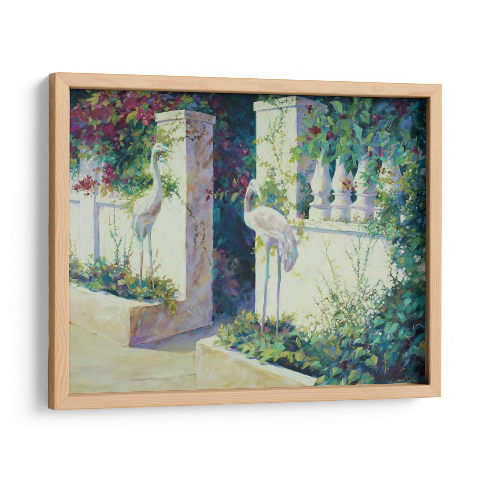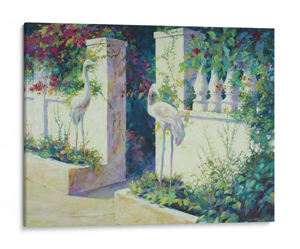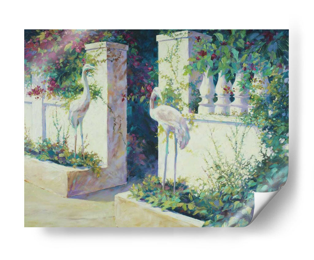 Sumérgete en la serenidad y el encanto exótico de "Centinela", una cautivadora obra de arte del artista Julie G. Pollard. Esta pintura transporta al espectador a un jardín exuberante y bañado por el sol, donde dos esbeltas aves, posiblemente garzas o flamencos, se erigen con gracia junto a pilares de mármol y una balaustrada clásica. La rica paleta de colores, dominada por verdes intensos, vibrantes toques de fucsia y blancos luminosos, crea una atmósfera de paz y sofisticación. La técnica pictórica, con pinceladas sueltas pero precisas, evoca una sensación de movimiento y vida, capturando la belleza efímera de la naturaleza en su máxima expresión. "Centinela" es una pieza ideal para añadir un toque de elegancia atemporal y un aire de tranquilidad a cualquier espacio, ya sea una sala de estar luminosa, un sereno dormitorio o un sofisticado estudio. Este cuadro decorativo no solo embellece tu pared, sino que invita a la contemplación y a la evasión, convirtiéndose en un punto focal que inspira calma y admira la belleza natural. Descubre cómo esta obra puede transformar tu hogar en un oasis de paz y estilo, resonando con quienes aprecian el arte figurativo y los escenarios idílicos.