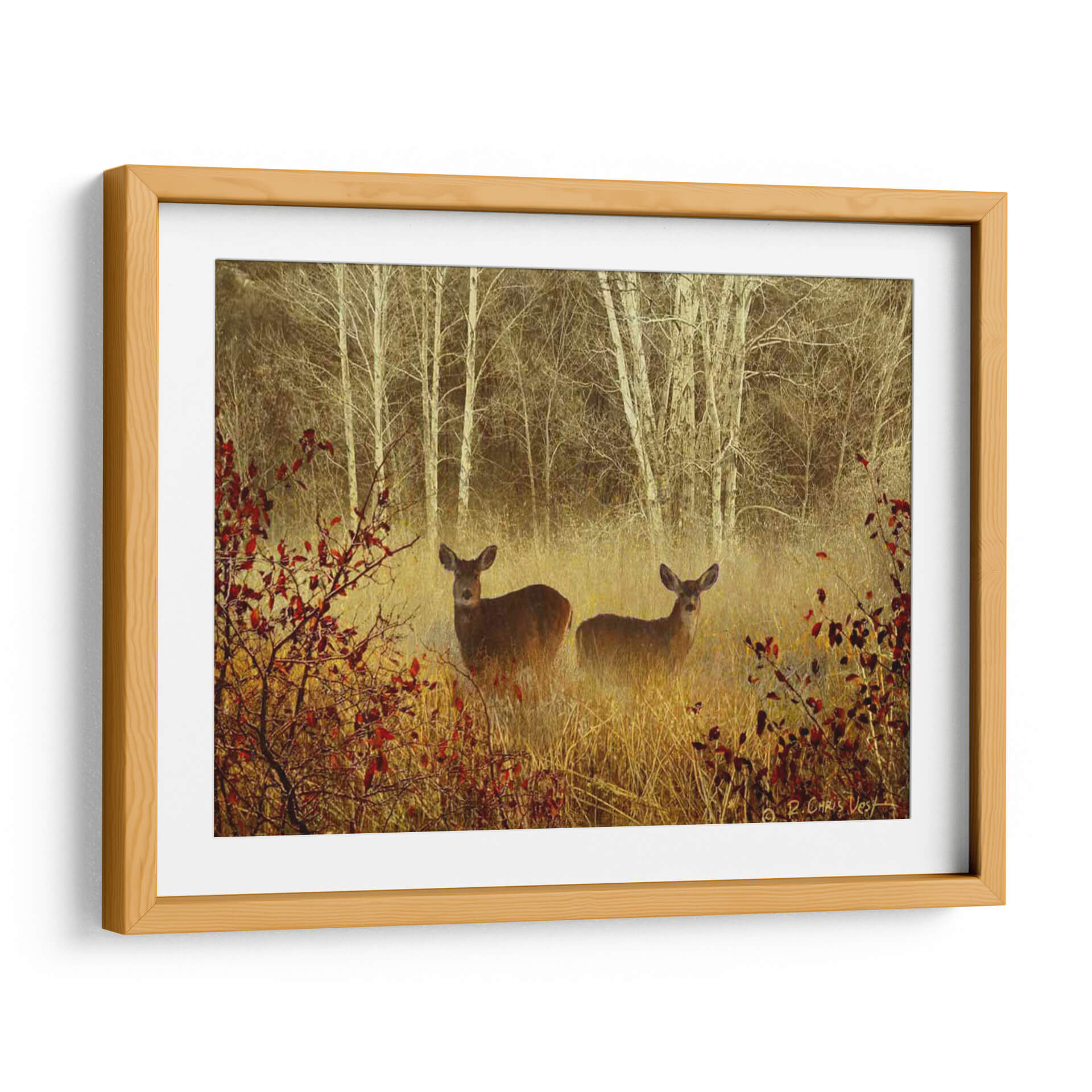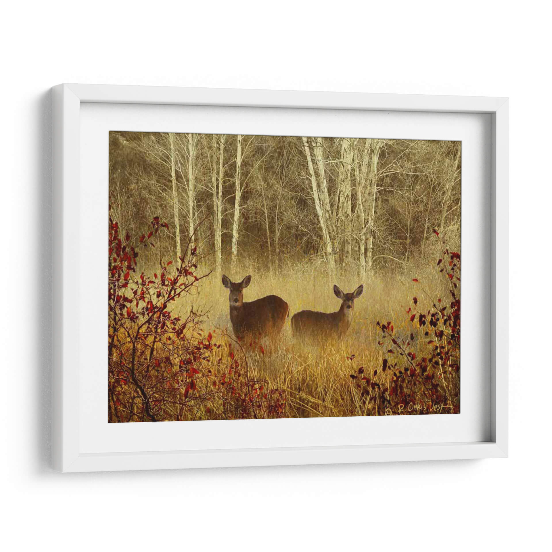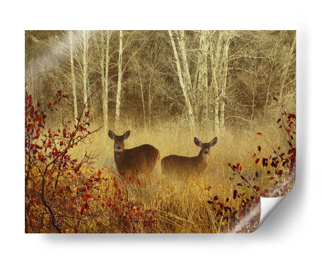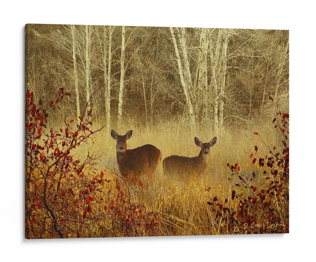 Sumérgete en la serenidad de la naturaleza con 'Ciervo Brumoso', una obra de arte que captura la etérea belleza de un bosque neblinoso. Dos ciervos emergen con delicadeza entre la vegetación dorada y los troncos pálidos de los abedules, envueltos en una atmósfera de misterio y paz. La paleta de colores, dominada por tonos tierra cálidos, ocres y el contraste sutil de las hojas rojizas, crea una sensación de profundidad y calidez otoñal. El estilo evocador y ligeramente impresionista de Chris Vest da vida a esta escena, invitando a la contemplación y al sosiego. Este cuadro decorativo es ideal para quienes buscan añadir un toque de tranquilidad y conexión con la vida salvaje a sus espacios. Perfecto para salones, dormitorios o estudios que deseen un punto focal orgánico y espiritual. La composición, que juega con la profundidad y el enfoque selectivo, atrae la mirada hacia los protagonistas, generando una conexión íntima. 'Ciervo Brumoso' no es solo una decoración, es una ventana a un momento de quietud natural, una pieza que transformará tu hogar en un santuario de calma y belleza.
