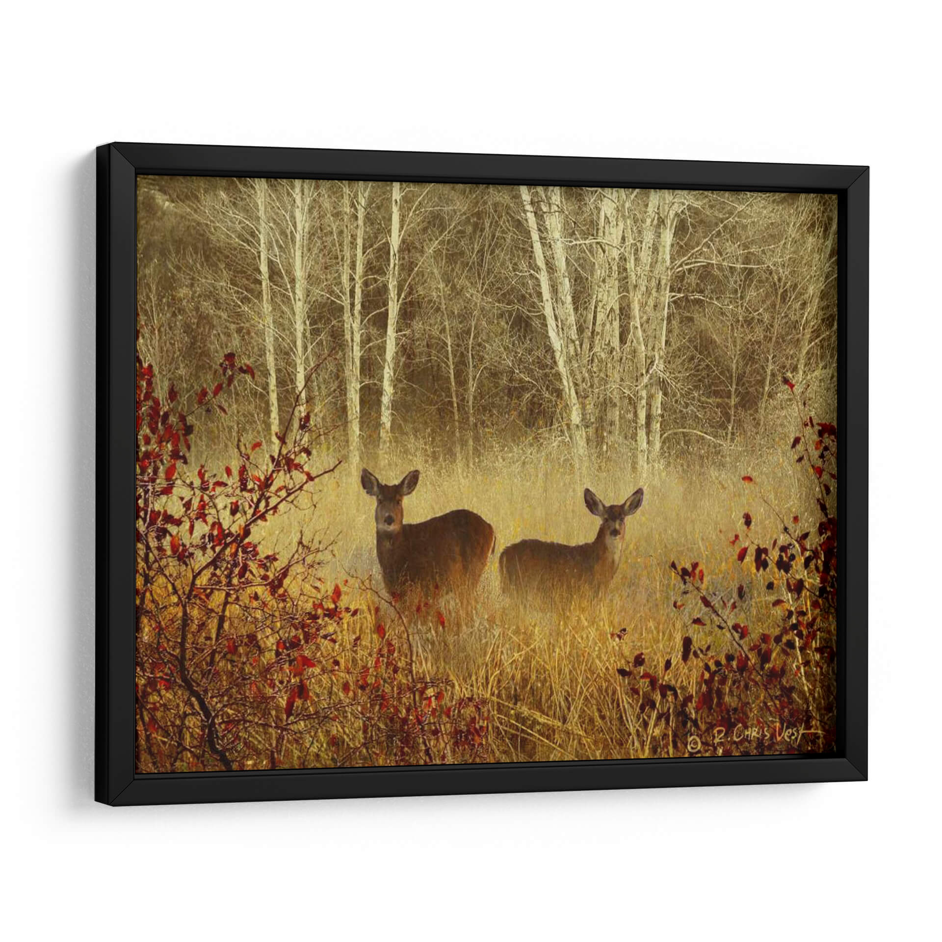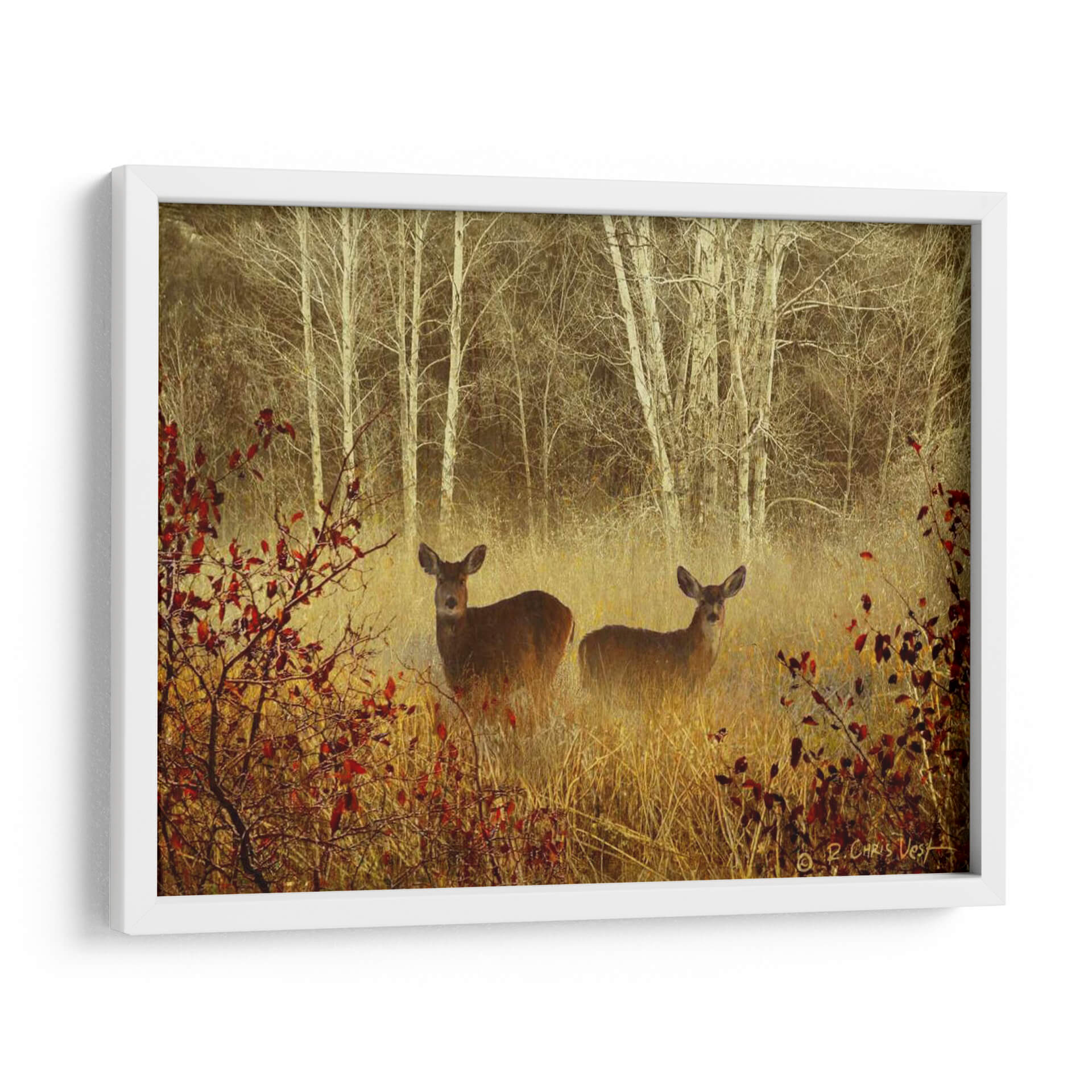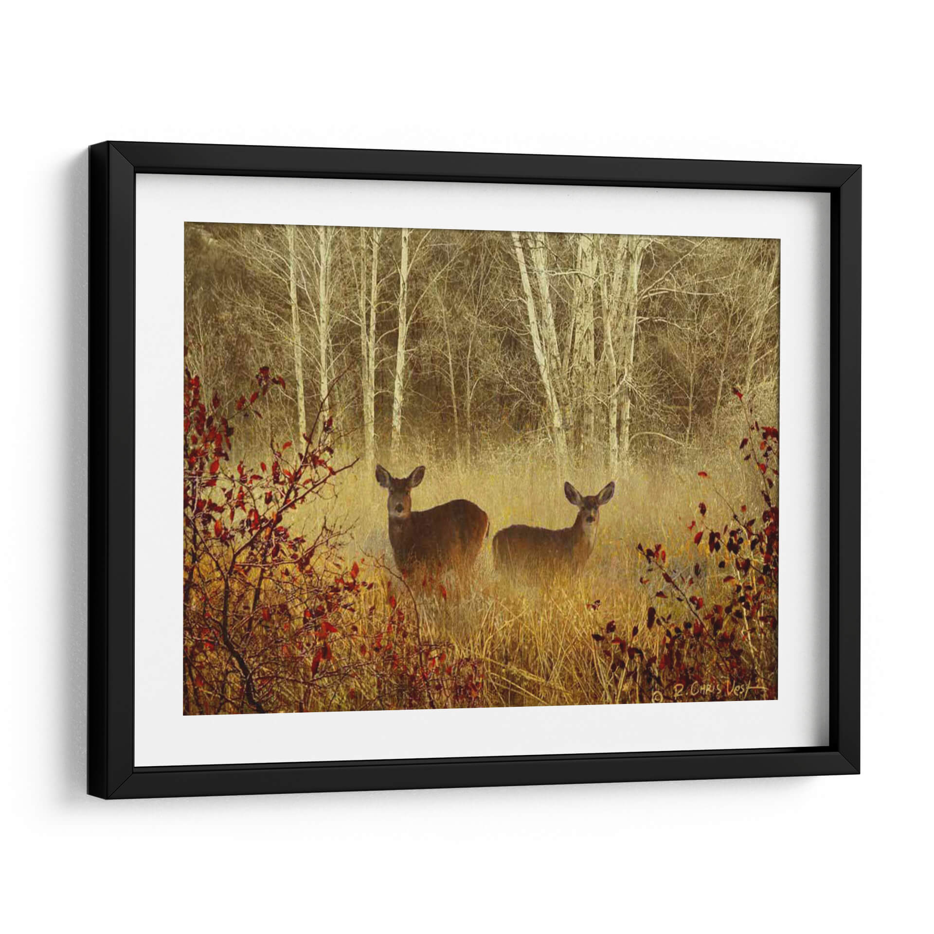 Sumérgete en la serenidad de la naturaleza con 'Ciervo Brumoso', una obra de arte que captura la etérea belleza de un bosque neblinoso. Dos ciervos emergen con delicadeza entre la vegetación dorada y los troncos pálidos de los abedules, envueltos en una atmósfera de misterio y paz. La paleta de colores, dominada por tonos tierra cálidos, ocres y el contraste sutil de las hojas rojizas, crea una sensación de profundidad y calidez otoñal. El estilo evocador y ligeramente impresionista de Chris Vest da vida a esta escena, invitando a la contemplación y al sosiego. Este cuadro decorativo es ideal para quienes buscan añadir un toque de tranquilidad y conexión con la vida salvaje a sus espacios. Perfecto para salones, dormitorios o estudios que deseen un punto focal orgánico y espiritual. La composición, que juega con la profundidad y el enfoque selectivo, atrae la mirada hacia los protagonistas, generando una conexión íntima. 'Ciervo Brumoso' no es solo una decoración, es una ventana a un momento de quietud natural, una pieza que transformará tu hogar en un santuario de calma y belleza.