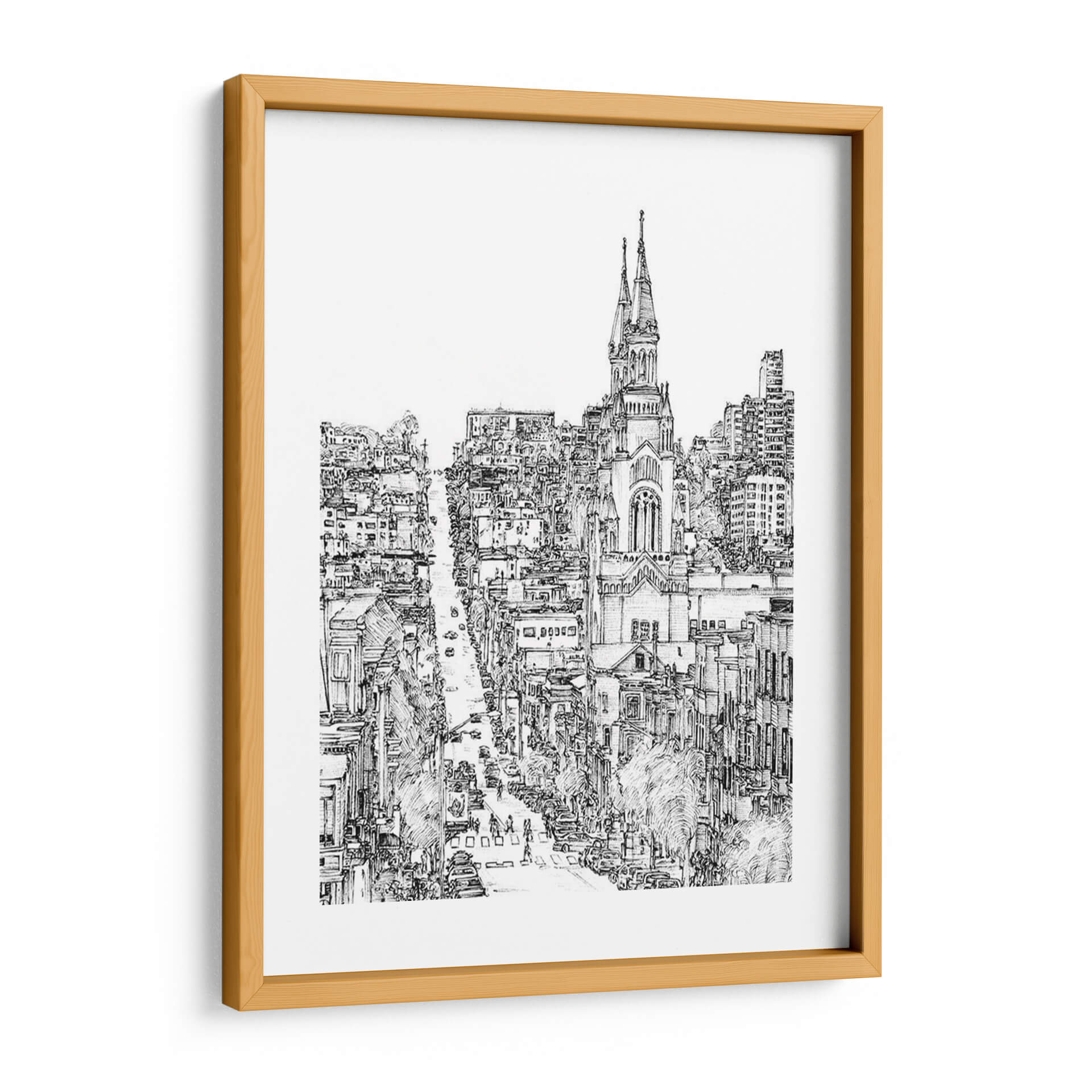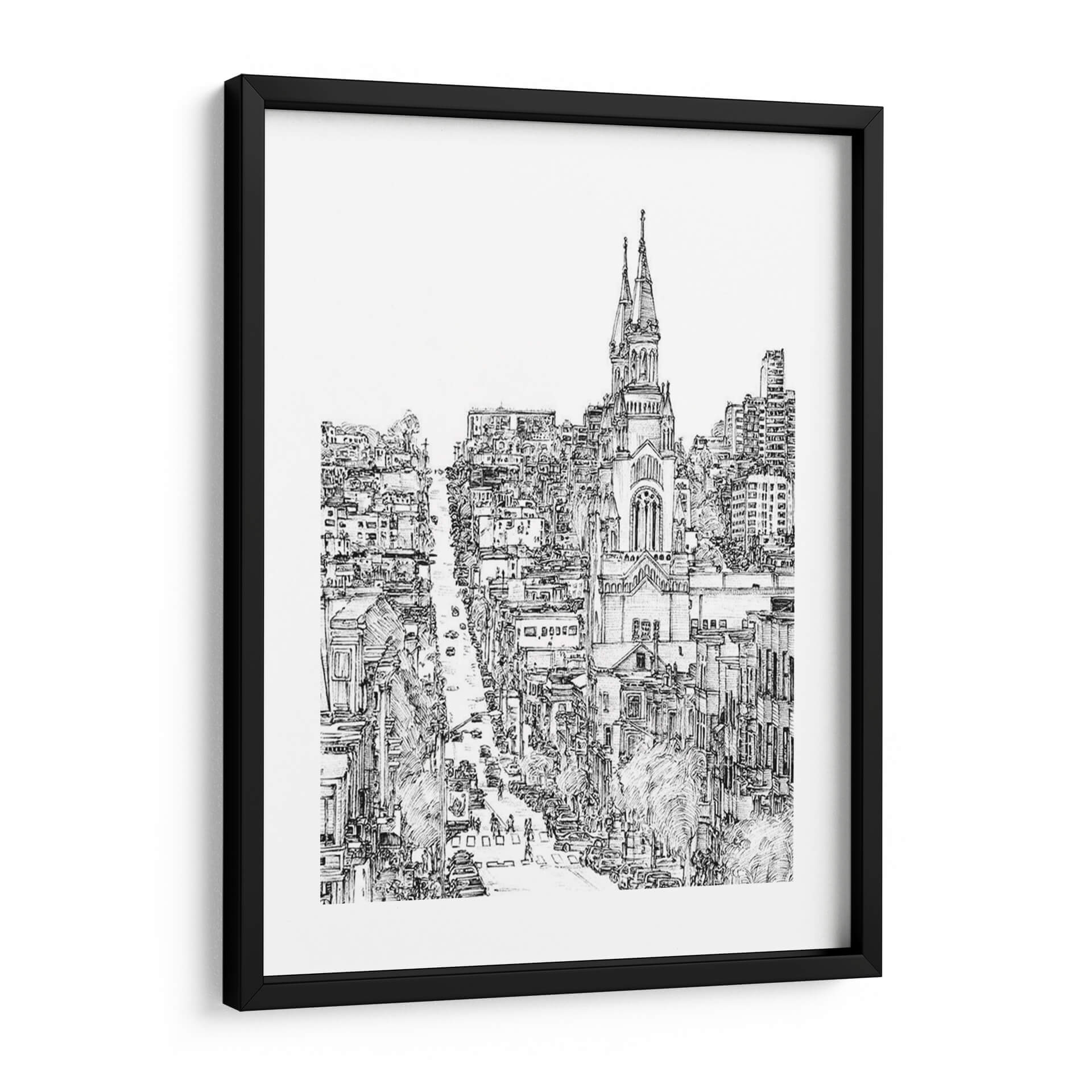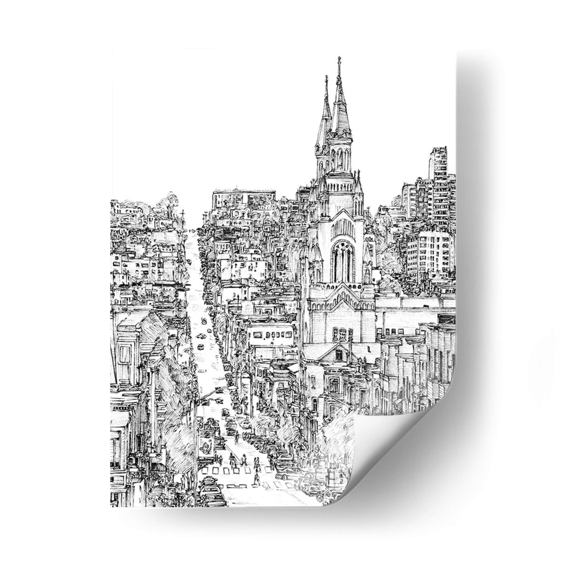 Captura la esencia vibrante de la vida urbana con "Ciudad en Blanco y Negro IV", una obra de arte excepcional de Melissa Wang. Este cuadro decorativo te transporta a las bulliciosas calles de una metrópoli, representada con un detallado trazo a lápiz que evoca la energía y el dinamismo de la arquitectura clásica y moderna entrelazadas. La paleta monocromática, rica en contrastes de luces y sombras, dota a la pieza de una profundidad y sofisticación atemporales, permitiendo que cada elemento cobre vida propia. Observa la majestuosa iglesia con sus torres que se alzan hacia el cielo, flanqueada por edificios de diversas alturas y estilos, creando una composición visualmente cautivadora. El movimiento de los vehículos y las figuras humanas a pie de calle añade una sensación de cotidianidad y realismo, invitándote a imaginar tu propia historia dentro de esta escena. Este cuadro es perfecto para añadir un toque de elegancia urbana a tu salón, estudio u oficina, sirviendo como un punto focal que inspira conversación y admiración. Ideal para amantes del arte urbano, la arquitectura y las representaciones gráficas con carácter.