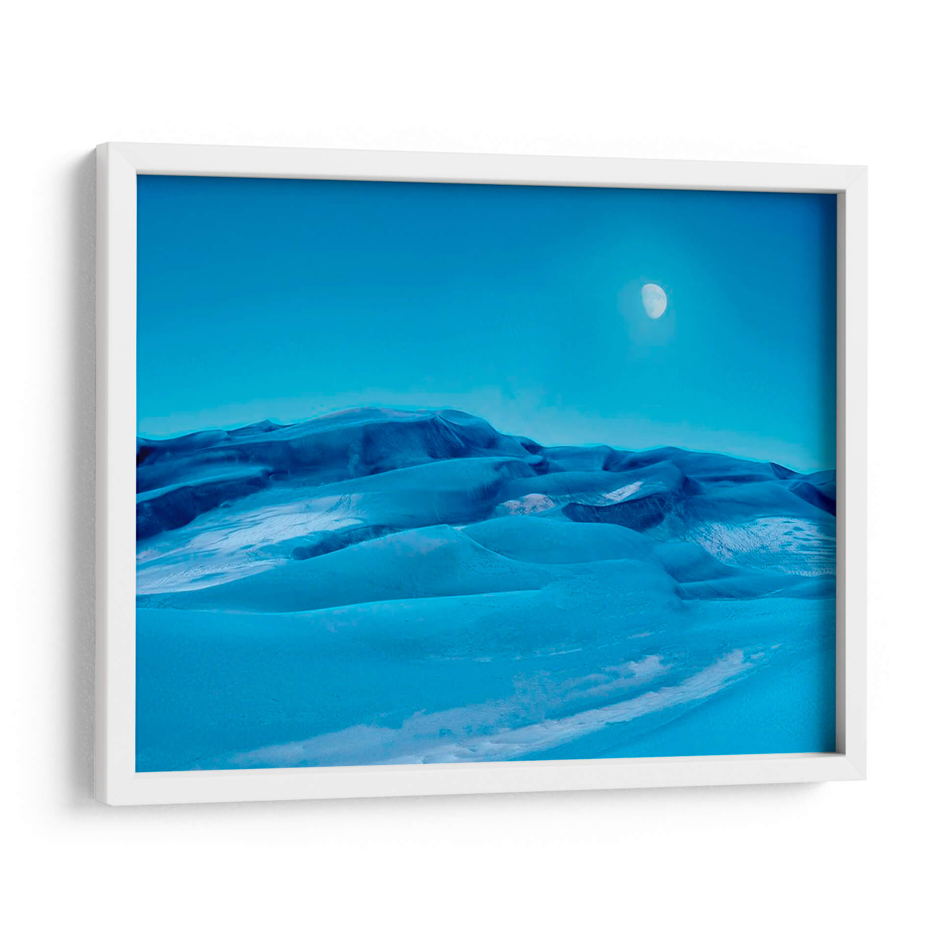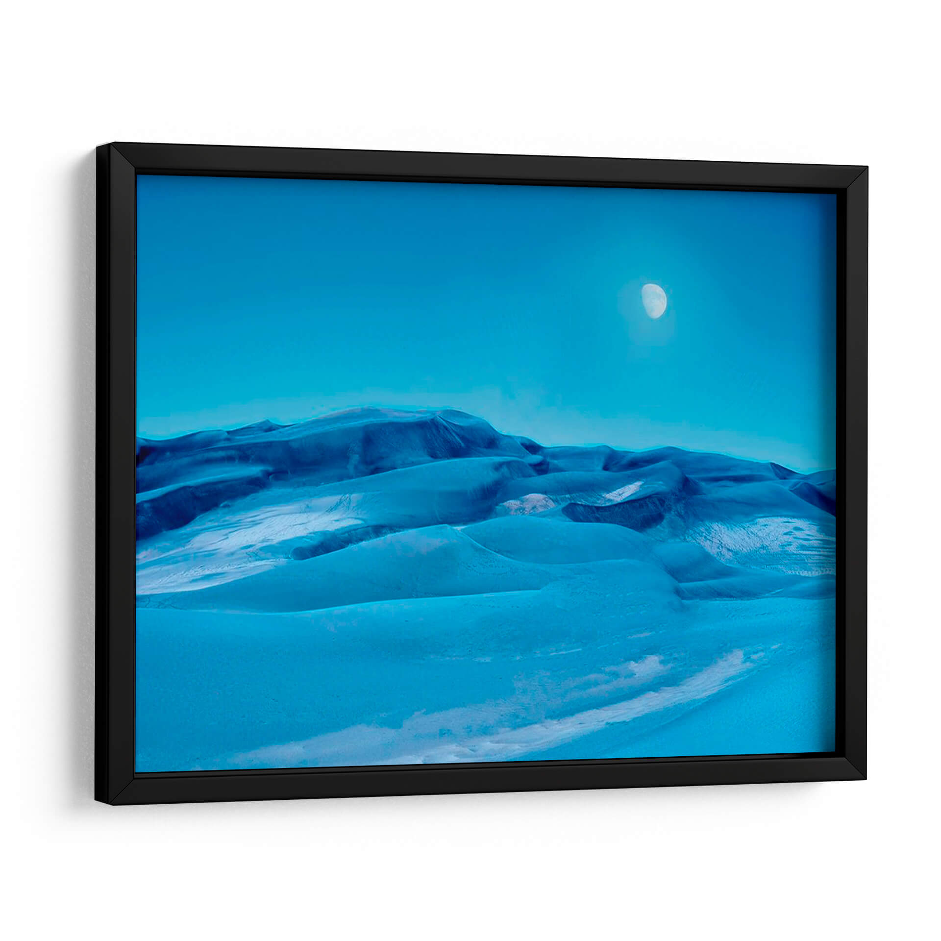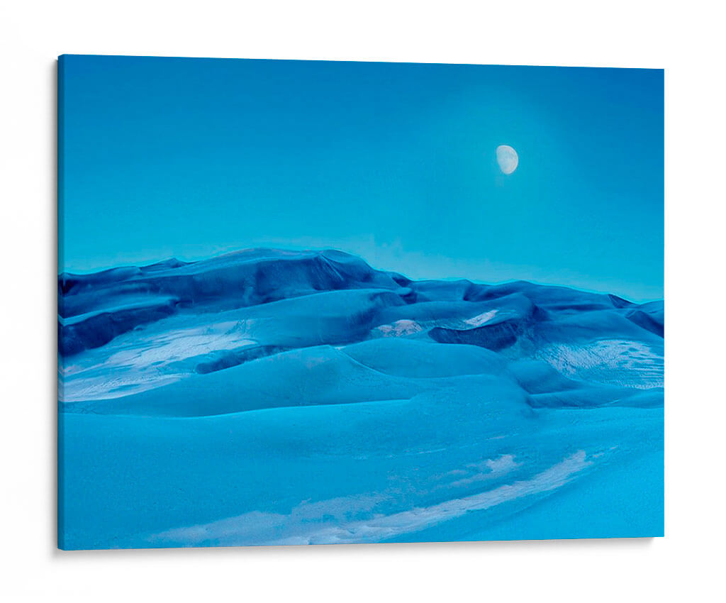 Sumérgete en la serenidad de 'Colorado Dunes V', una cautivadora obra de arte de James McLoughlin que captura la belleza etérea de un paisaje desértico teñido de azules profundos y celestes. Este cuadro decorativo presenta una evocadora representación de dunas ondulantes bajo un cielo despejado, con la sutil presencia de la luna añadiendo un toque de misterio y tranquilidad. Los tonos azules predominantes, desde el índigo oscuro en las sombras hasta el cerúleo brillante en las cumbres, crean una atmósfera de calma y contemplación. La composición, con sus suaves curvas y la vastedad del cielo, invita a la introspección y a la admiración por la naturaleza. Ideal para quienes buscan añadir un toque de sofisticación y paz a su hogar u oficina, este cuadro de paisaje abstracto se integra perfectamente en decoraciones modernas, minimalistas o contemporáneas. Transforma tu espacio en un oasis de serenidad con esta pieza única que evoca la inmensidad y la belleza silenciosa de la naturaleza. Perfecto como arte para sala de estar, dormitorio o incluso un estudio, 'Colorado Dunes V' es una invitación a la relajación y al asombro.