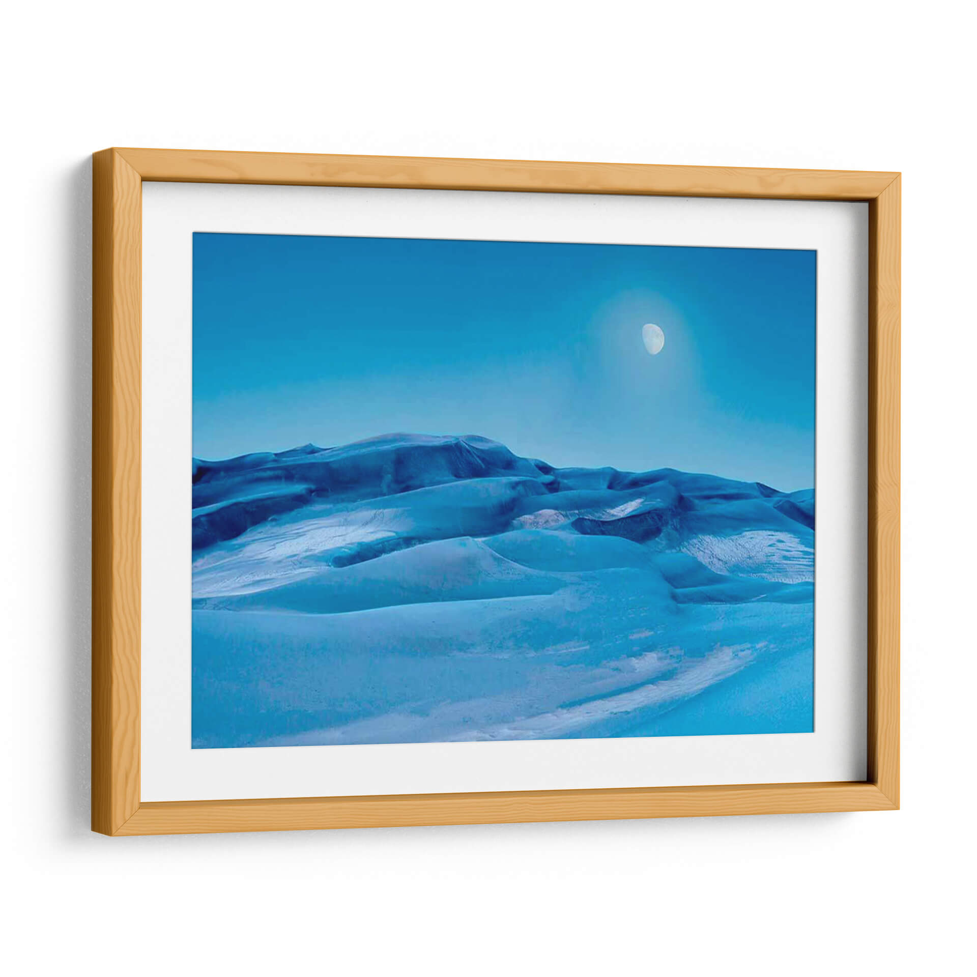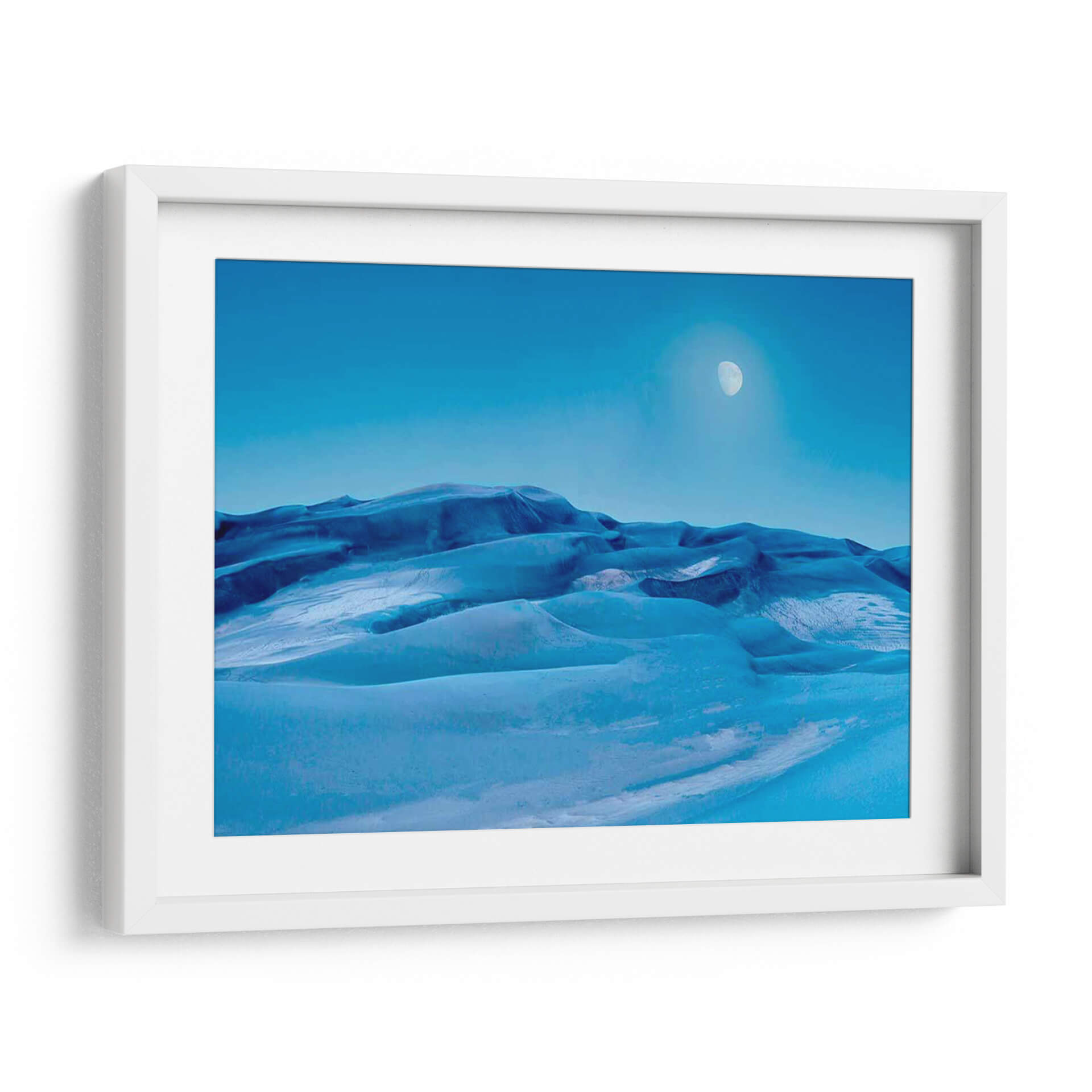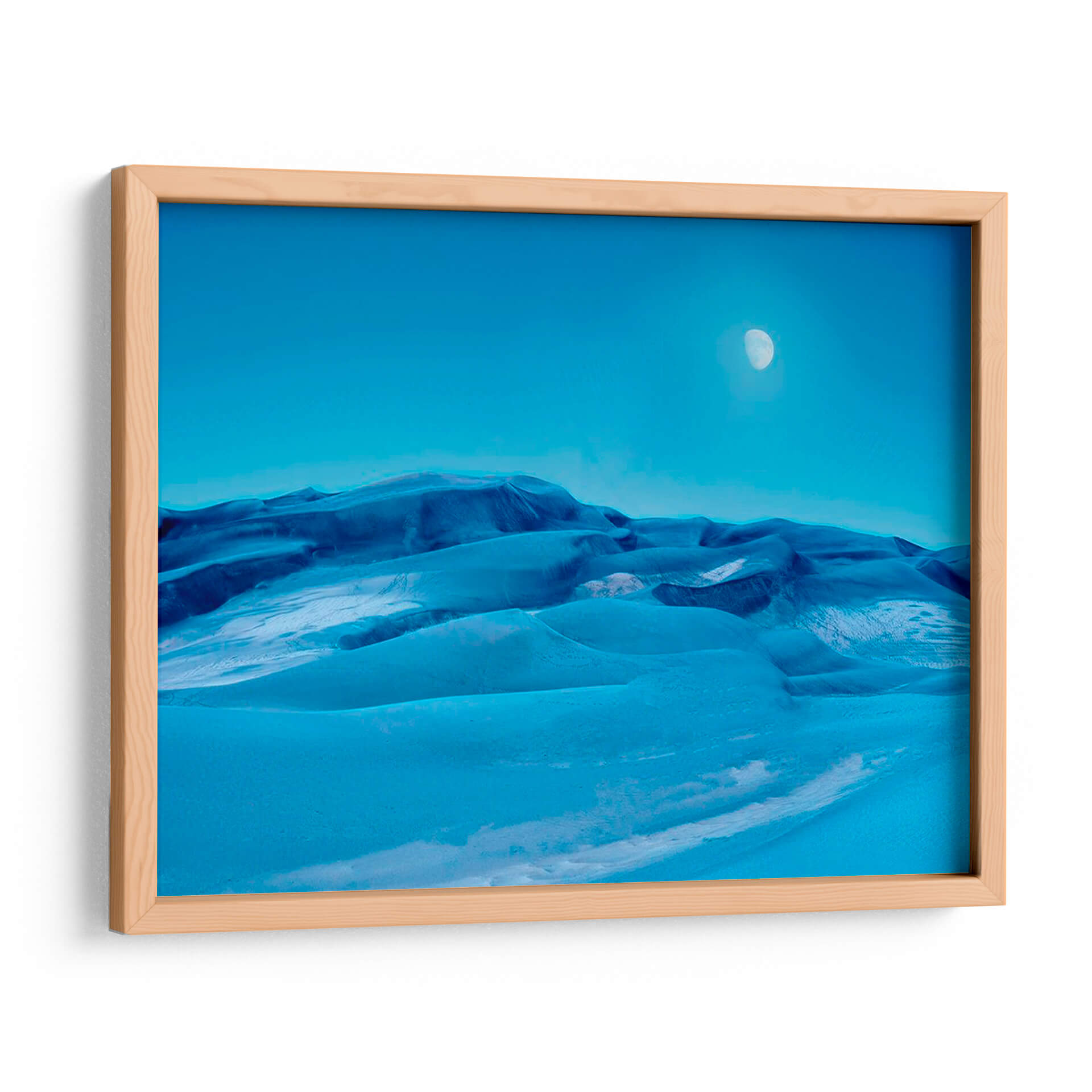 Sumérgete en la serenidad de 'Colorado Dunes V', una cautivadora obra de arte de James McLoughlin que captura la belleza etérea de un paisaje desértico teñido de azules profundos y celestes. Este cuadro decorativo presenta una evocadora representación de dunas ondulantes bajo un cielo despejado, con la sutil presencia de la luna añadiendo un toque de misterio y tranquilidad. Los tonos azules predominantes, desde el índigo oscuro en las sombras hasta el cerúleo brillante en las cumbres, crean una atmósfera de calma y contemplación. La composición, con sus suaves curvas y la vastedad del cielo, invita a la introspección y a la admiración por la naturaleza. Ideal para quienes buscan añadir un toque de sofisticación y paz a su hogar u oficina, este cuadro de paisaje abstracto se integra perfectamente en decoraciones modernas, minimalistas o contemporáneas. Transforma tu espacio en un oasis de serenidad con esta pieza única que evoca la inmensidad y la belleza silenciosa de la naturaleza. Perfecto como arte para sala de estar, dormitorio o incluso un estudio, 'Colorado Dunes V' es una invitación a la relajación y al asombro.