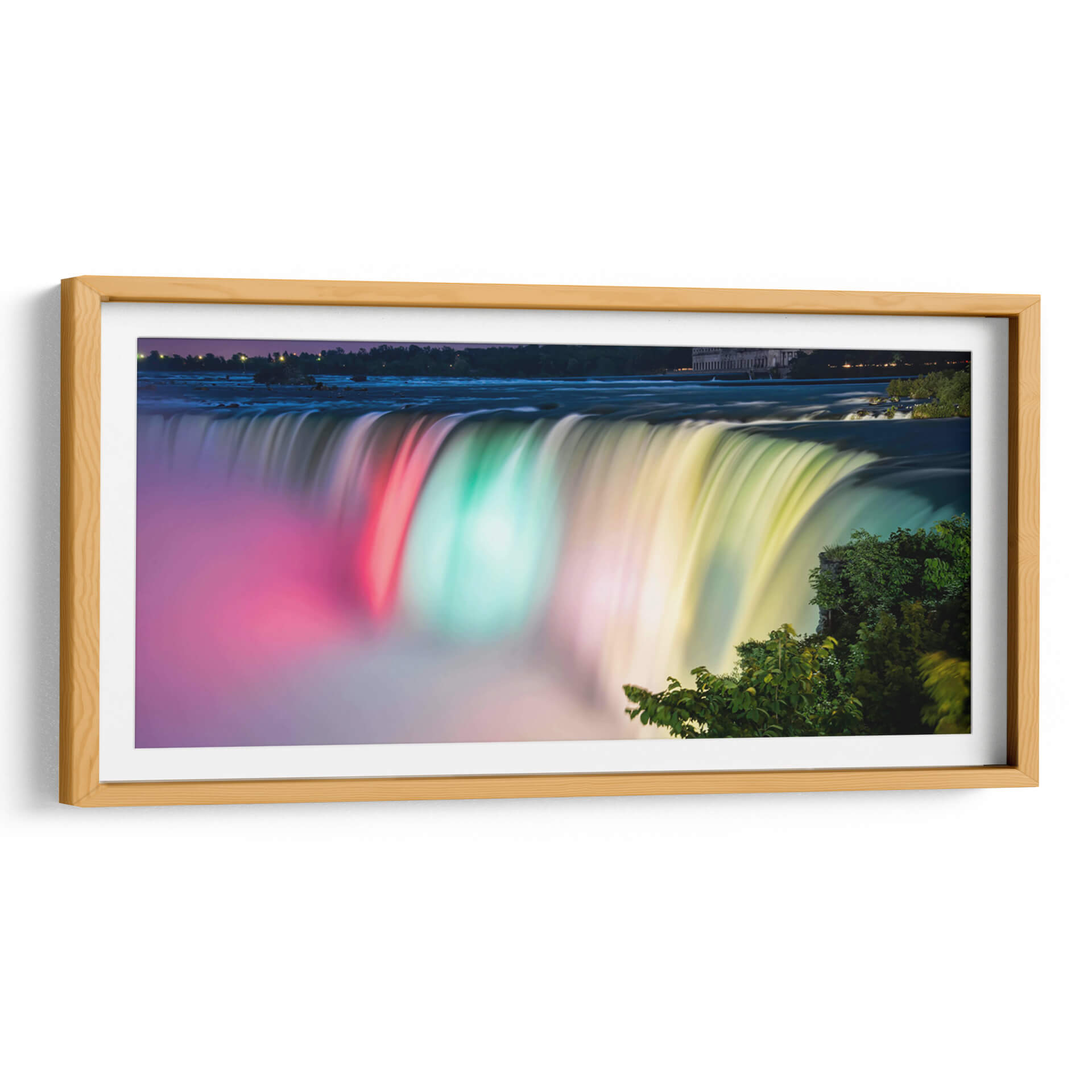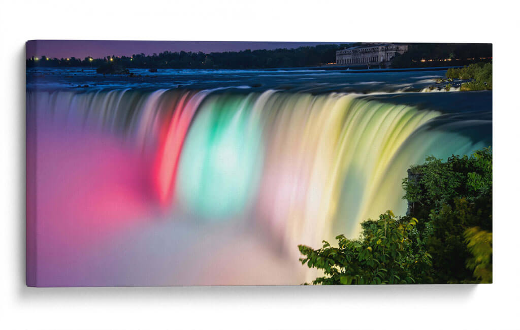 Sumérgete en la majestuosidad de "Colores en las Cataratas del Niagara", un cuadro decorativo que captura la fuerza y la belleza de la naturaleza con una paleta de colores vibrantes y etéreos. Esta obra maestra evoca la sensación de estar presenciando el espectáculo de las cataratas iluminadas, donde las caídas de agua se tiñen de tonos rosados, turquesas y dorados, creando una atmósfera mágica y envolvente. La composición dinámica, con el agua cayendo en cascada y la vegetación frondosa en primer plano, añade profundidad y realismo a la escena. Ideal para quienes buscan infundir energía y un toque de color a su sala de estar, oficina o cualquier espacio que necesite un punto focal inspirador. La técnica utilizada difumina los contornos, sugiriendo movimiento y la inmensidad del paisaje, lo que resulta en una pieza de arte contemporáneo que armoniza elementos de la fotografía paisajística con una interpretación artística audaz. Transforma tu hogar en una galería personal con este cuadro decorativo que celebra la magnificencia de las cataratas, ofreciendo una ventana a un mundo de luz y color.