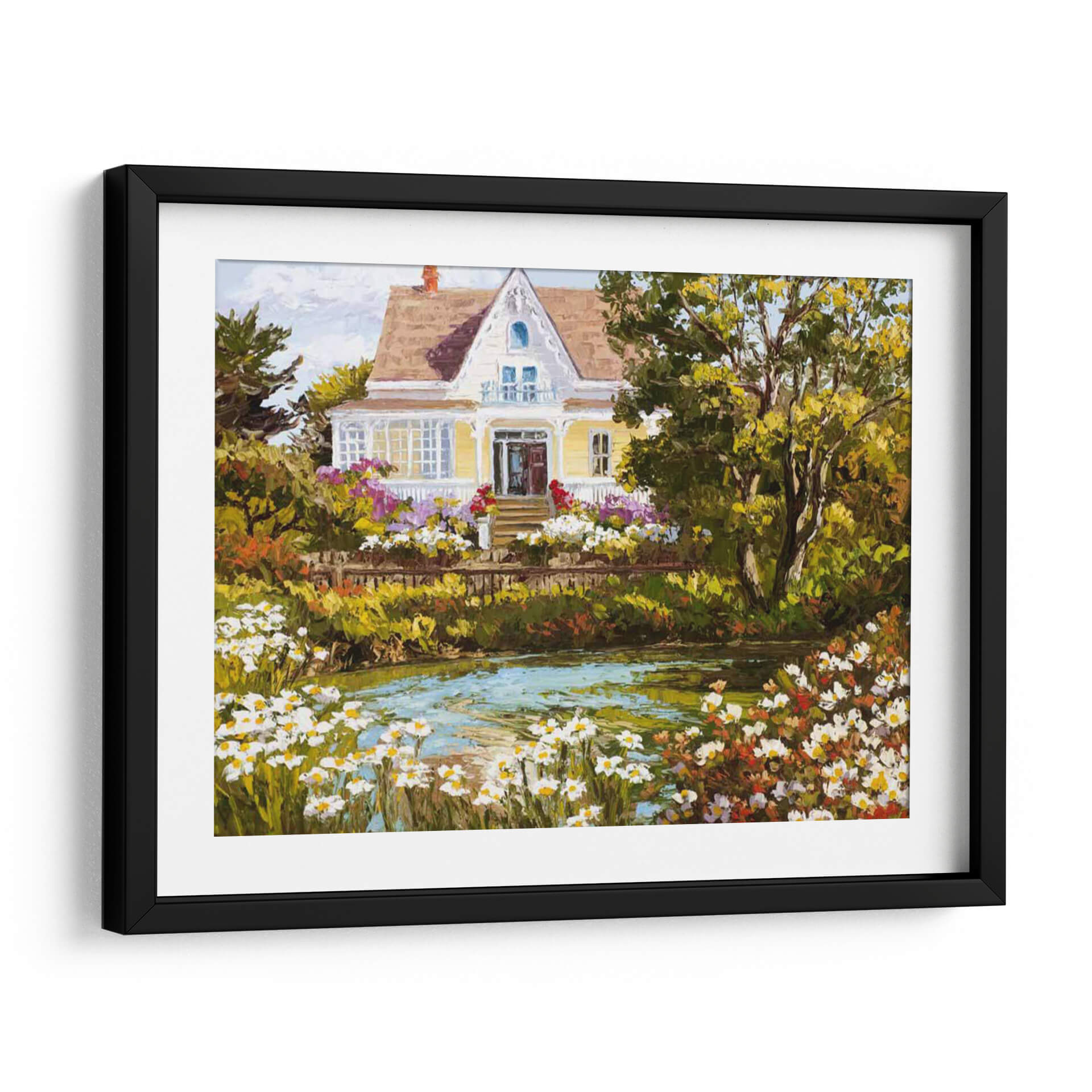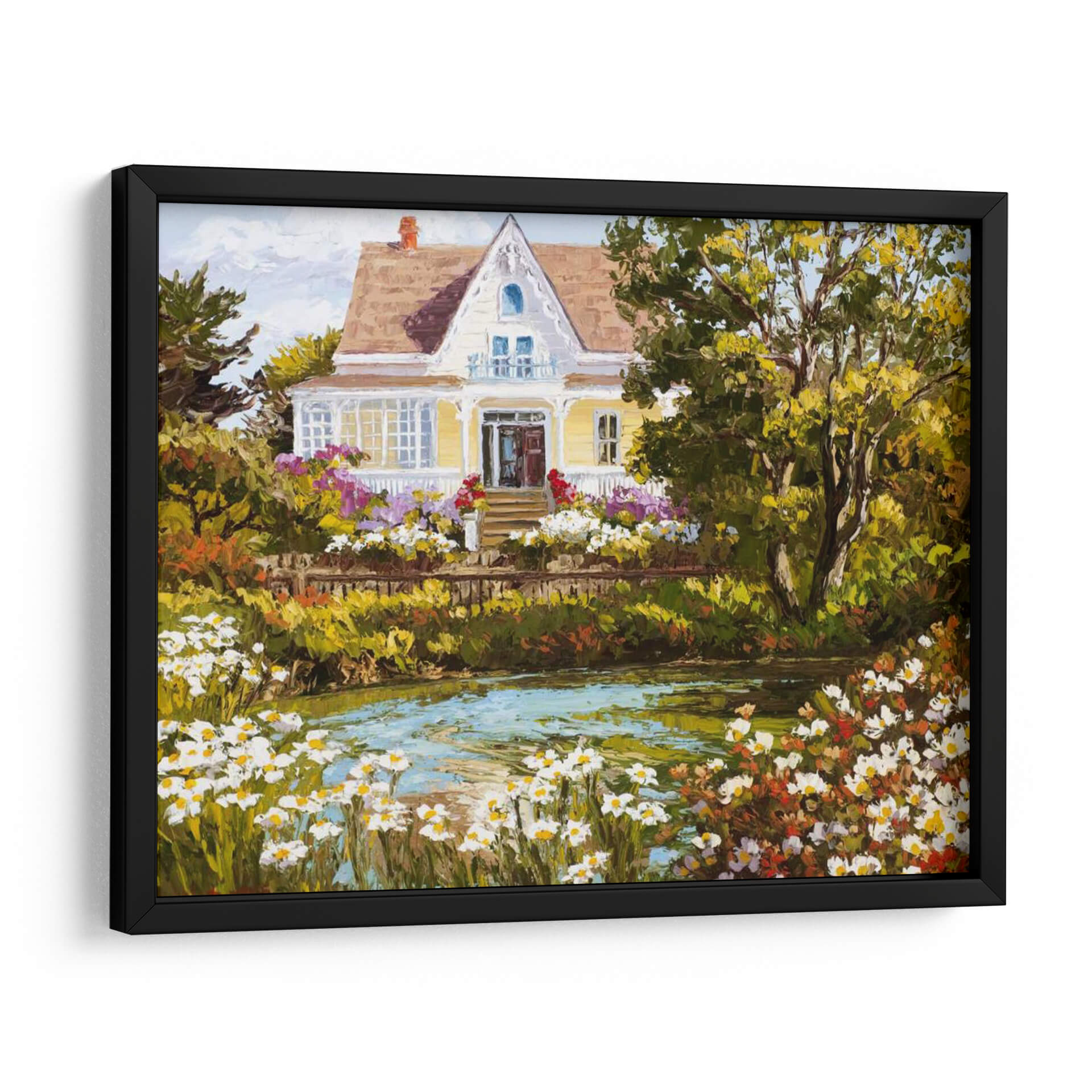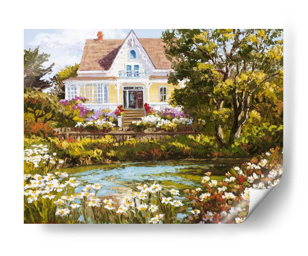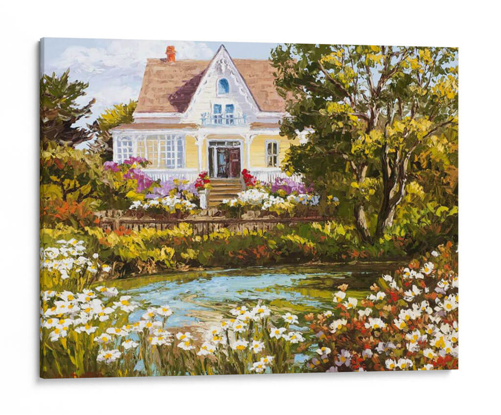 Sumérgete en la serenidad de "Con Vistas Al Estanque", una obra de arte que captura la esencia de un día apacible junto a la naturaleza. Esta pintura, impregnada de colores vibrantes y una pincelada expresiva, presenta una encantadora casa de campo rodeada de un exuberante jardín en plena floración. El estanque en primer plano, con su superficie cristalina y reflejos de luz, invita a la contemplación y la calma. La paleta de colores, dominada por verdes profundos, amarillos cálidos y toques de rosa y blanco de las flores, crea una atmósfera acogedora y llena de vida. El estilo pictórico, con influencias impresionistas, resalta la textura y la luminosidad de la escena, invitando al espectador a sentir la brisa y el aroma de las flores. "Con Vistas Al Estanque" es ideal para añadir un toque de tranquilidad y belleza natural a tu sala de estar, dormitorio o cualquier espacio que busque un refugio visual. Este cuadro decorativo es perfecto para quienes aprecian la pintura de paisajes y buscan piezas que transmitan paz y armonía.