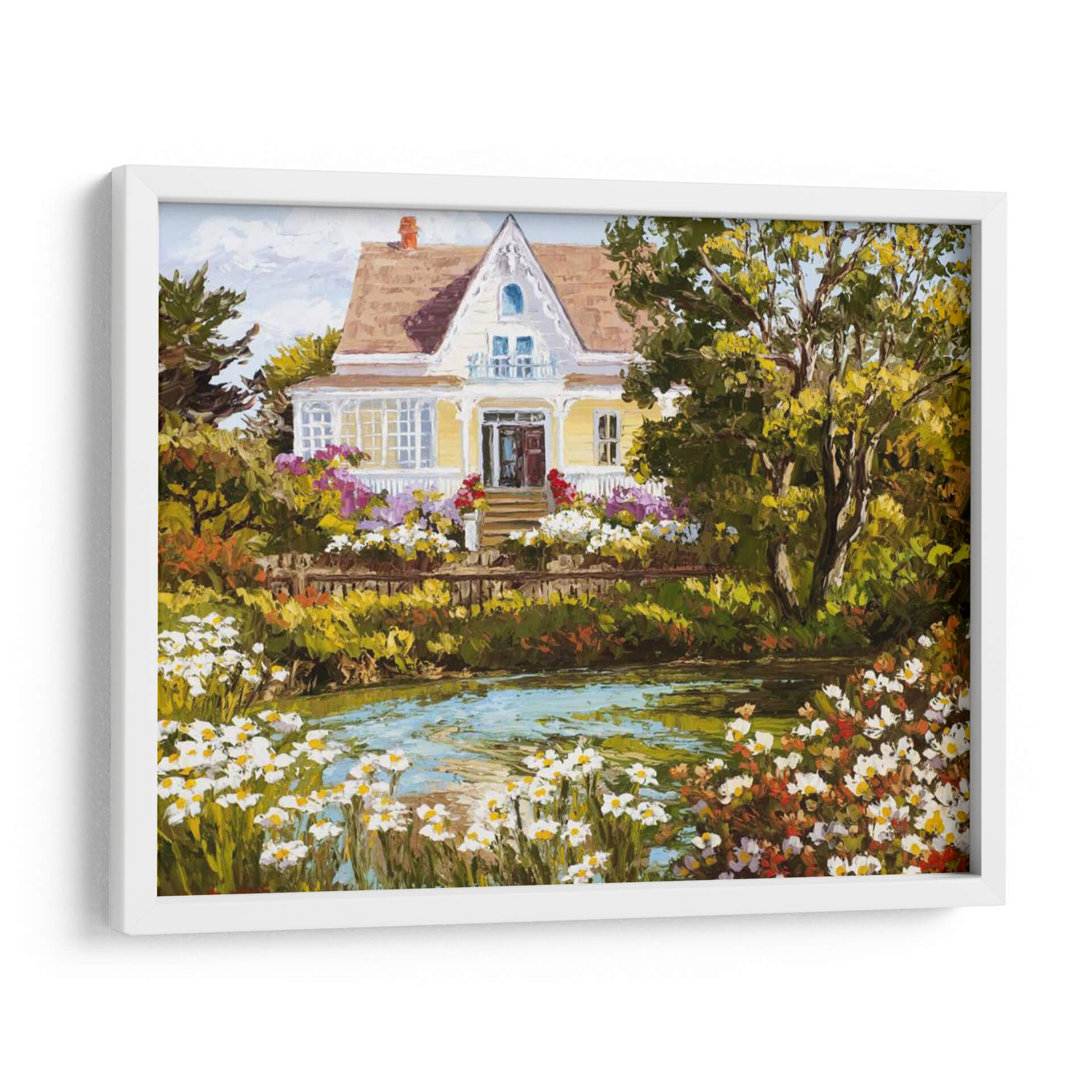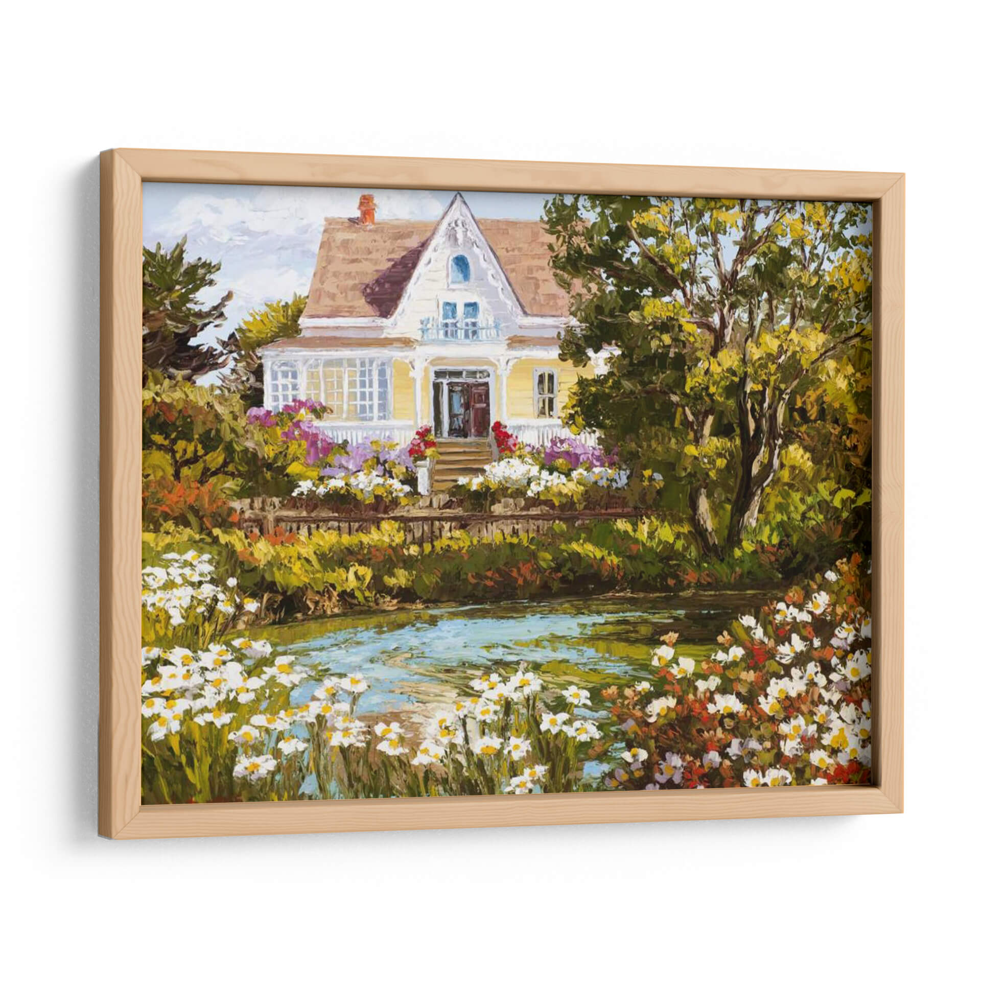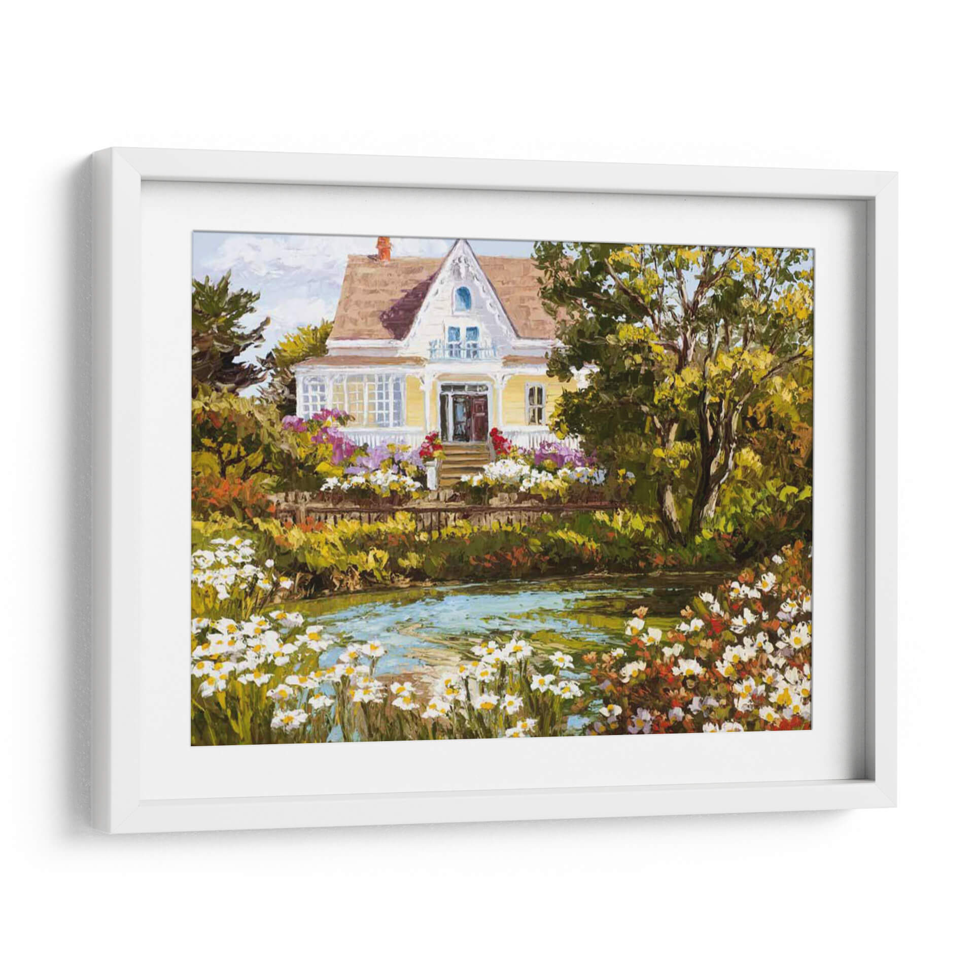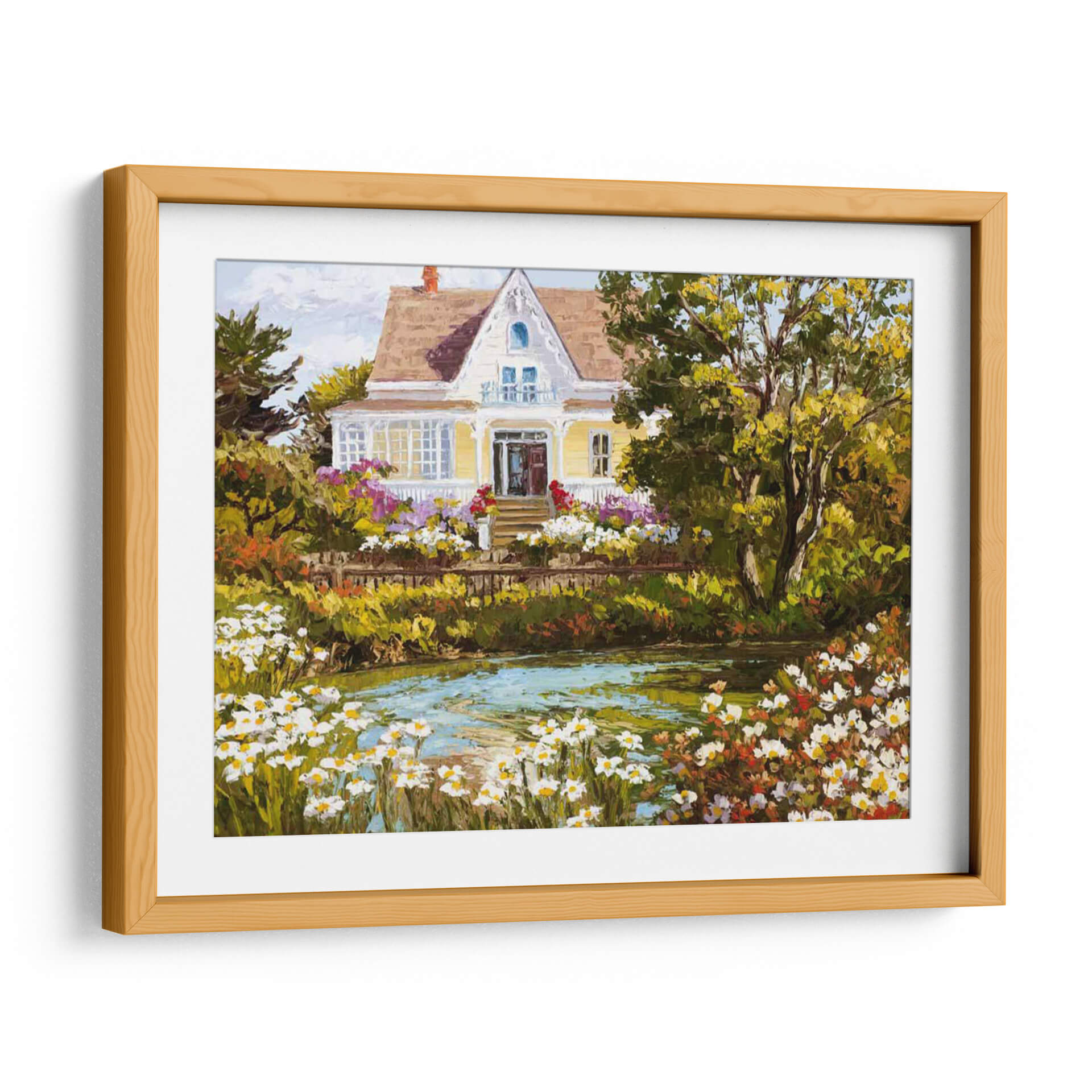 Sumérgete en la serenidad de "Con Vistas Al Estanque", una obra de arte que captura la esencia de un día apacible junto a la naturaleza. Esta pintura, impregnada de colores vibrantes y una pincelada expresiva, presenta una encantadora casa de campo rodeada de un exuberante jardín en plena floración. El estanque en primer plano, con su superficie cristalina y reflejos de luz, invita a la contemplación y la calma. La paleta de colores, dominada por verdes profundos, amarillos cálidos y toques de rosa y blanco de las flores, crea una atmósfera acogedora y llena de vida. El estilo pictórico, con influencias impresionistas, resalta la textura y la luminosidad de la escena, invitando al espectador a sentir la brisa y el aroma de las flores. "Con Vistas Al Estanque" es ideal para añadir un toque de tranquilidad y belleza natural a tu sala de estar, dormitorio o cualquier espacio que busque un refugio visual. Este cuadro decorativo es perfecto para quienes aprecian la pintura de paisajes y buscan piezas que transmitan paz y armonía.