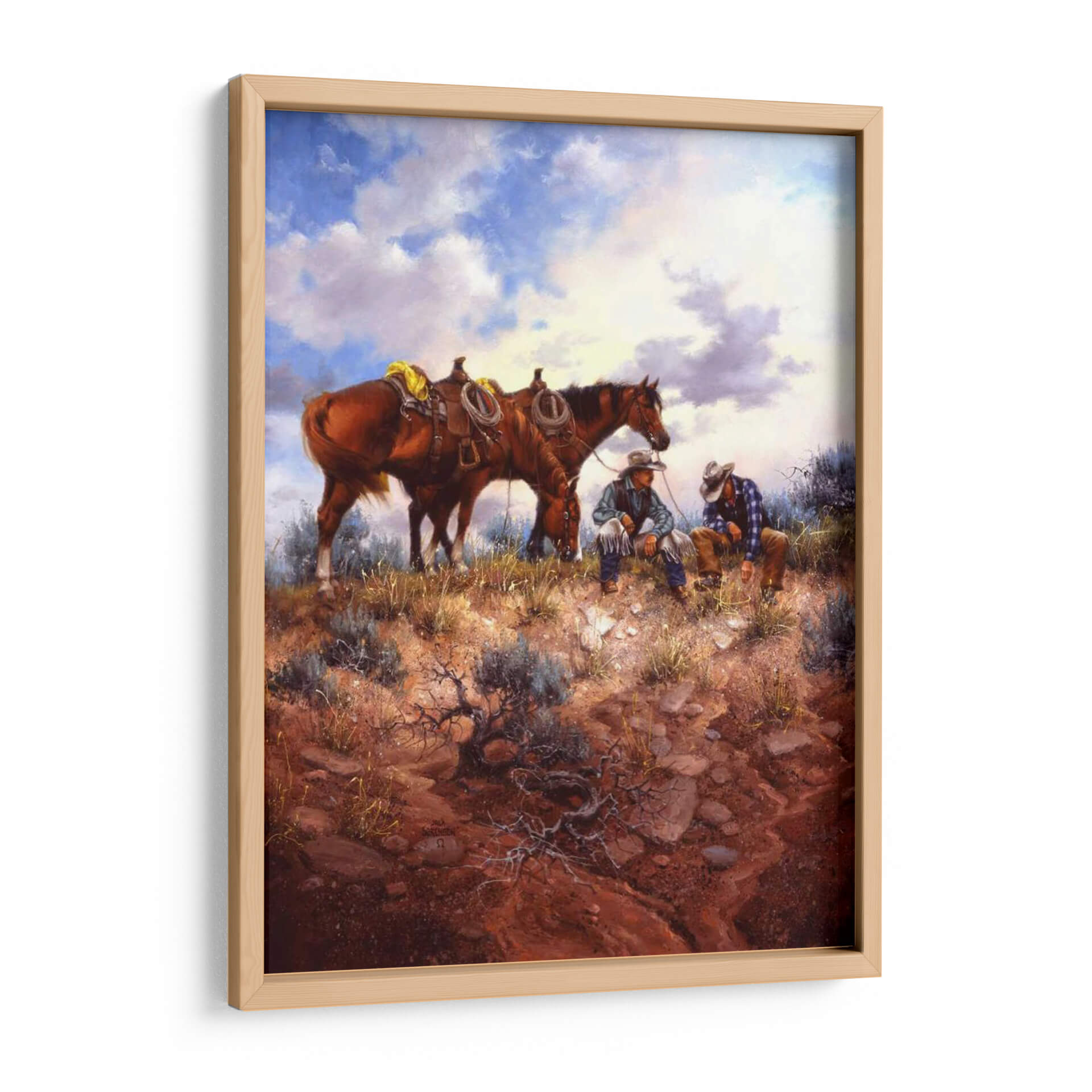 Sumérgete en la vastedad del oeste americano con "Consejo de Salvia" de Jack Sorenson, una obra maestra que captura un momento íntimo entre dos vaqueros y sus leales caballos. La escena se desarrolla en un paisaje árido y rocoso, bajo un cielo azul vibrante salpicado de nubes algodonosas, evocando una sensación de paz y camaradería. Sorenson utiliza una paleta de colores cálidos y terrosos, con toques de verde en la vegetación y el azul intenso del cielo, creando una atmósfera realista y envolvente. Los detalles en la vestimenta de los vaqueros, las riendas y las monturas de los caballos, así como la textura del terreno, demuestran un dominio excepcional de la técnica pictórica. Esta pieza, con su temática del viejo oeste y su atmósfera serena, es ideal para añadir un toque de historia y carácter a cualquier sala de estar, estudio u oficina. "Consejo de Salvia" no es solo una imagen, es una invitación a contemplar la vida sencilla y la conexión profunda entre el hombre, el caballo y la naturaleza. Perfecta para amantes del arte western y para quienes buscan una decoración de pared con alma y narrativa.