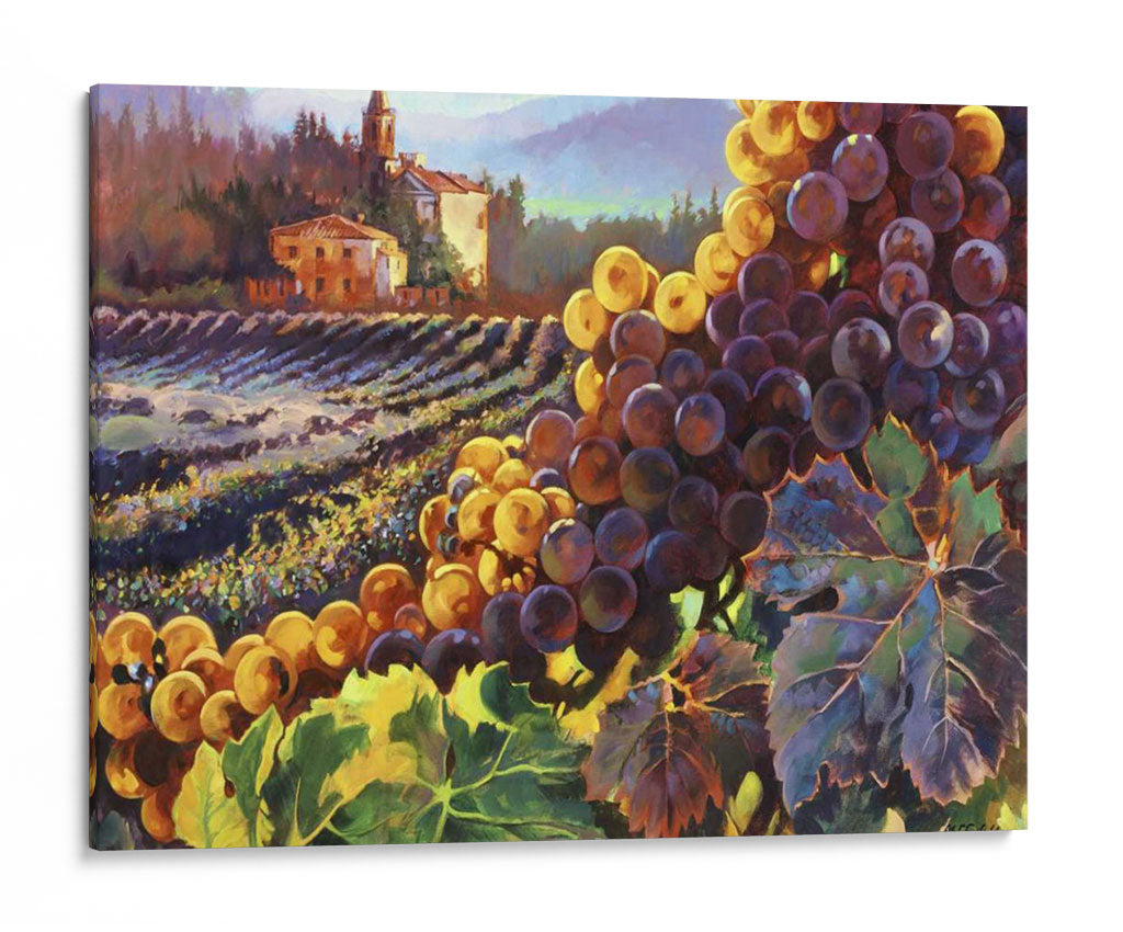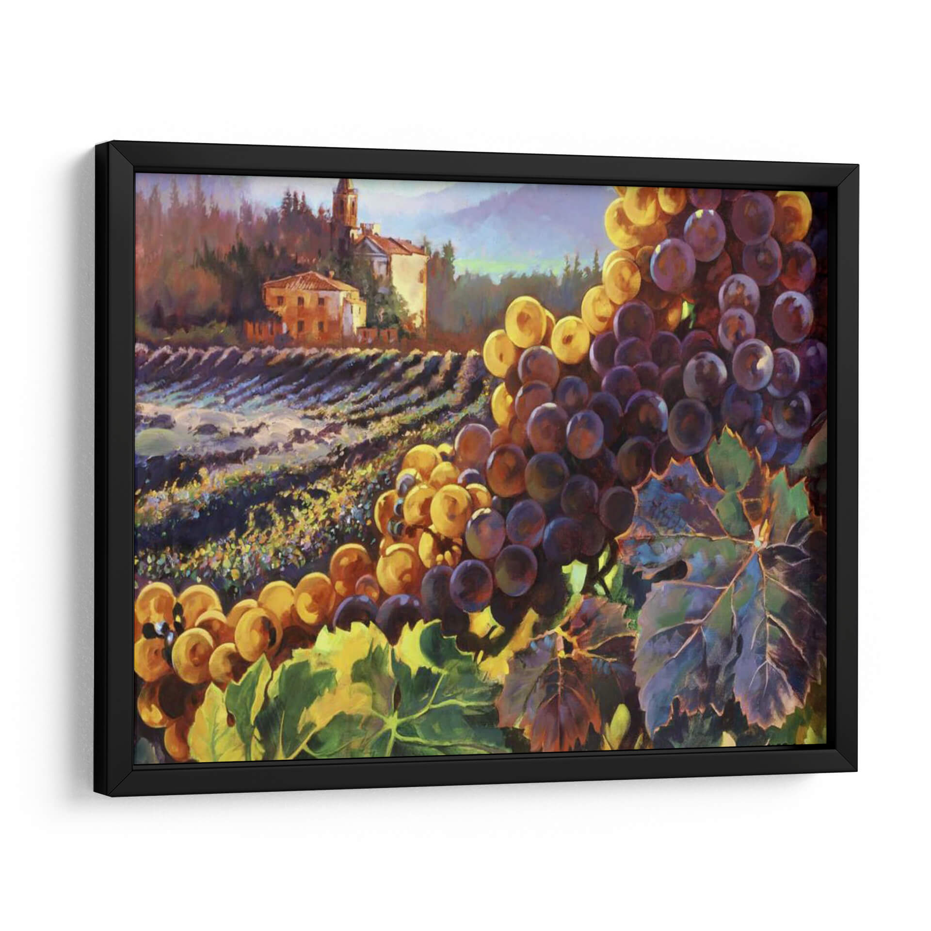 Sumérgete en la calidez de Italia con "Cosecha Toscana", una obra de arte que captura la esencia de un viñedo bañado por el sol. Los vibrantes racimos de uvas, en tonos dorados y púrpuras intensos, dominan la composición, invitando a una degustación visual. Detrás, un campo de viñedos se extiende hasta una pintoresca casa de campo con una torre, evocando la tranquilidad y la belleza rústica de la campiña italiana. La paleta de colores, rica en ocres, verdes profundos, púrpuras y toques de cielo azulado, crea una atmósfera serena y acogedora. El estilo pictórico, con pinceladas visibles que aportan textura y dinamismo, recuerda al impresionismo, capturando la luz y la atmósfera del momento. Este cuadro decorativo es ideal para añadir un toque de color y sofisticación a tu sala de estar, comedor o cocina, transportándote directamente a un día soleado en la Toscana. Es una pieza perfecta para amantes del vino, la gastronomía o simplemente para aquellos que buscan una ventana a un paisaje idílico y lleno de vida.