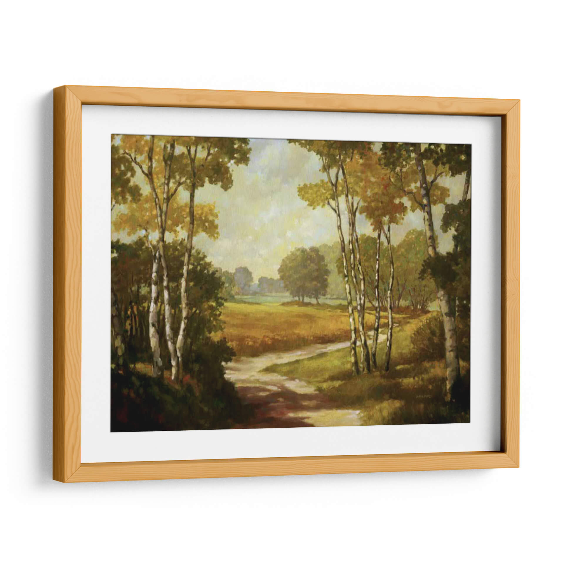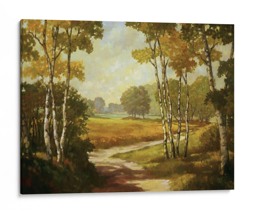 Emb uevo en un viaje visual con "Country Walk I", una obra de arte cautivadora del artista Graham Reynolds que evoca la serenidad y la belleza de un paseo otoñal. Este cuadro decorativo captura la esencia de un camino rural serpenteante que atraviesa un campo dorado, flanqueado por esbeltos abedules y exuberante vegetación. La paleta de colores, dominada por tonos tierra cálidos y ocres vibrantes, junto con sutiles toques de verde y azul pálido en el cielo, crea una atmósfera de tranquilidad y nostalgia. El estilo impresionista de Reynolds, con pinceladas sueltas y una magistral captura de la luz, da vida a la escena, invitando al espectador a sumergirse en su atmósfera pacífica. La composición, que guía la mirada hacia el horizonte, genera una sensación de profundidad y perspectiva, haciendo de esta pieza un punto focal ideal para cualquier espacio. "Country Walk I" es perfecto para añadir un toque de naturaleza y calma a tu sala de estar, dormitorio u oficina, transformando cualquier ambiente en un refugio de paz y belleza natural.