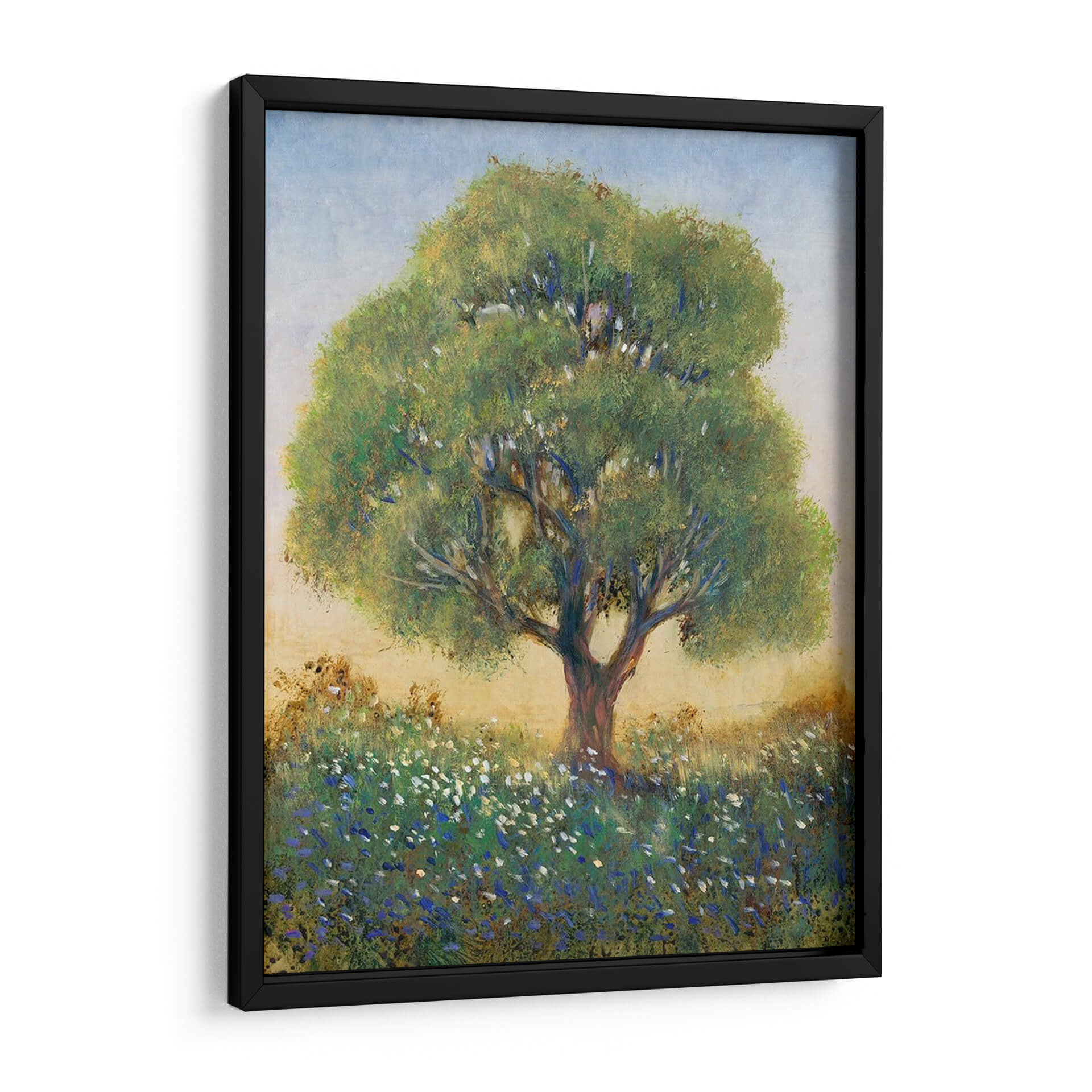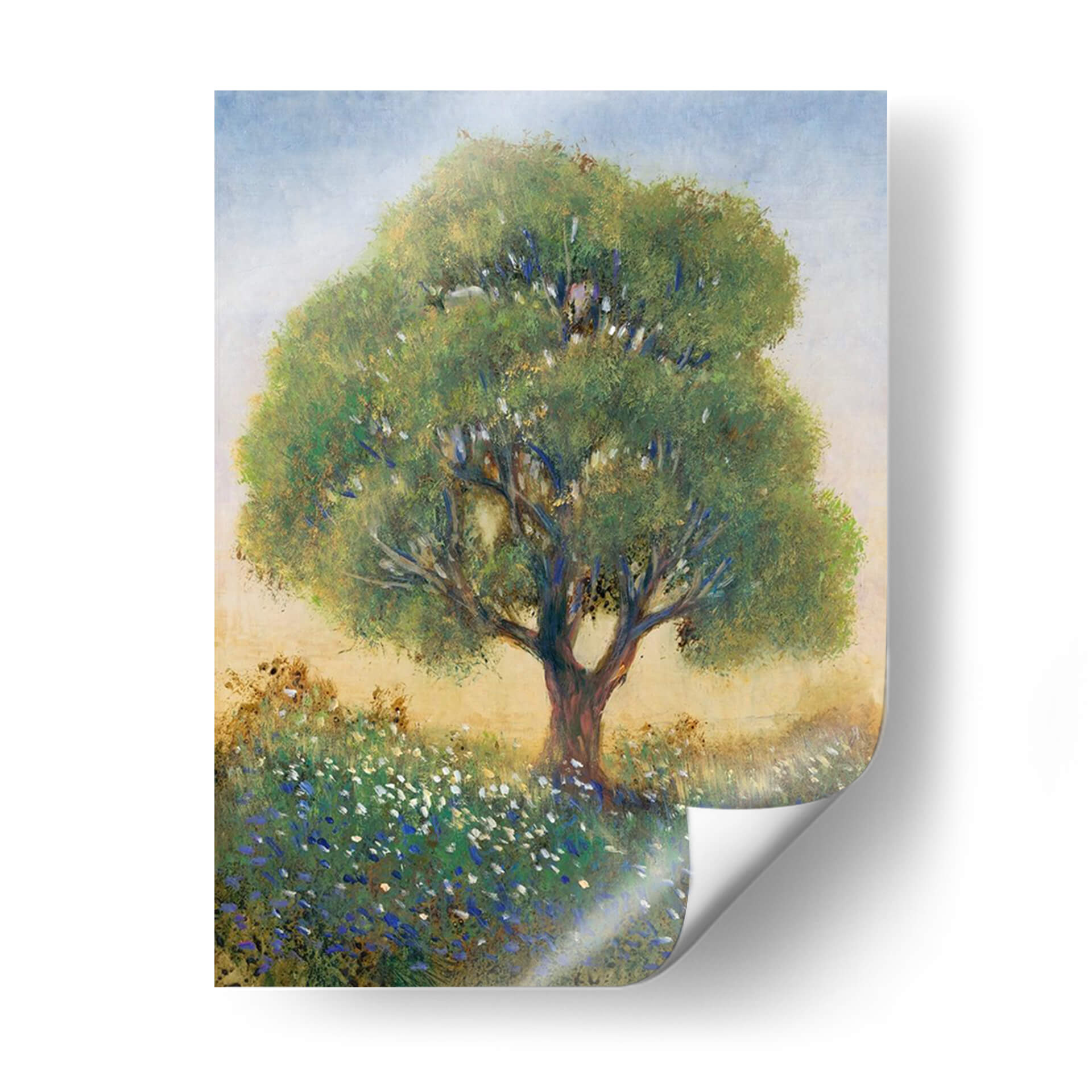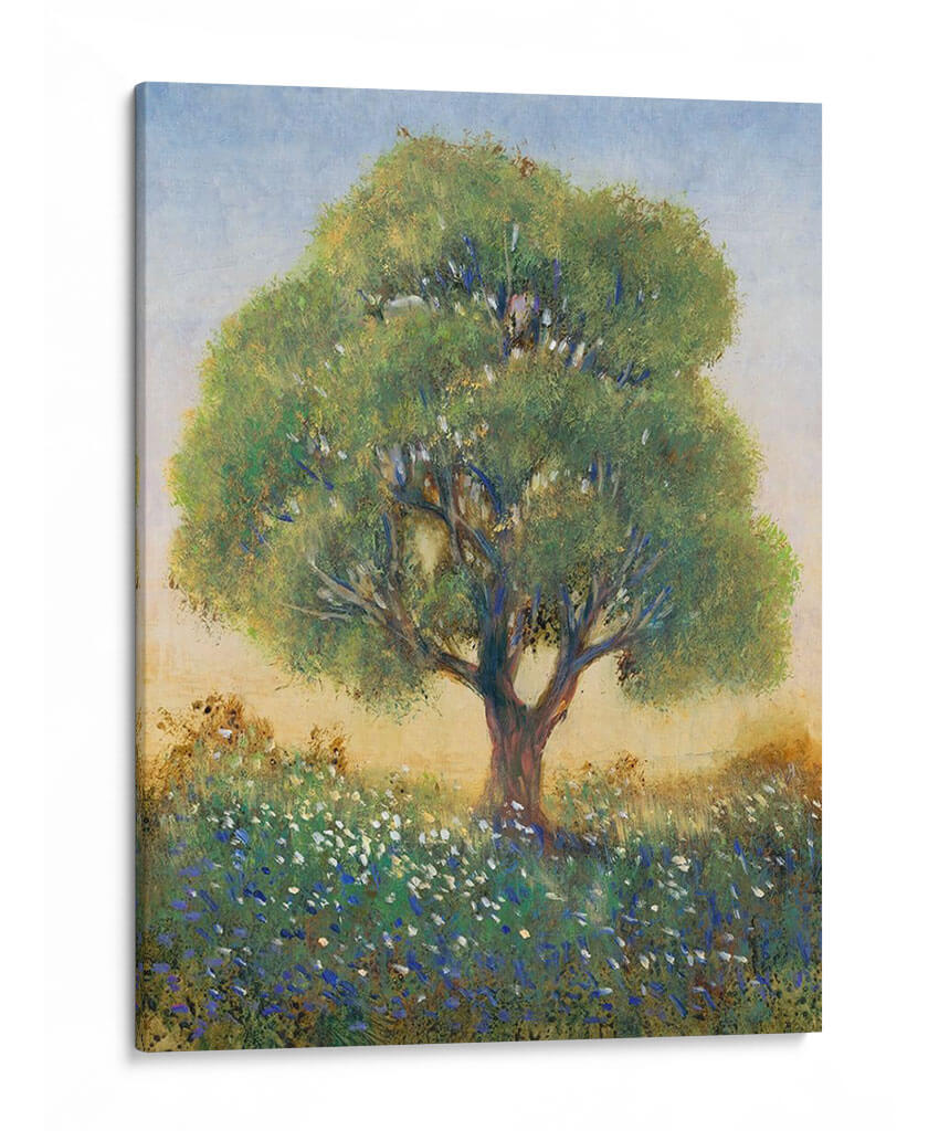 Sumérgete en la serenidad campestre con "De Pie En El Campo I" de Tim O'Toole, una obra de arte que captura la esencia de un día apacible en la naturaleza. Este cuadro decorativo presenta un majestuoso árbol solitario erguido en medio de un campo florecido, sus ramas frondosas se extienden hacia un cielo azul pálido y brumoso. La paleta de colores, dominada por verdes vibrantes, azules celestes y toques de blanco y amarillo terroso, crea una atmósfera de tranquilidad y conexión con la tierra. El estilo impresionista del artista se manifiesta en las pinceladas sueltas y la forma en que la luz interactúa con el follaje y las flores silvestres, aportando una sensación etérea y soñadora. Las pequeñas flores azules y blancas salpicadas en la hierba añaden un detalle encantador, invitando a la contemplación. Este cuadro es perfecto para infundir calma y belleza natural en tu sala de estar, dormitorio o cualquier espacio que necesite un respiro visual. "De Pie En El Campo I" no es solo una pieza decorativa, sino una ventana a la paz del campo, ideal para quienes buscan arte que evoque emociones de serenidad y contemplación. Transforma tu hogar en un santuario de paz con esta evocadora obra de arte.