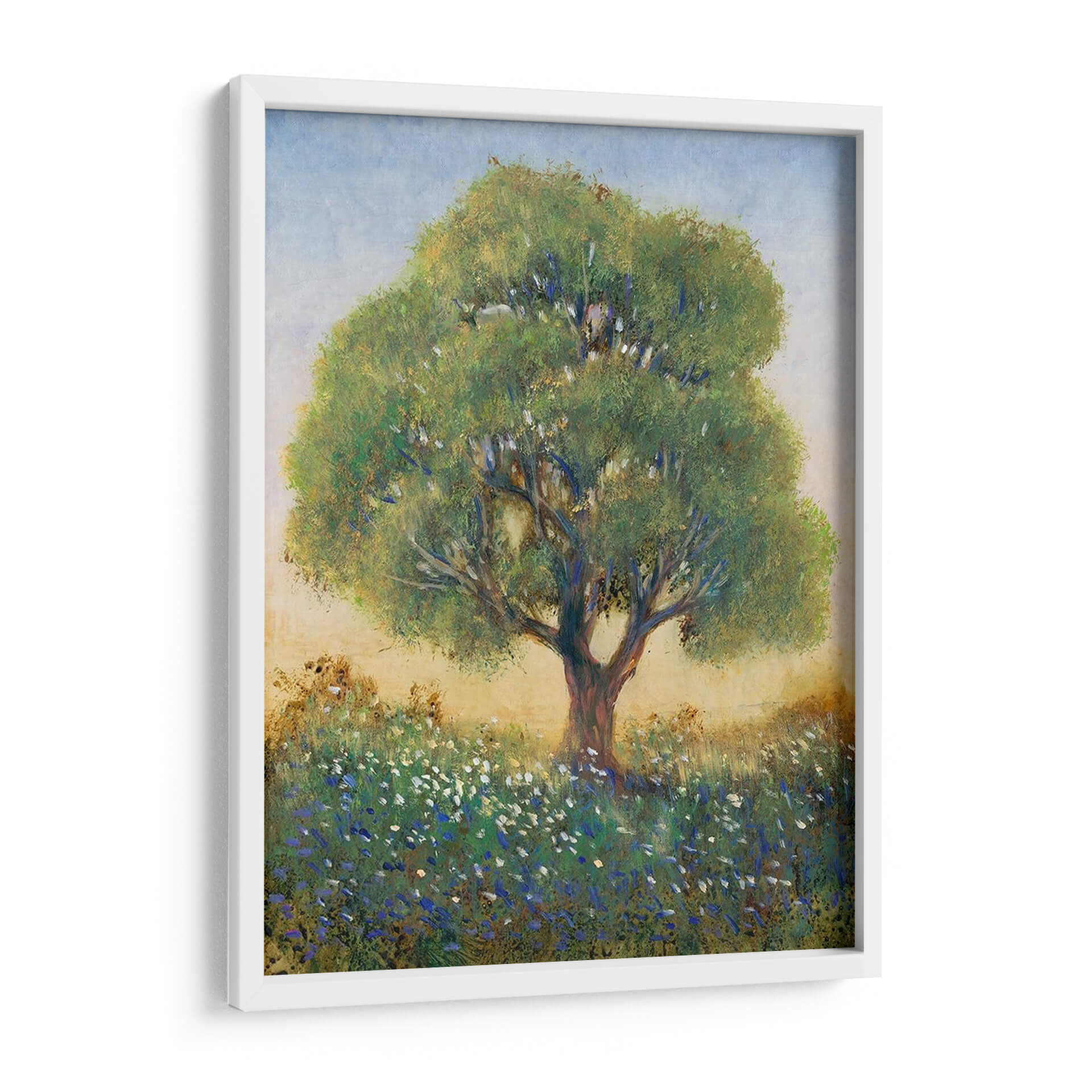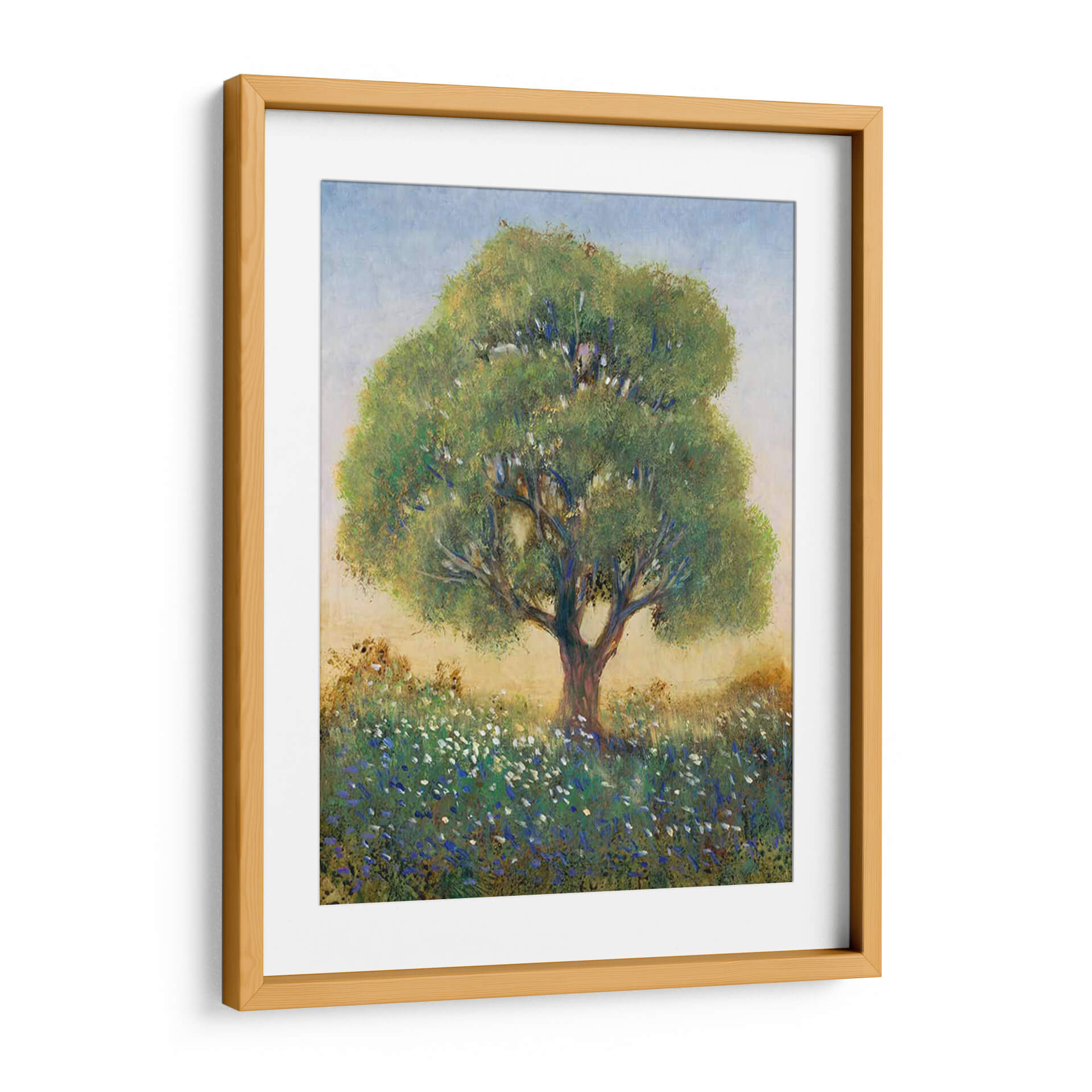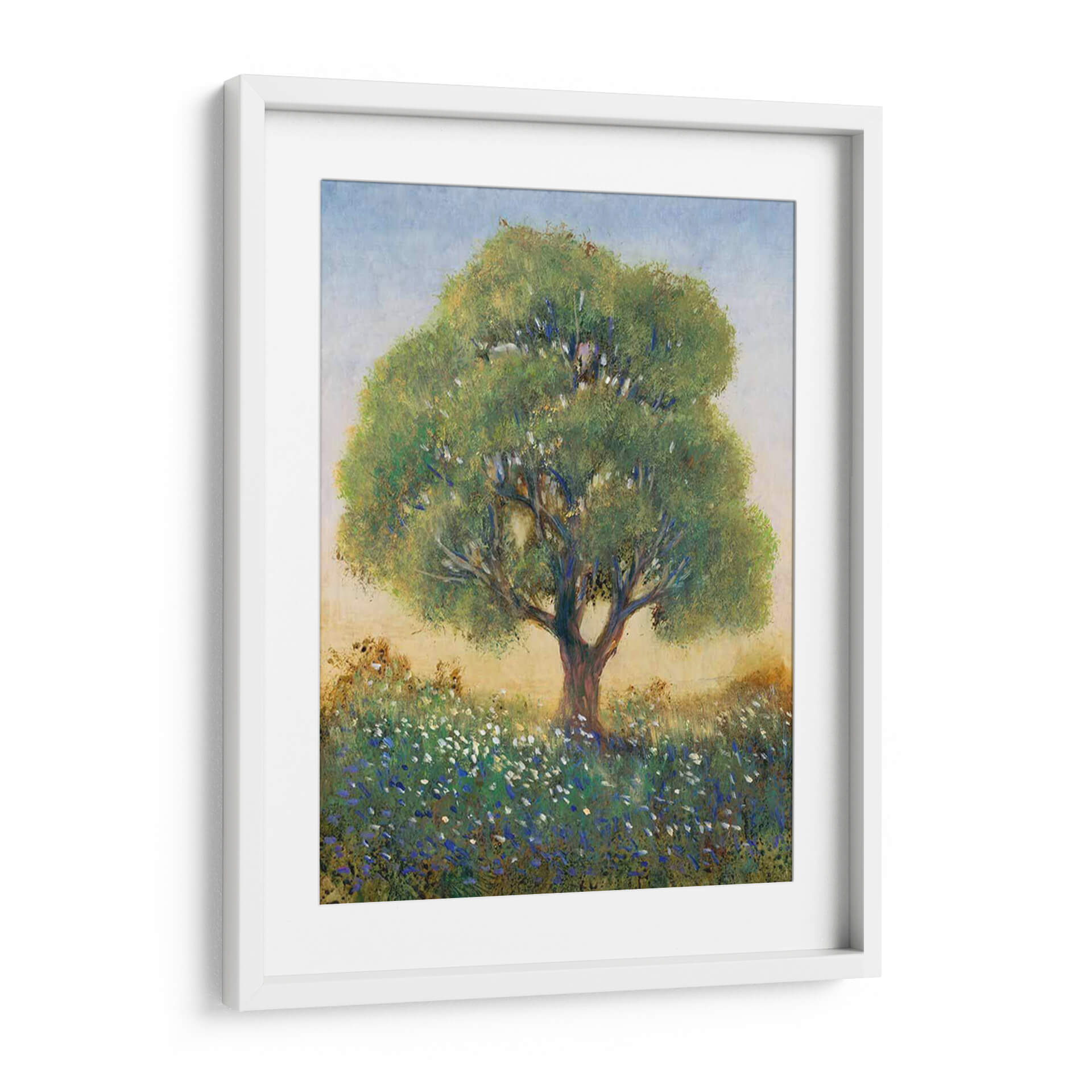 Sumérgete en la serenidad campestre con "De Pie En El Campo I" de Tim O'Toole, una obra de arte que captura la esencia de un día apacible en la naturaleza. Este cuadro decorativo presenta un majestuoso árbol solitario erguido en medio de un campo florecido, sus ramas frondosas se extienden hacia un cielo azul pálido y brumoso. La paleta de colores, dominada por verdes vibrantes, azules celestes y toques de blanco y amarillo terroso, crea una atmósfera de tranquilidad y conexión con la tierra. El estilo impresionista del artista se manifiesta en las pinceladas sueltas y la forma en que la luz interactúa con el follaje y las flores silvestres, aportando una sensación etérea y soñadora. Las pequeñas flores azules y blancas salpicadas en la hierba añaden un detalle encantador, invitando a la contemplación. Este cuadro es perfecto para infundir calma y belleza natural en tu sala de estar, dormitorio o cualquier espacio que necesite un respiro visual. "De Pie En El Campo I" no es solo una pieza decorativa, sino una ventana a la paz del campo, ideal para quienes buscan arte que evoque emociones de serenidad y contemplación. Transforma tu hogar en un santuario de paz con esta evocadora obra de arte.