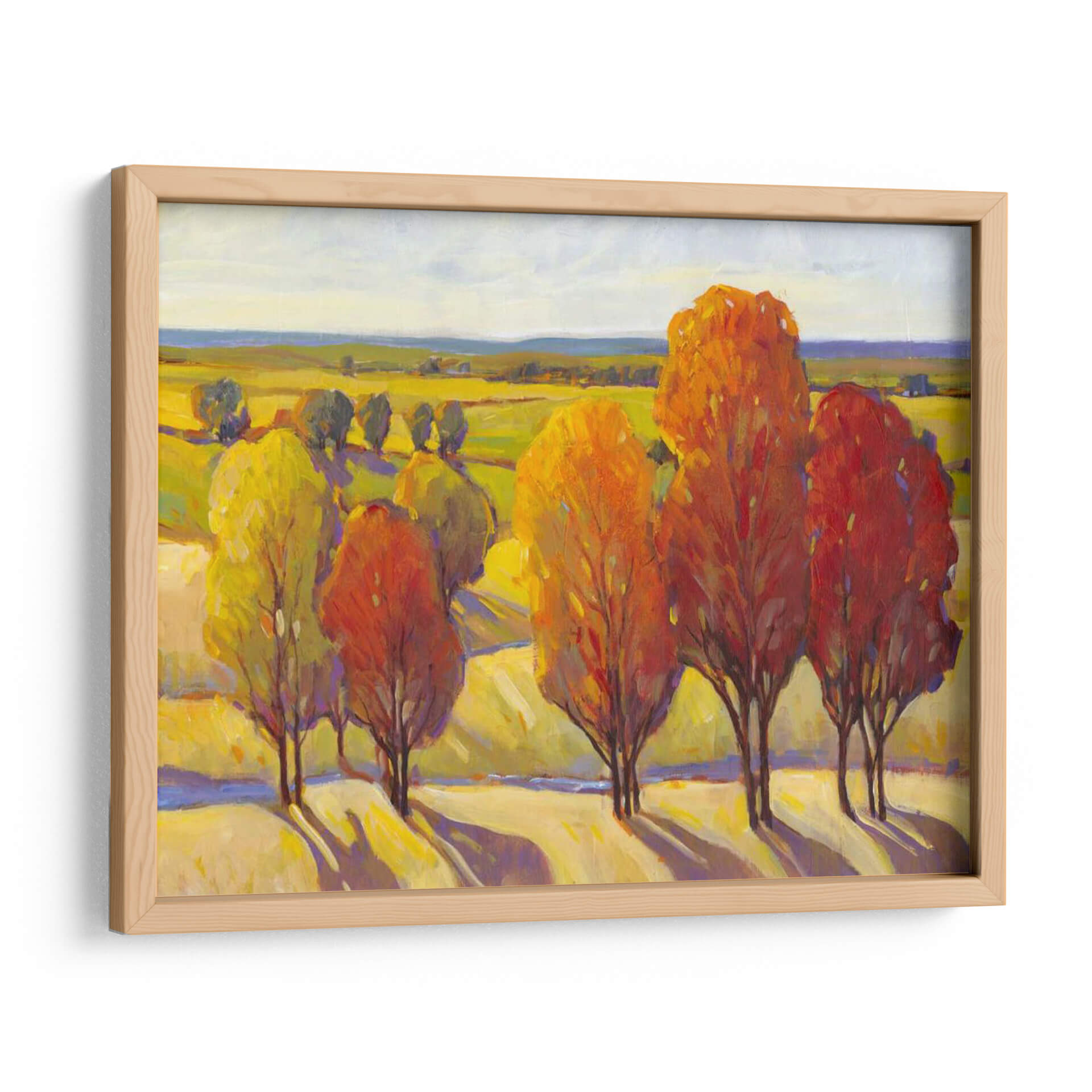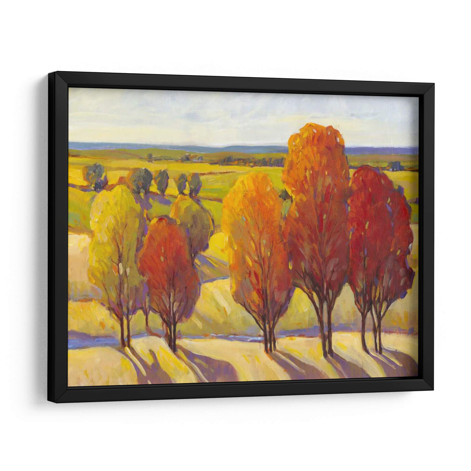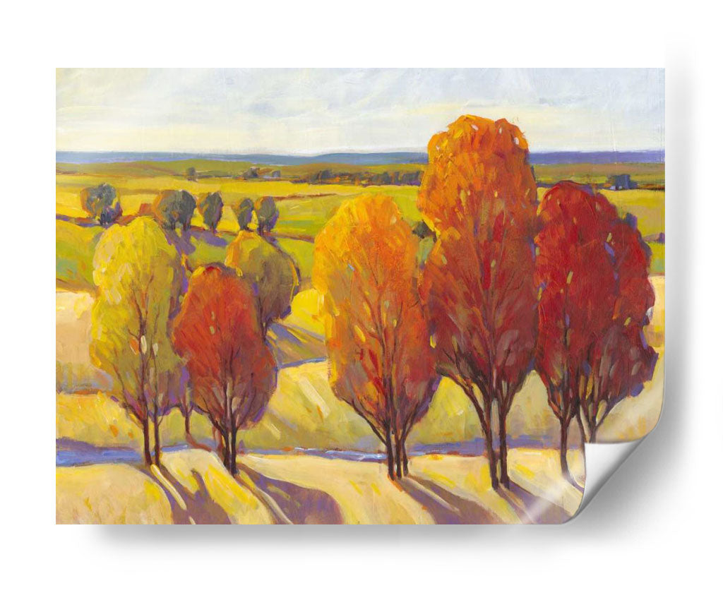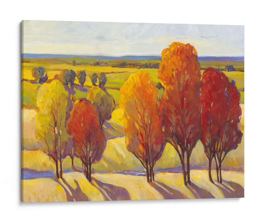 Sumérgete en la calidez y la vitalidad de "Día Resplandor I", una obra de arte contemporáneo que captura la esencia del otoño con una explosión de colores vibrantes. Este cuadro decorativo presenta un paisaje rural bañado por la luz dorada de una tarde soleada, donde los árboles se alzan con sus copas teñidas de ocres, naranjas intensos y rojos profundos. La pincelada audaz y expresiva del artista Tim O'Toole da vida a cada elemento, desde las formas suaves de las colinas hasta las sombras alargadas que se proyectan sobre el terreno, creando una sensación de profundidad y movimiento. La paleta de colores, dominada por tonos tierra cálidos y acentos de azul cielo, evoca una atmósfera de serenidad y optimismo. "Día Resplandor I" es la pieza perfecta para añadir un toque de naturaleza y energía a tu hogar u oficina, transformando cualquier espacio en un refugio acogedor y lleno de luz. Ideal para salones modernos, recibidores o estudios que buscan una inyección de color y una conexión con la belleza del paisaje otoñal. Un cuadro que inspira contemplación y renueva el espíritu.